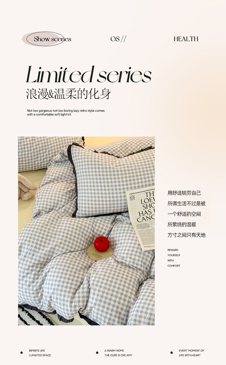 商品名称:凯洛奇 2025新款1法式小清新蕾丝花边水洗棉四件套-风格二【提供买家秀】 皱皱纱花边-蓝小格