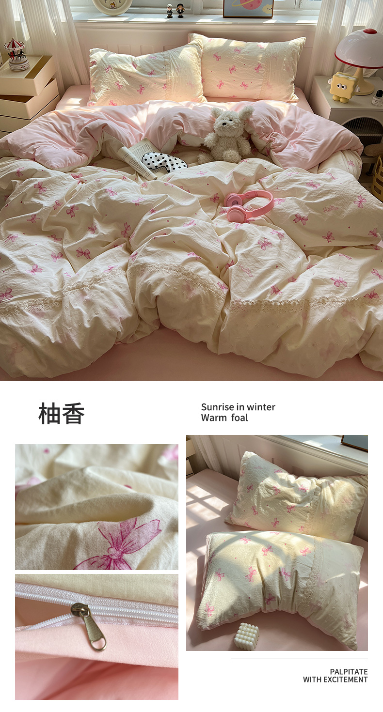 商品名称:韩都家居 2025春夏新款蕾丝花边云感双层纱四件套 柚香