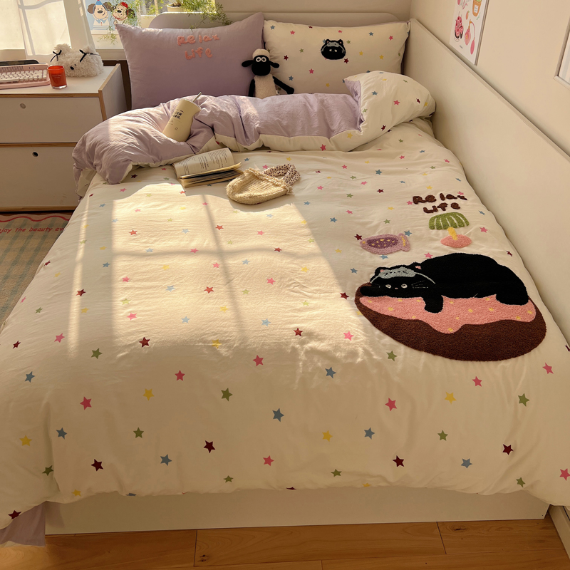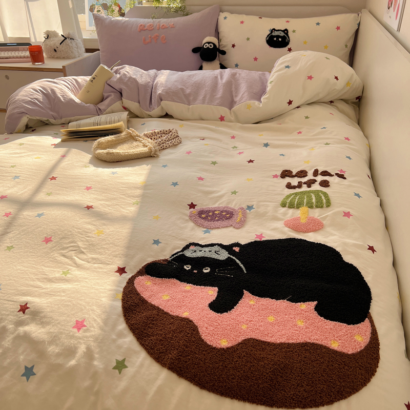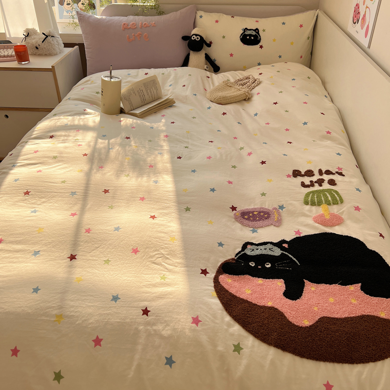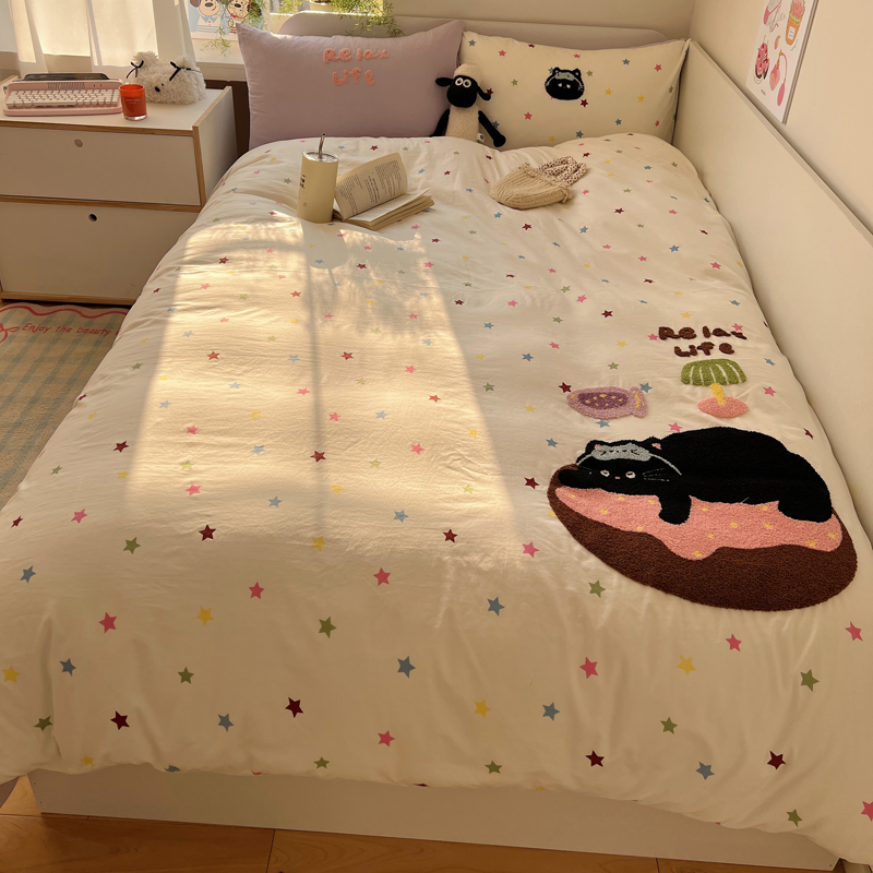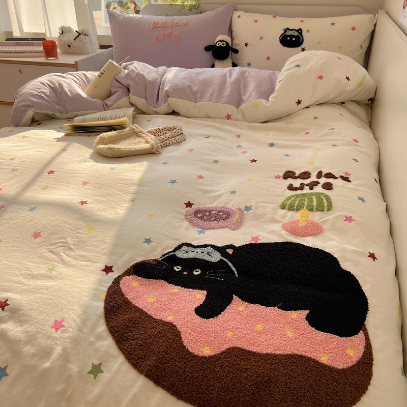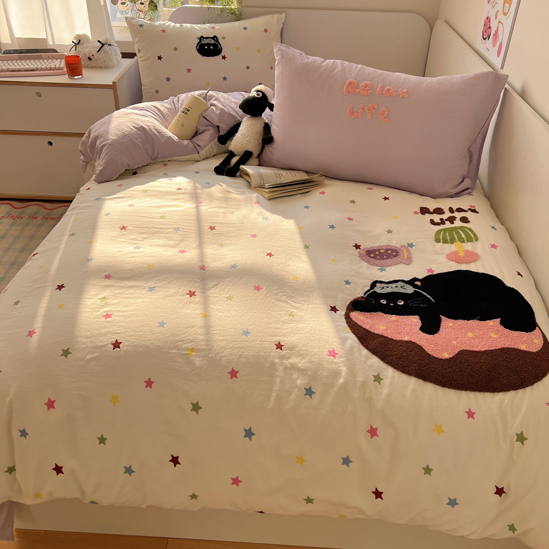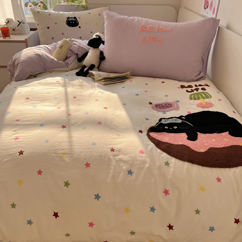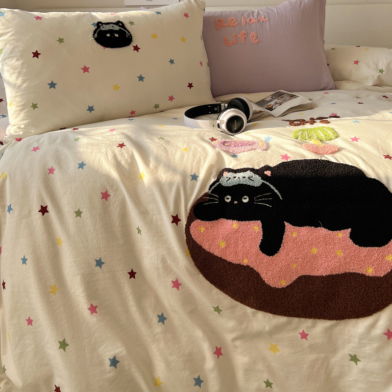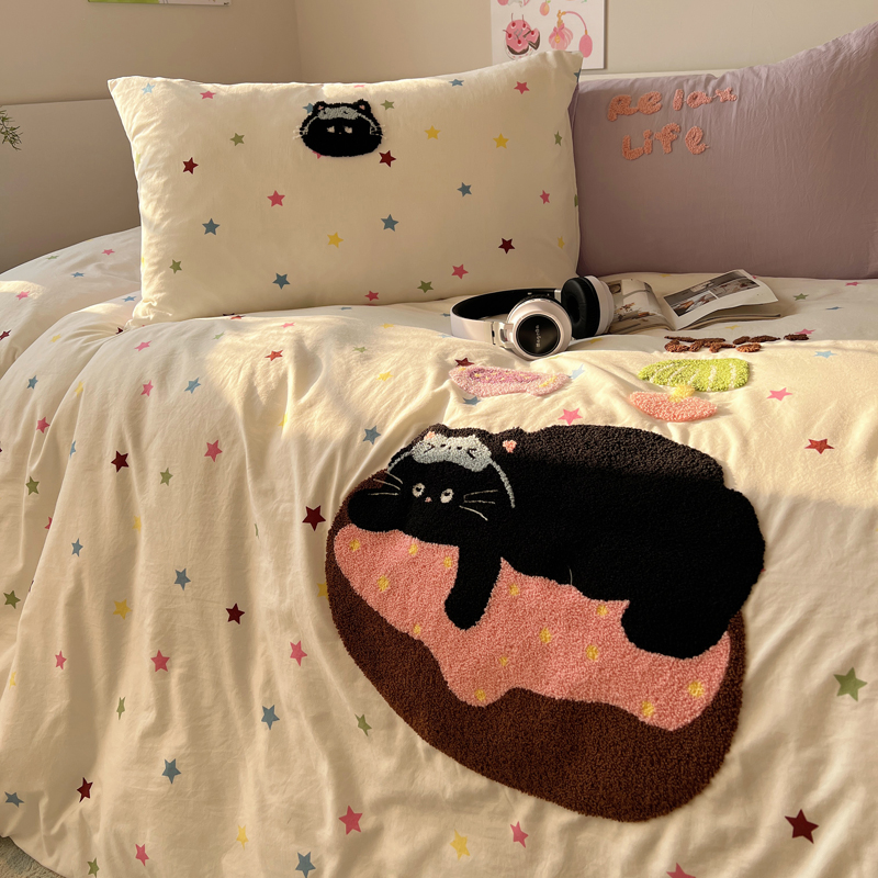 商品名称:顾里家纺 2025新款ins韩系童趣毛巾绣云朵棉四件套 彩星黑猫