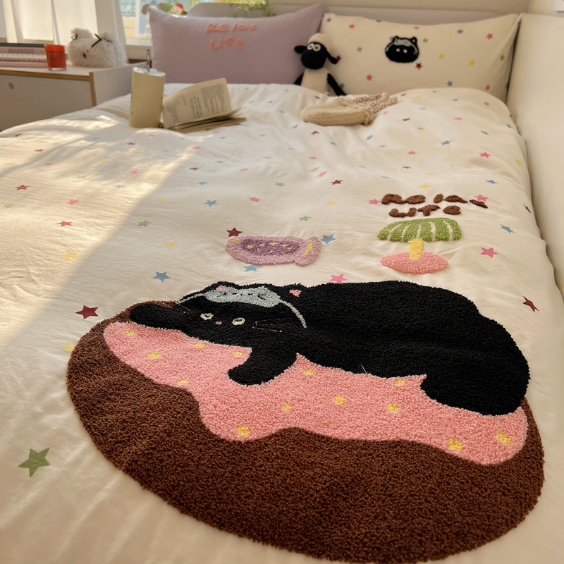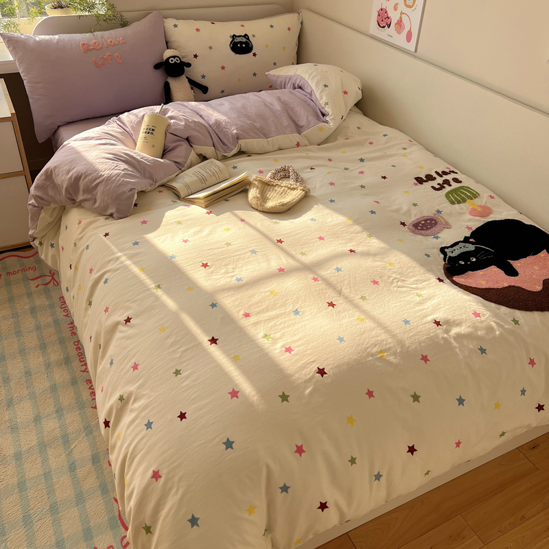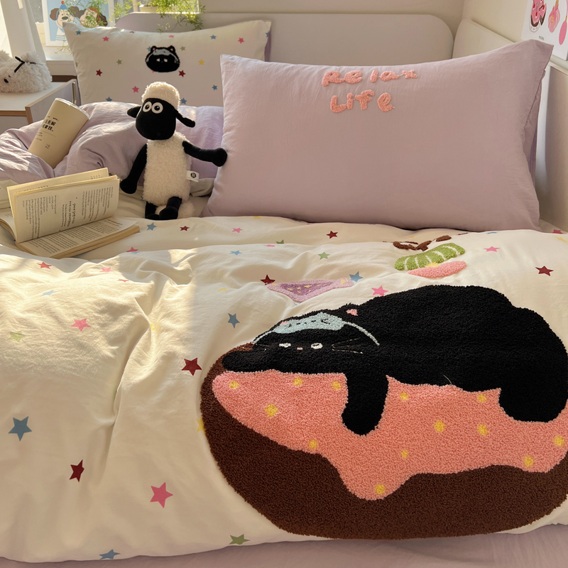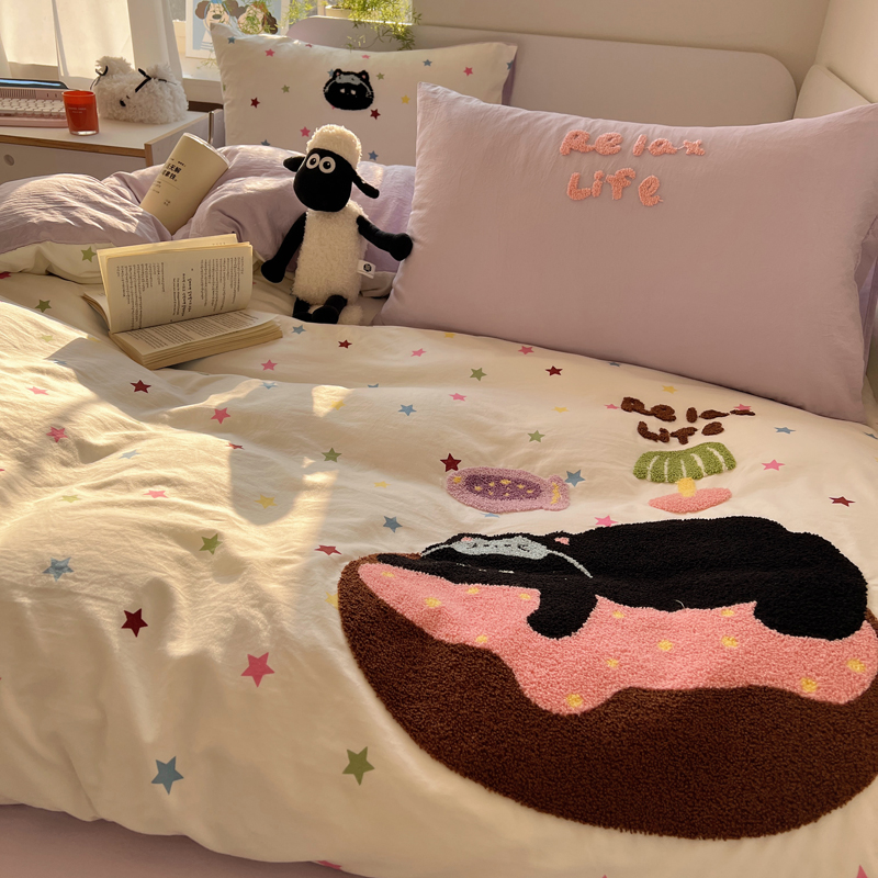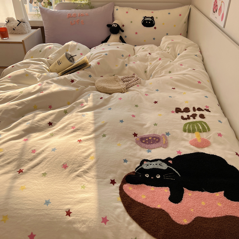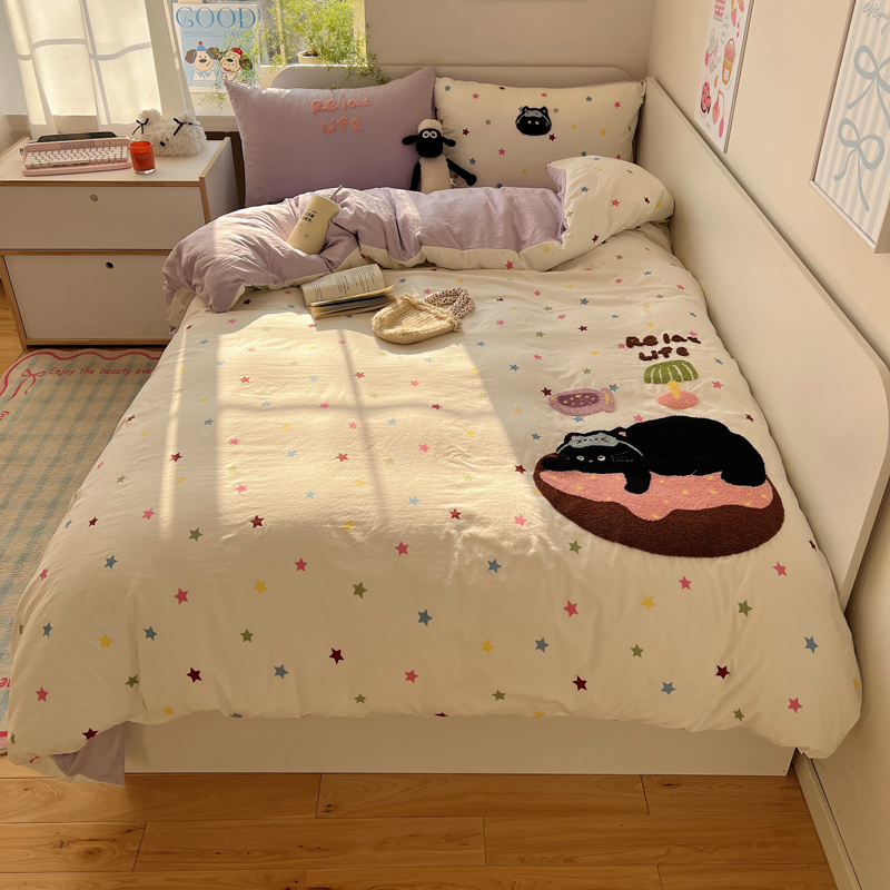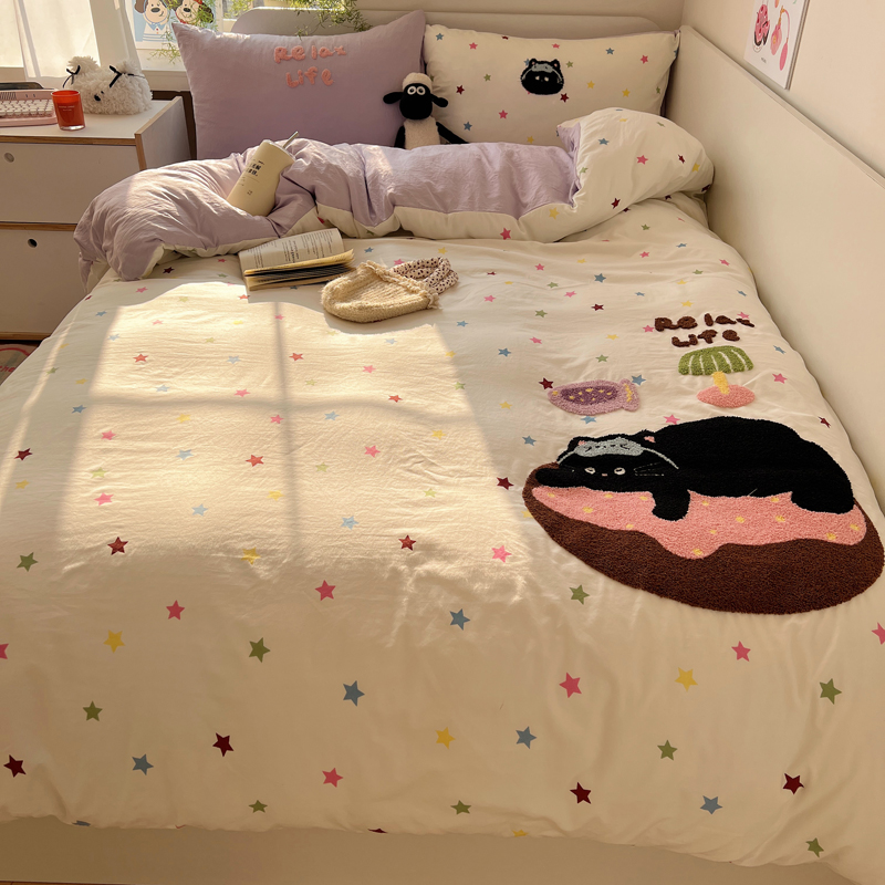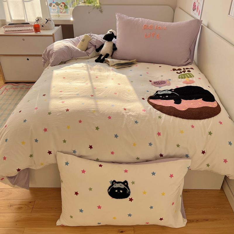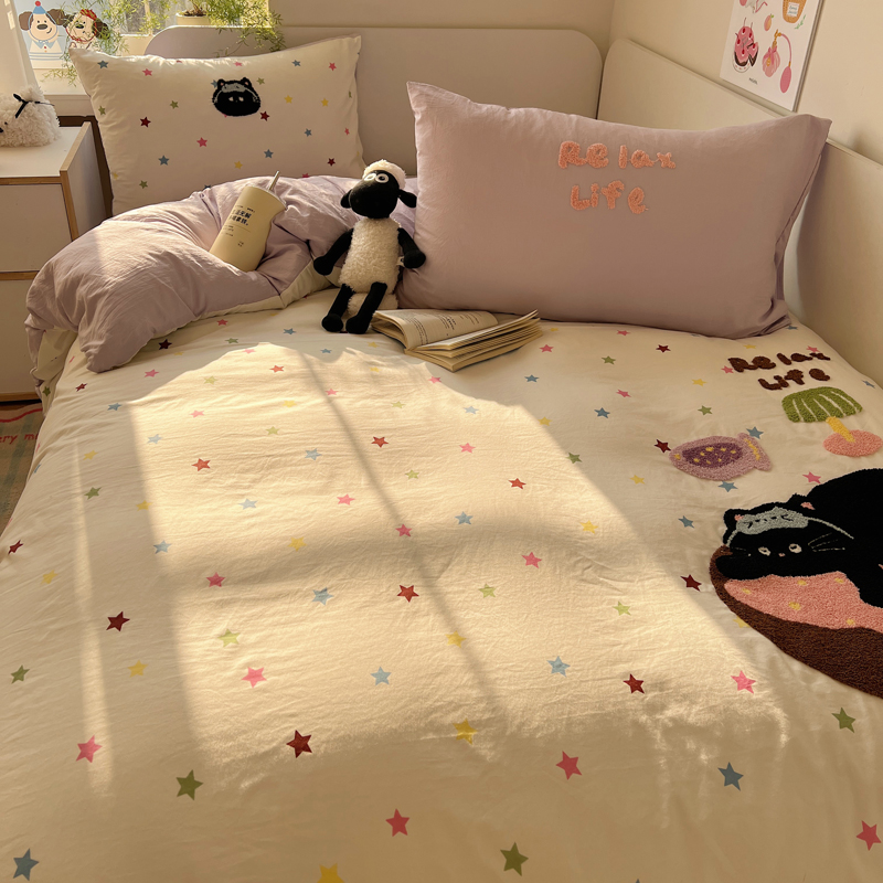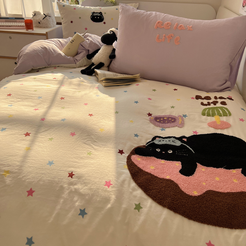 商品名称:顾里家纺 2025新款ins韩系童趣毛巾绣云朵棉四件套 彩星黑猫