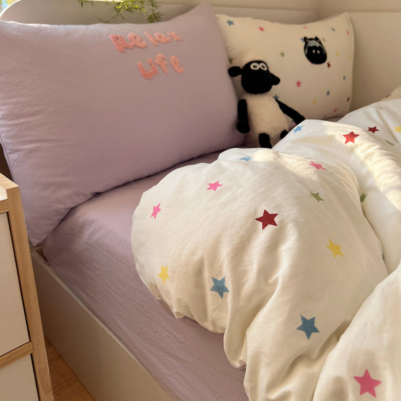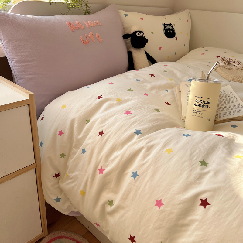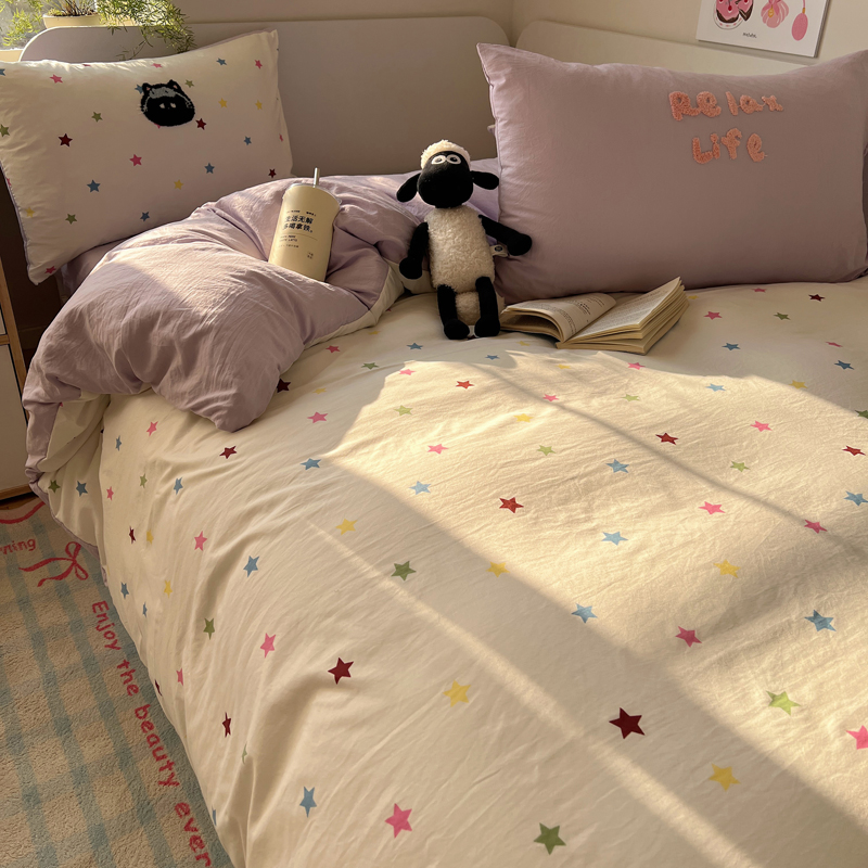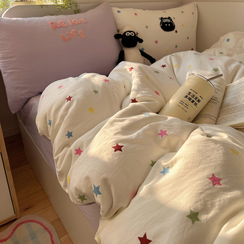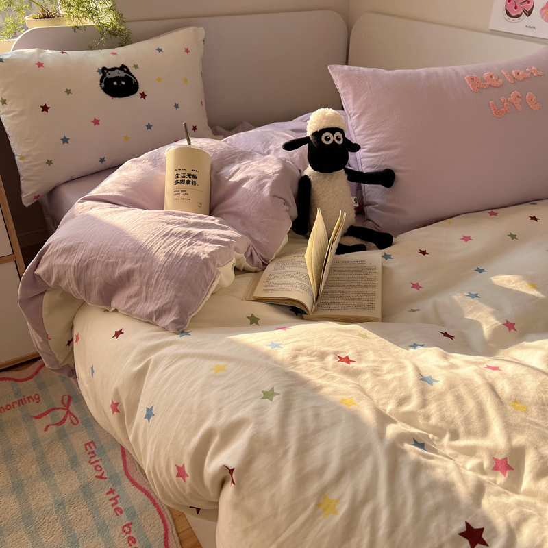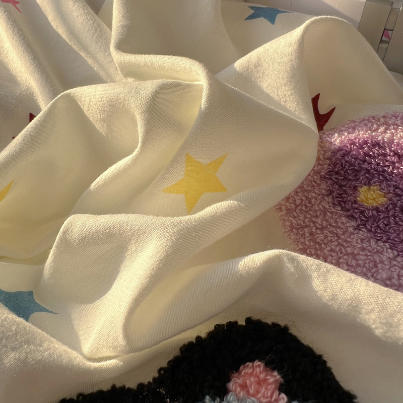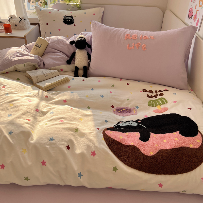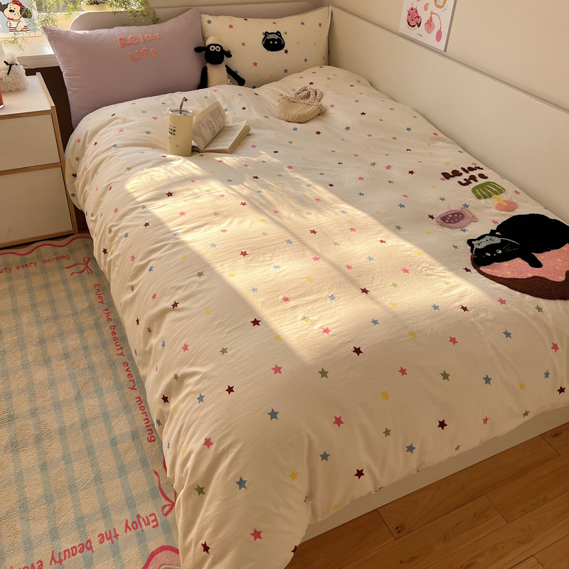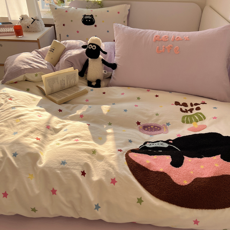 商品名称:顾里家纺 2025新款ins韩系童趣毛巾绣云朵棉四件套 彩星黑猫
