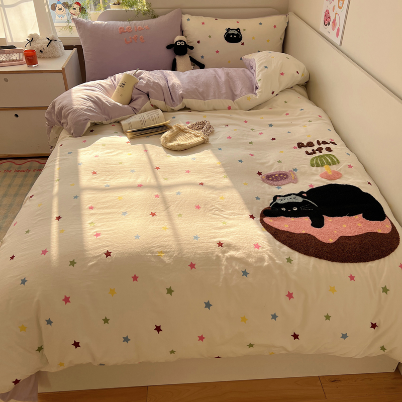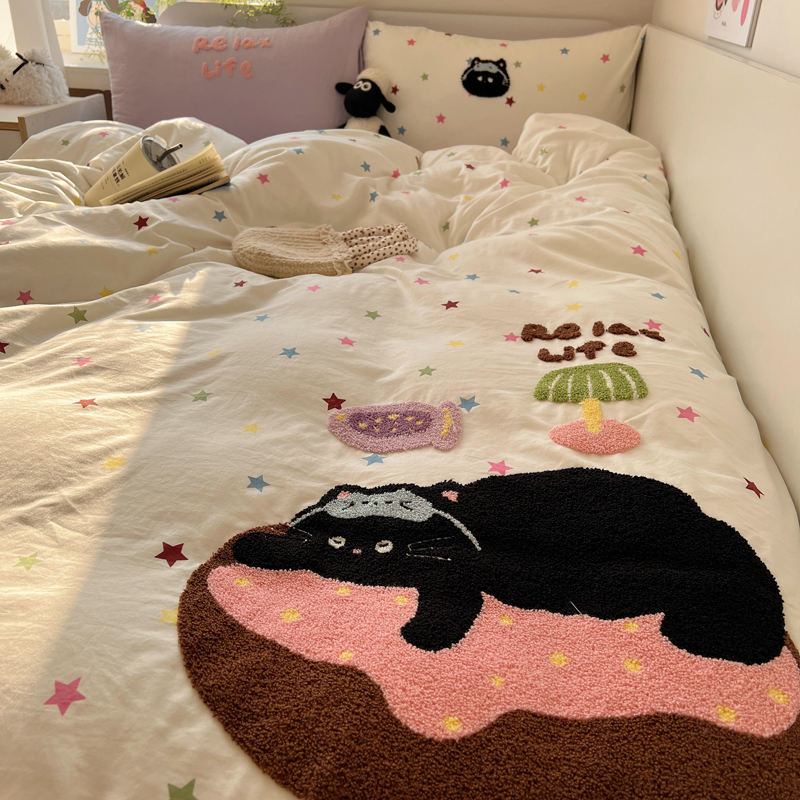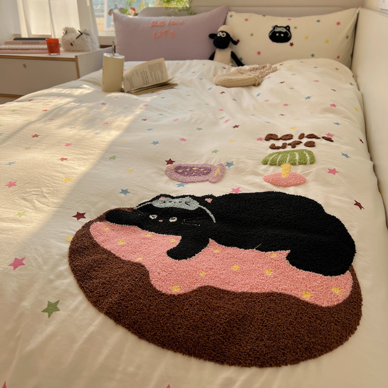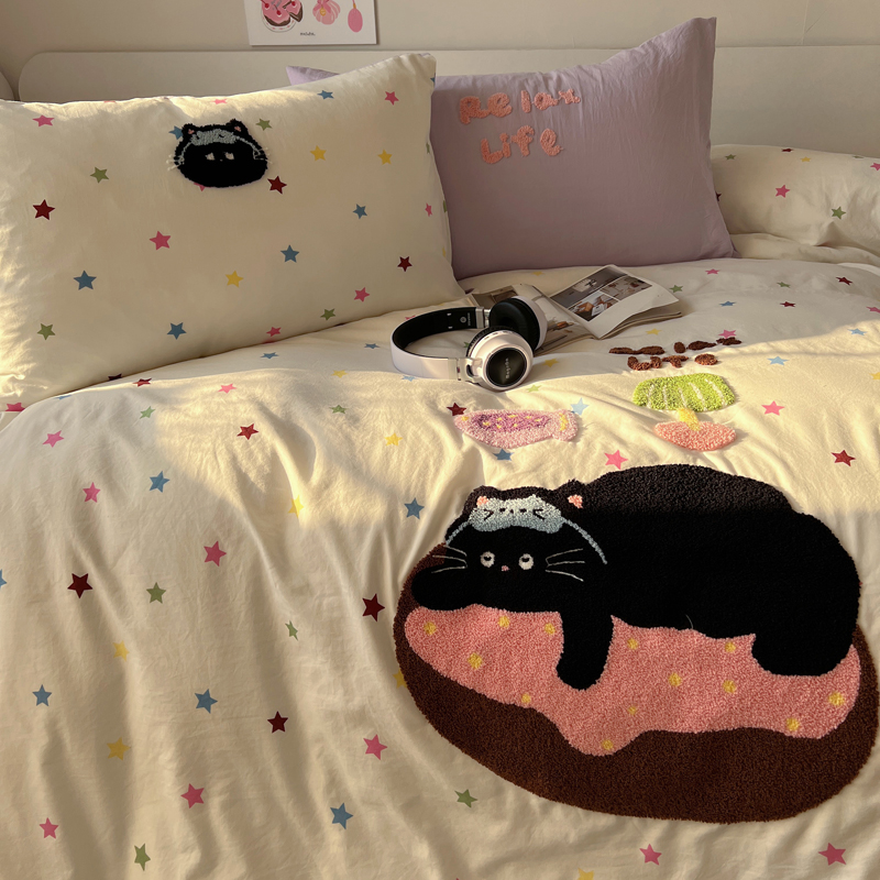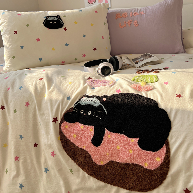 顾里家纺 2025新款ins韩系童趣毛巾绣云朵棉四件套 彩星黑猫