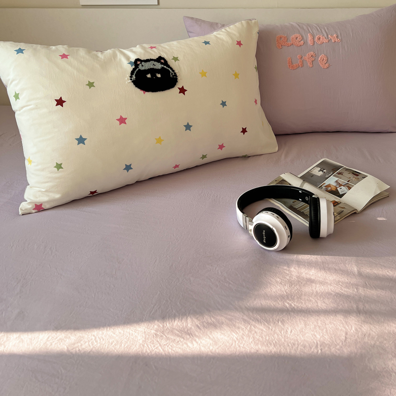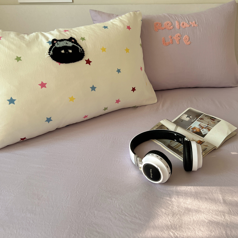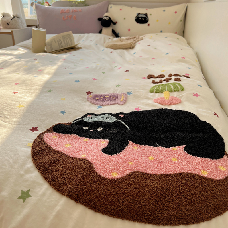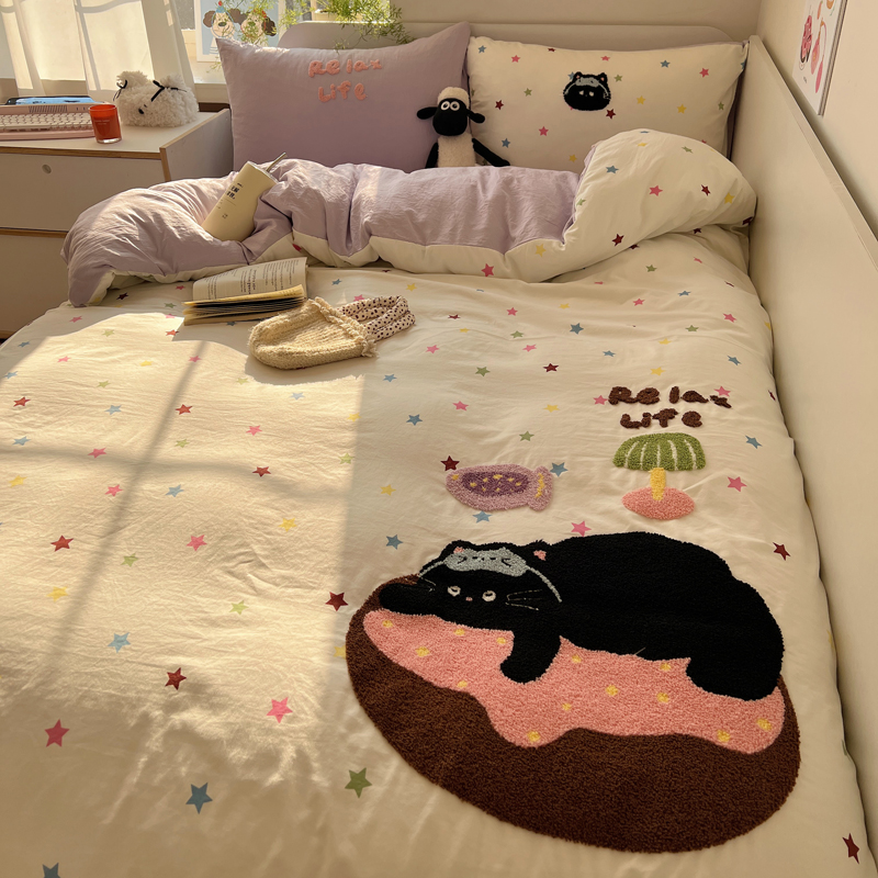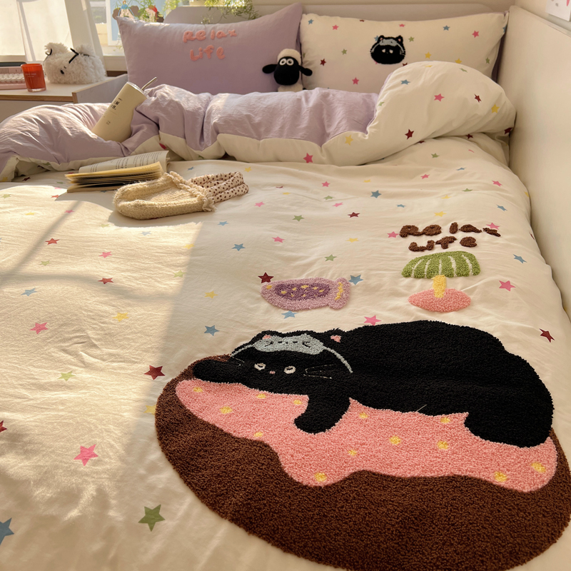 顾里家纺 2025新款ins韩系童趣毛巾绣云朵棉四件套 彩星黑猫
