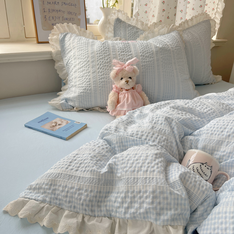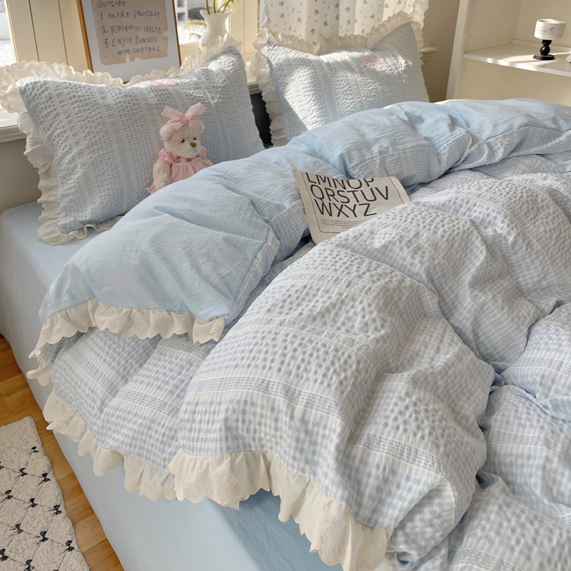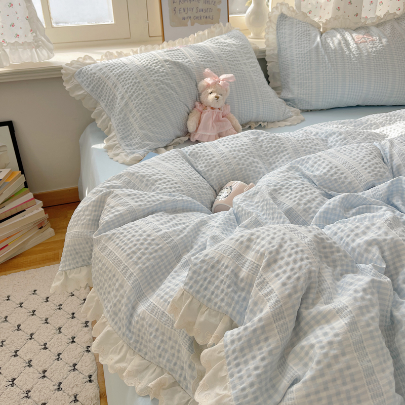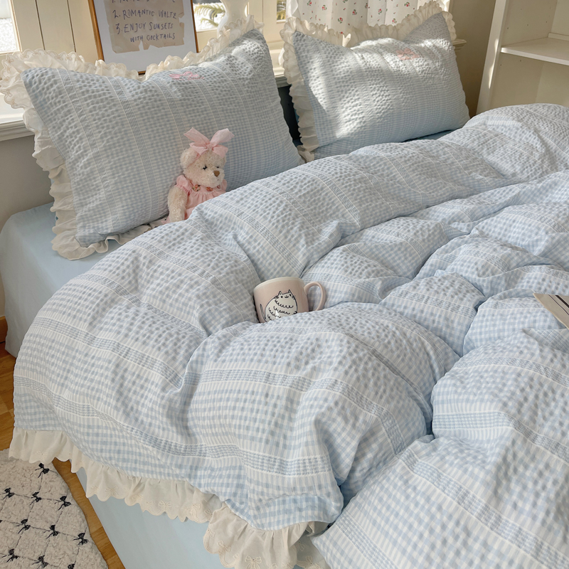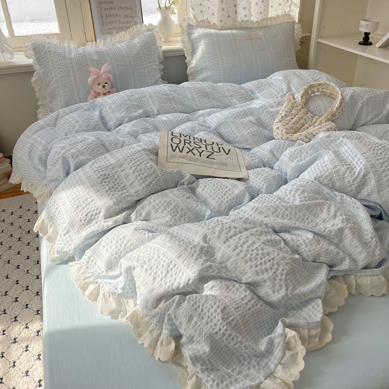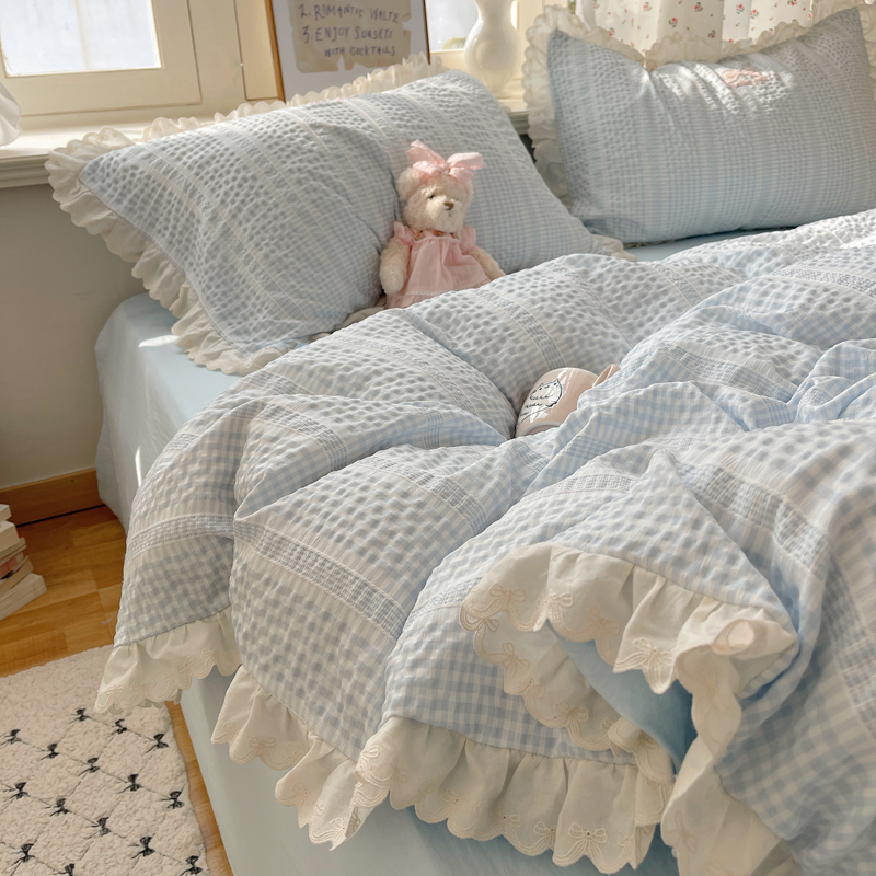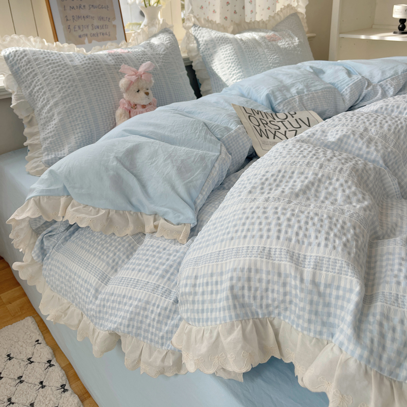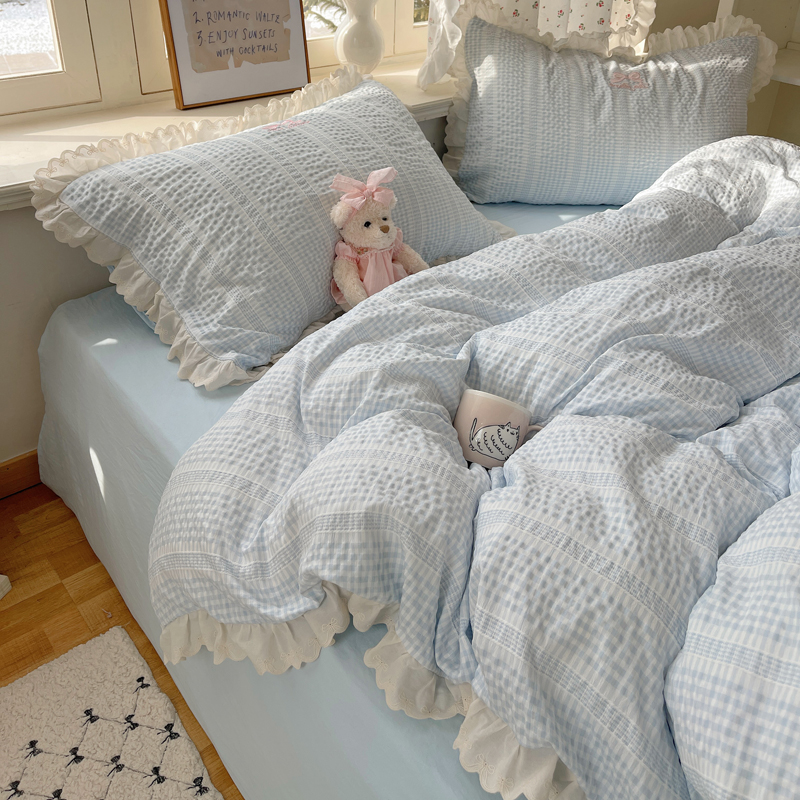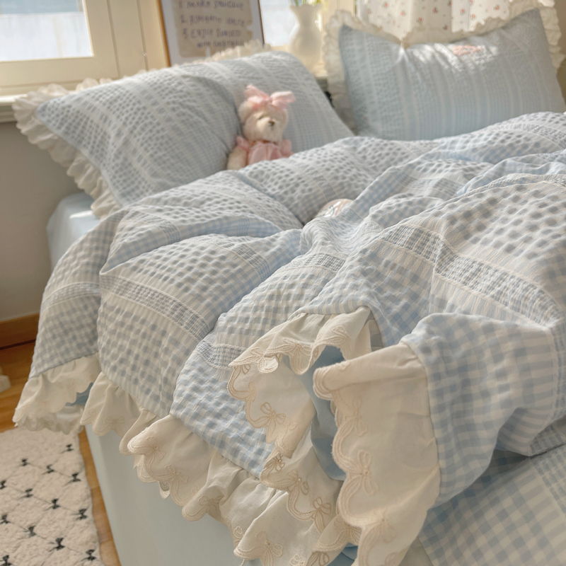 商品名称:轻奢坊 2025新款色织提花格子水洗棉仙仙花边安妮四件套 花边安妮-蓝