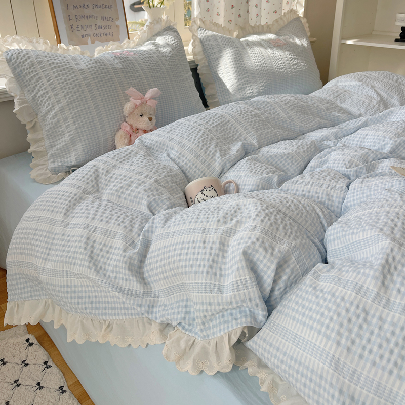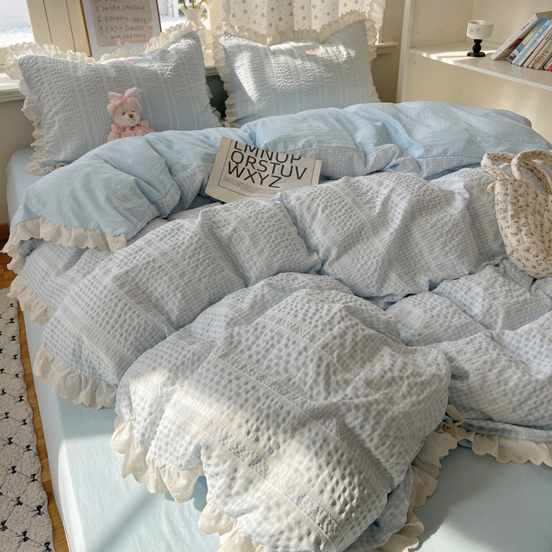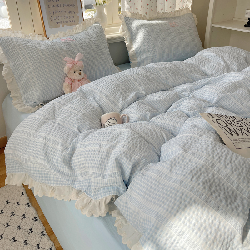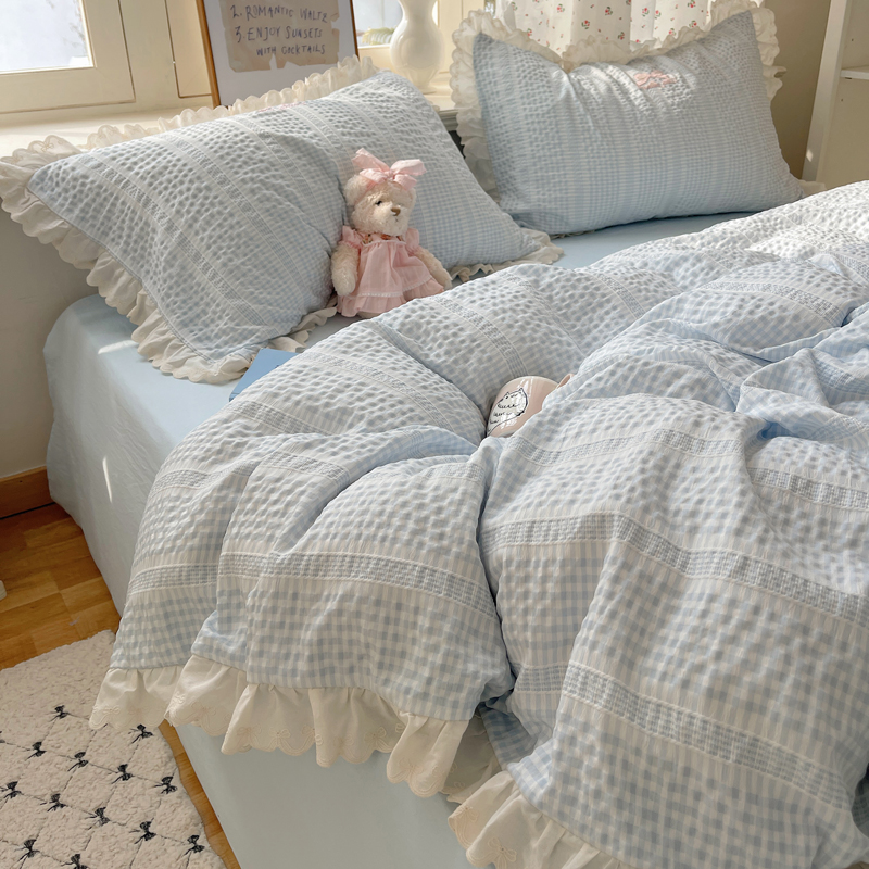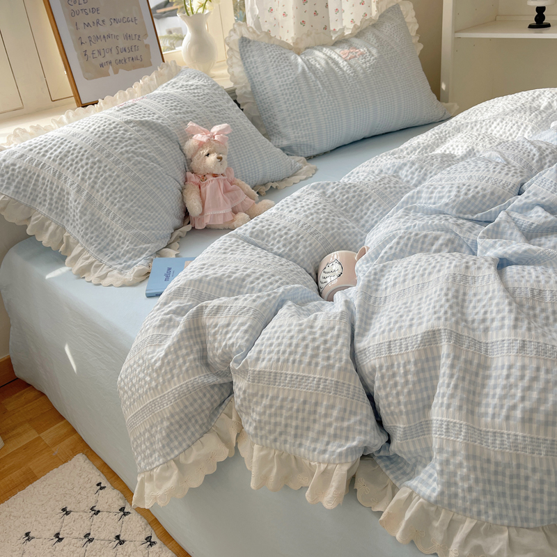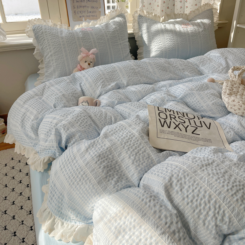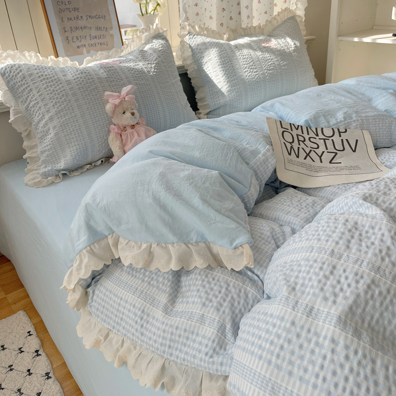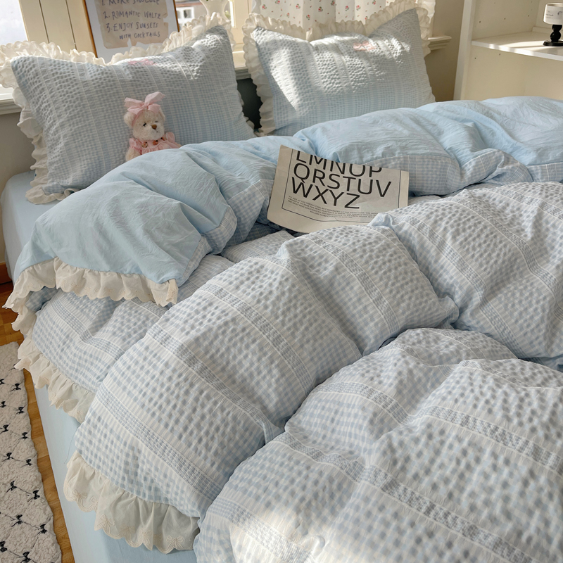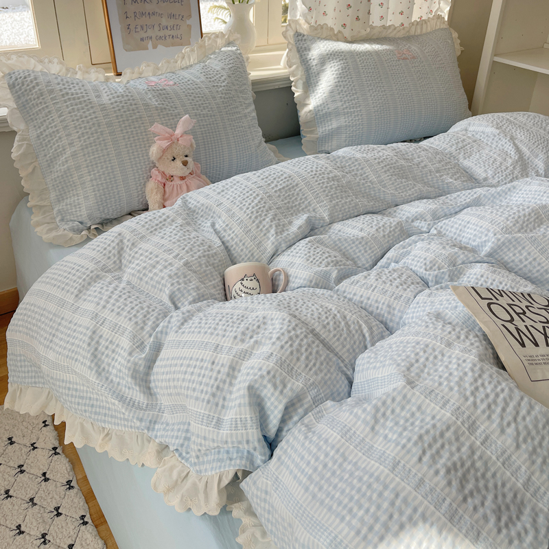 商品名称:轻奢坊 2025新款色织提花格子水洗棉仙仙花边安妮四件套 花边安妮-蓝