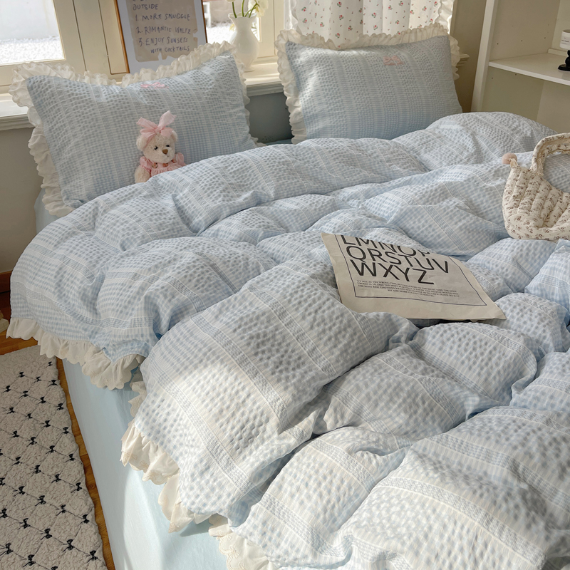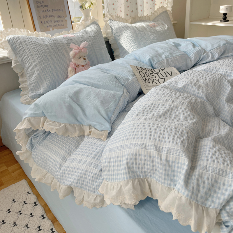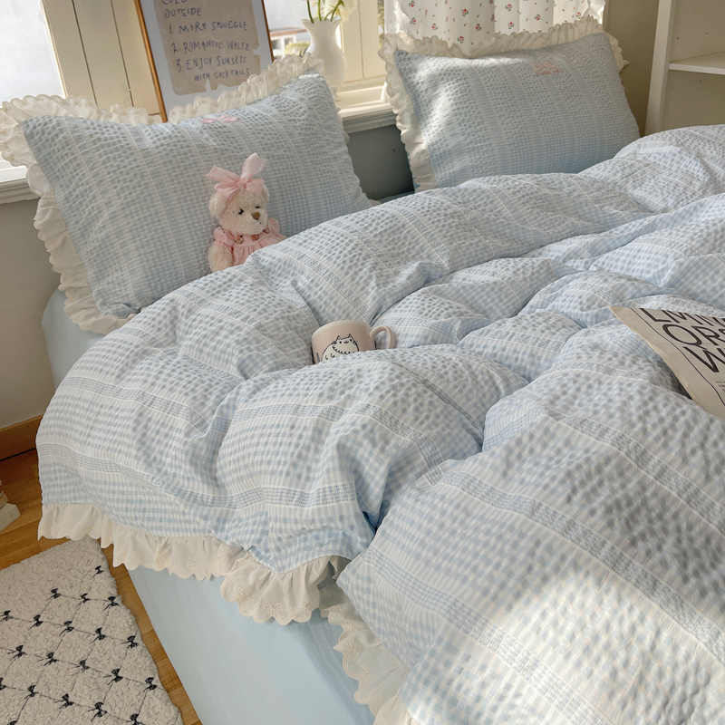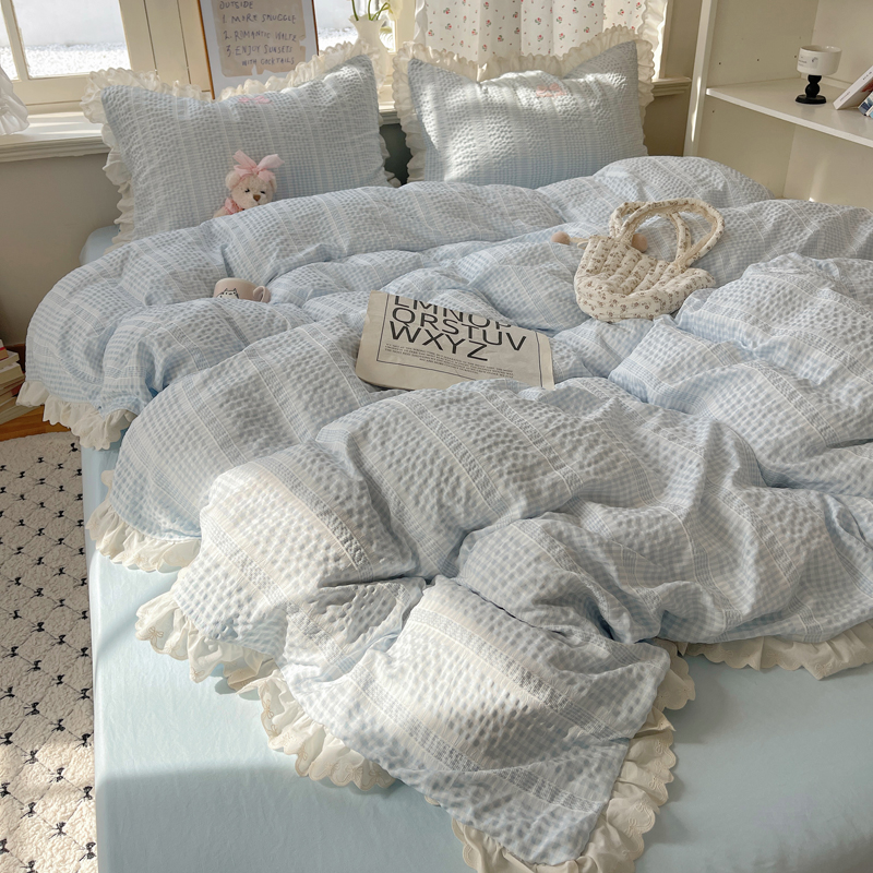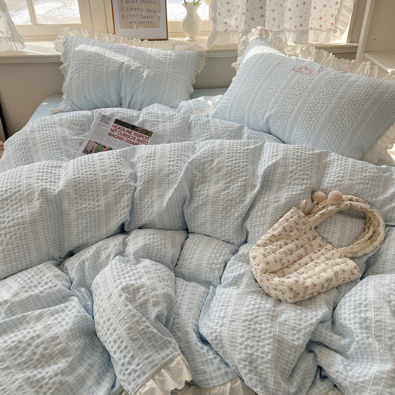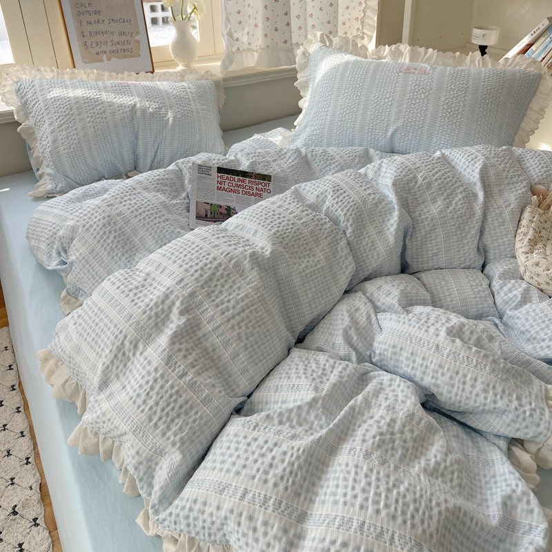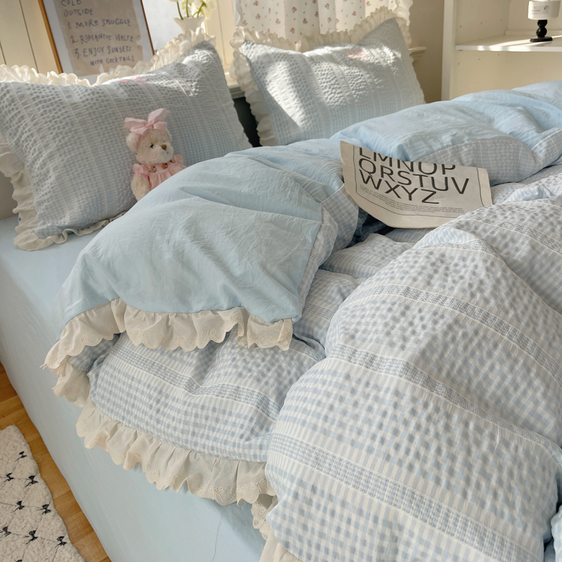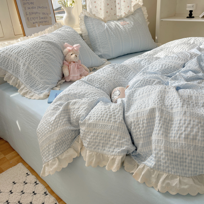 商品名称:轻奢坊 2025新款色织提花格子水洗棉仙仙花边安妮四件套 花边安妮-蓝
