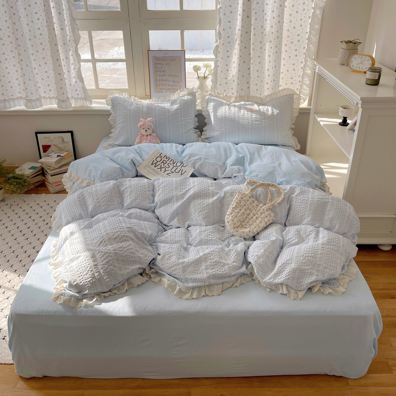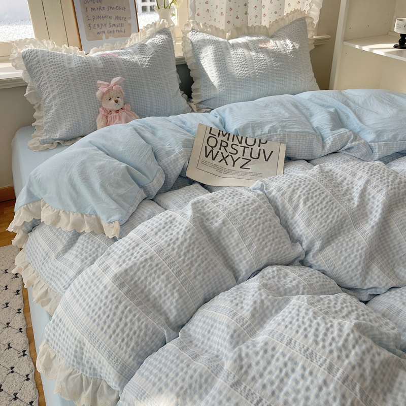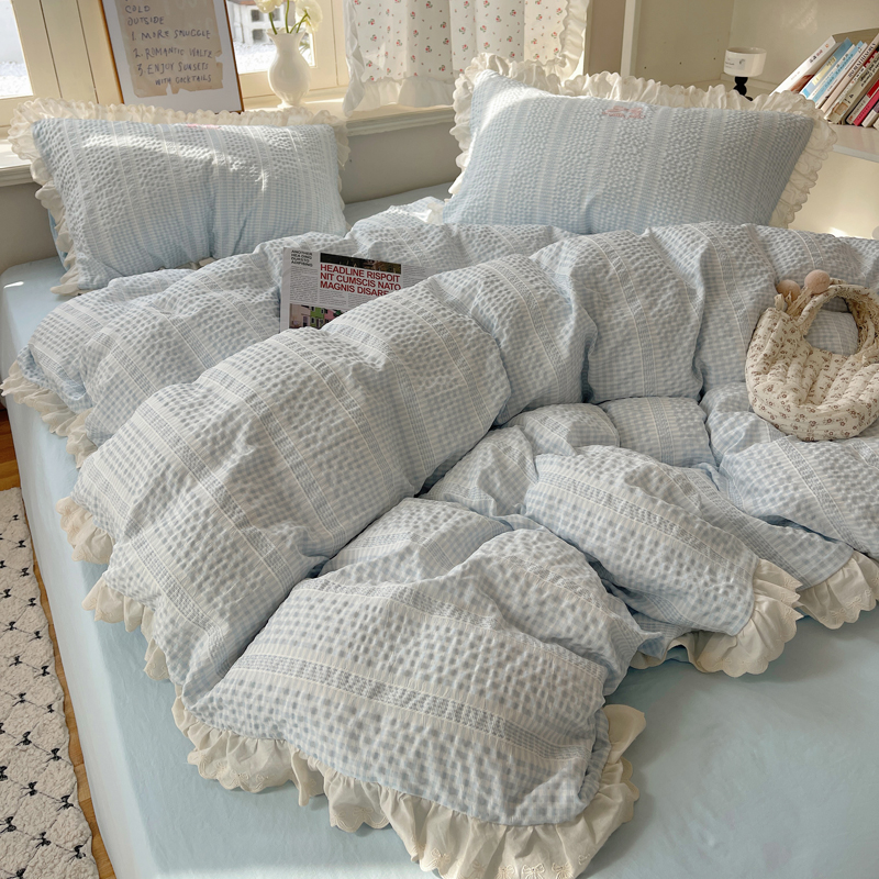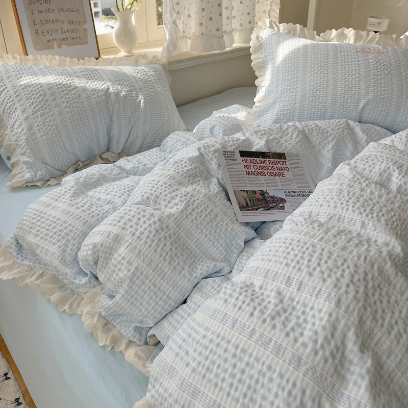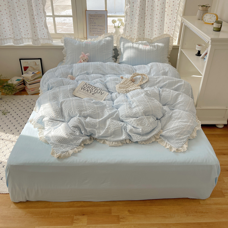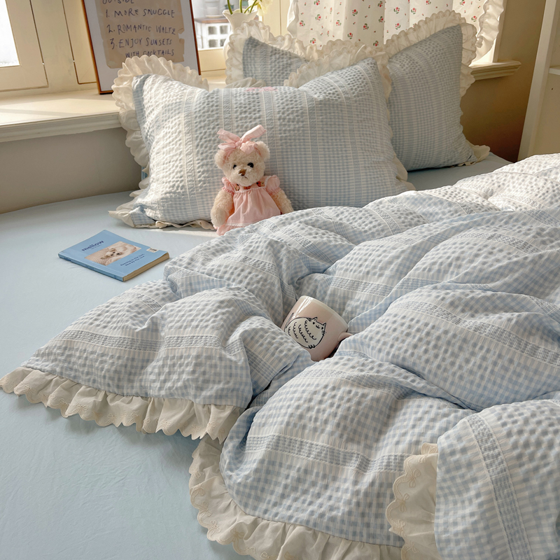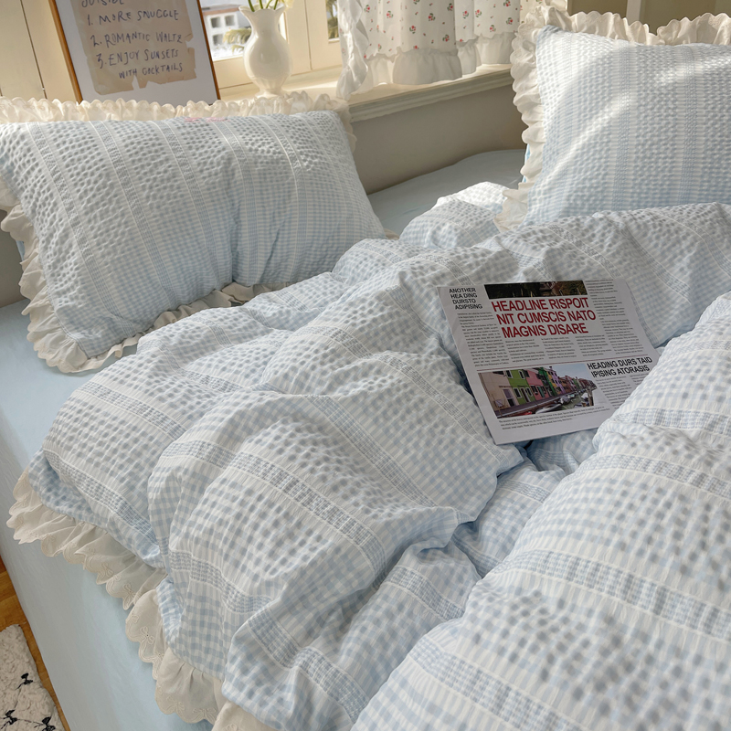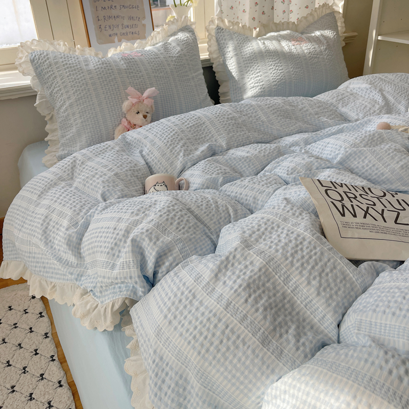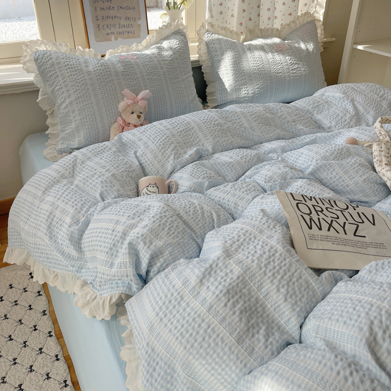 商品名称:轻奢坊 2025新款色织提花格子水洗棉仙仙花边安妮四件套 花边安妮-蓝