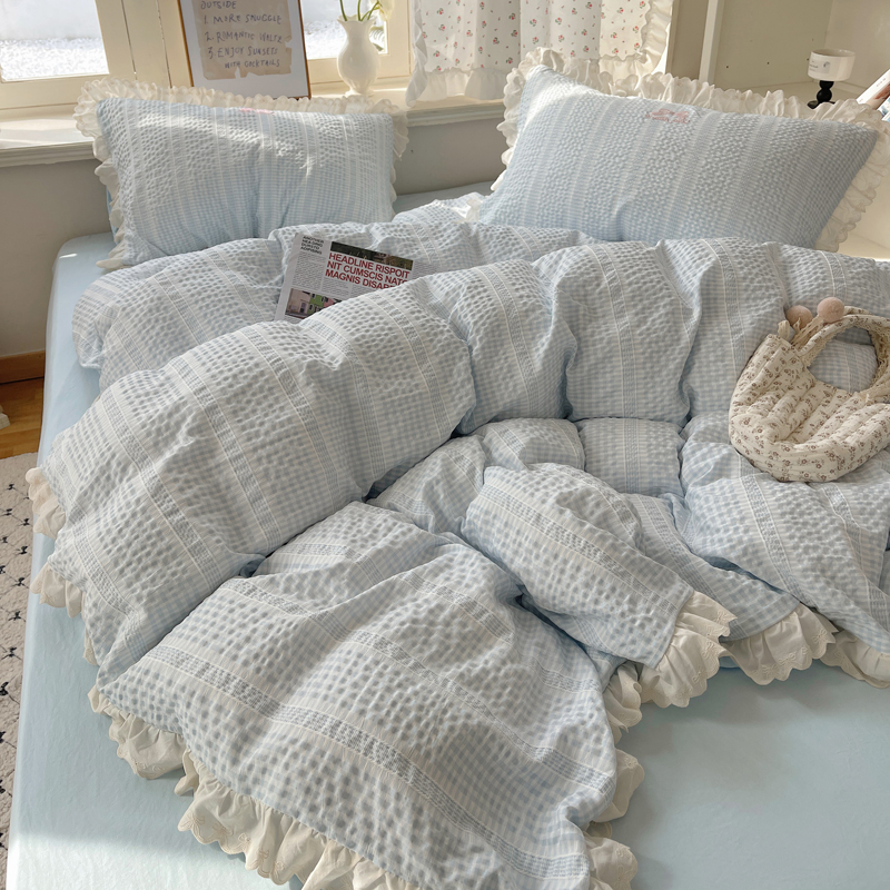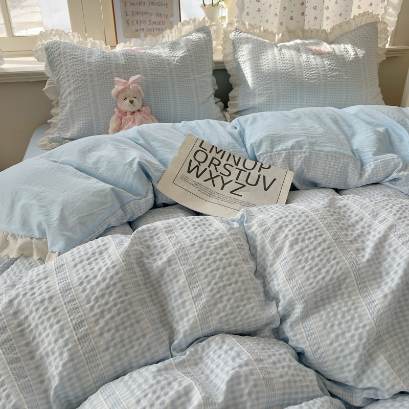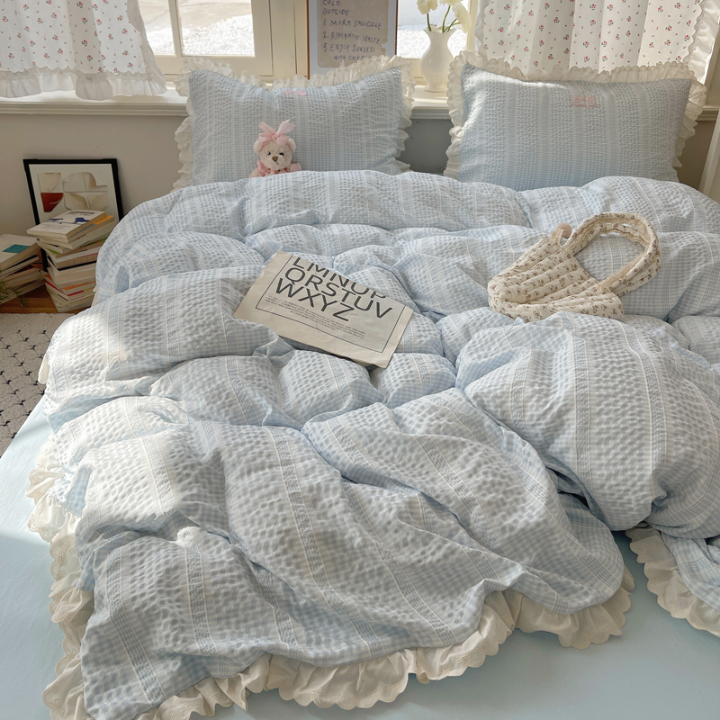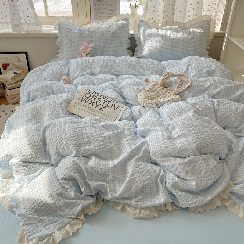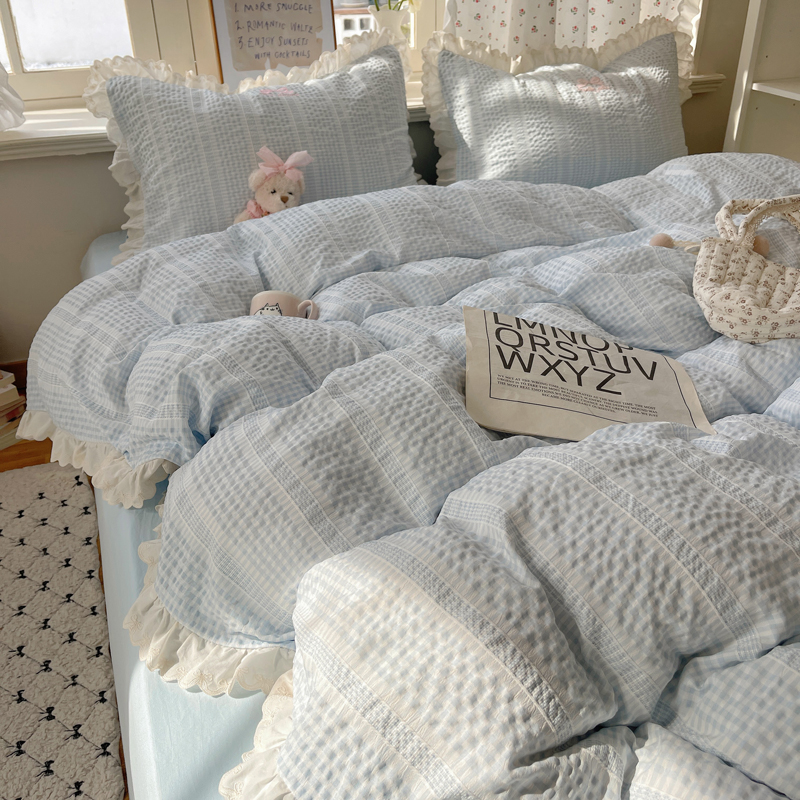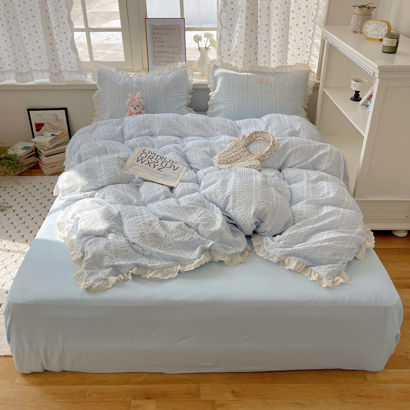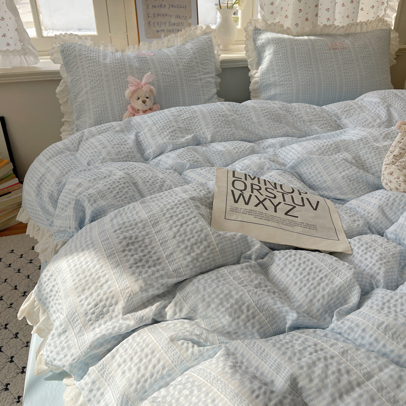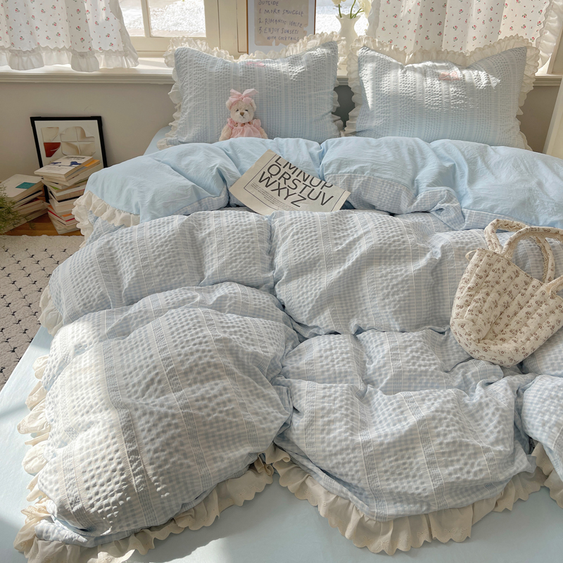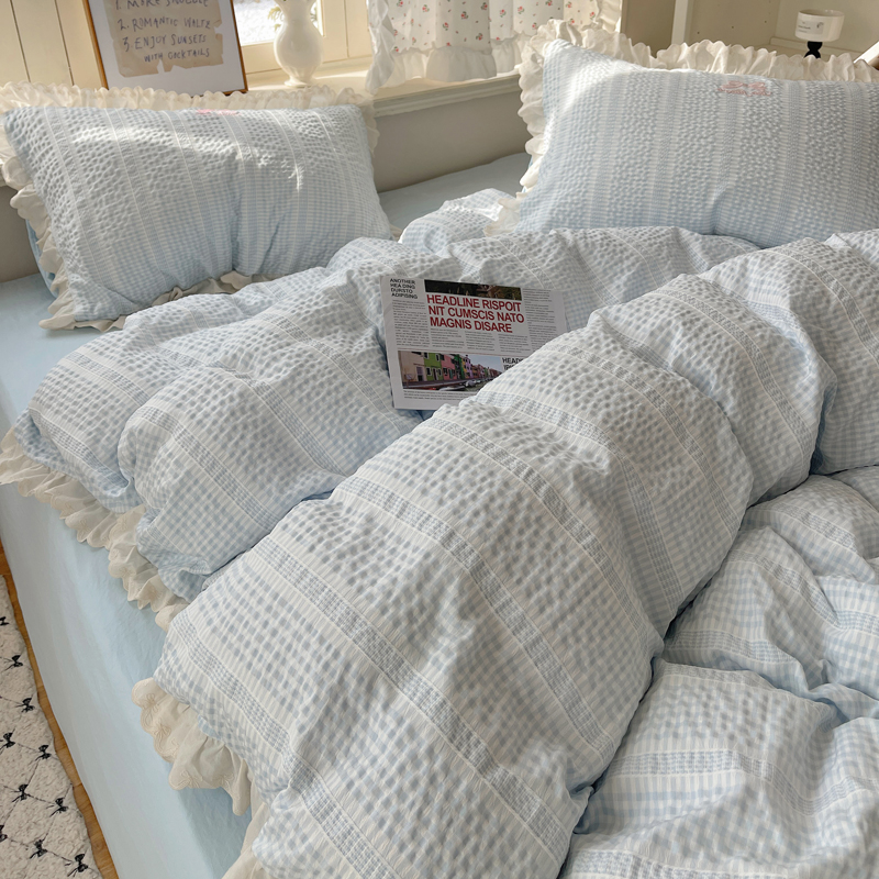 商品名称:轻奢坊 2025新款色织提花格子水洗棉仙仙花边安妮四件套 花边安妮-蓝