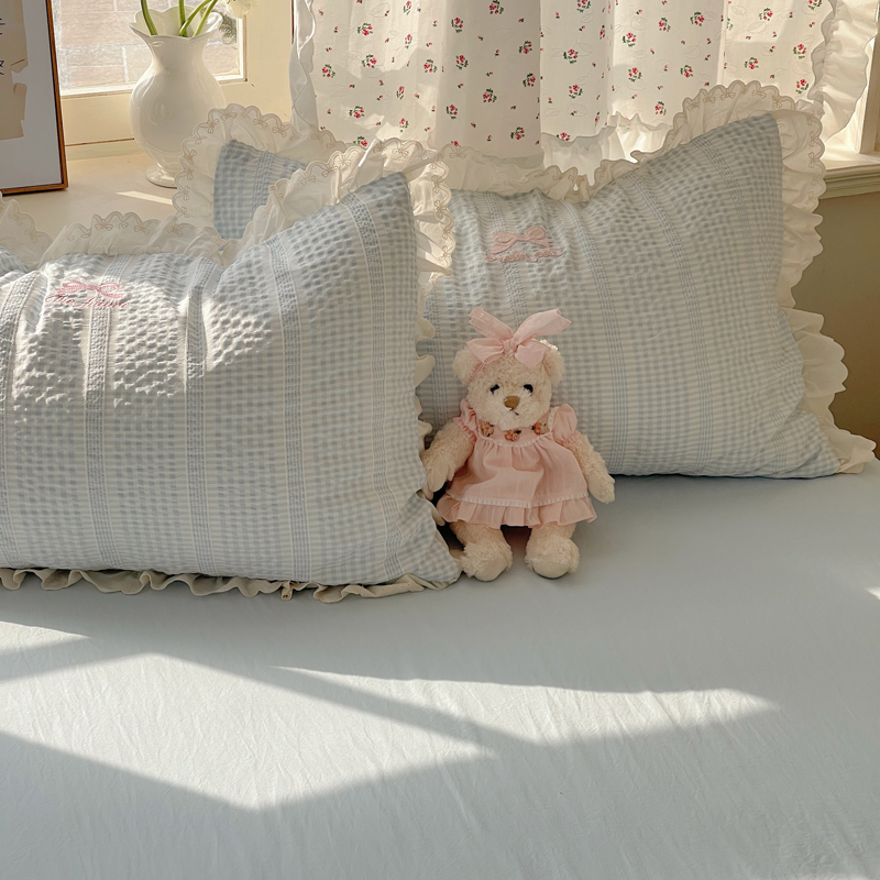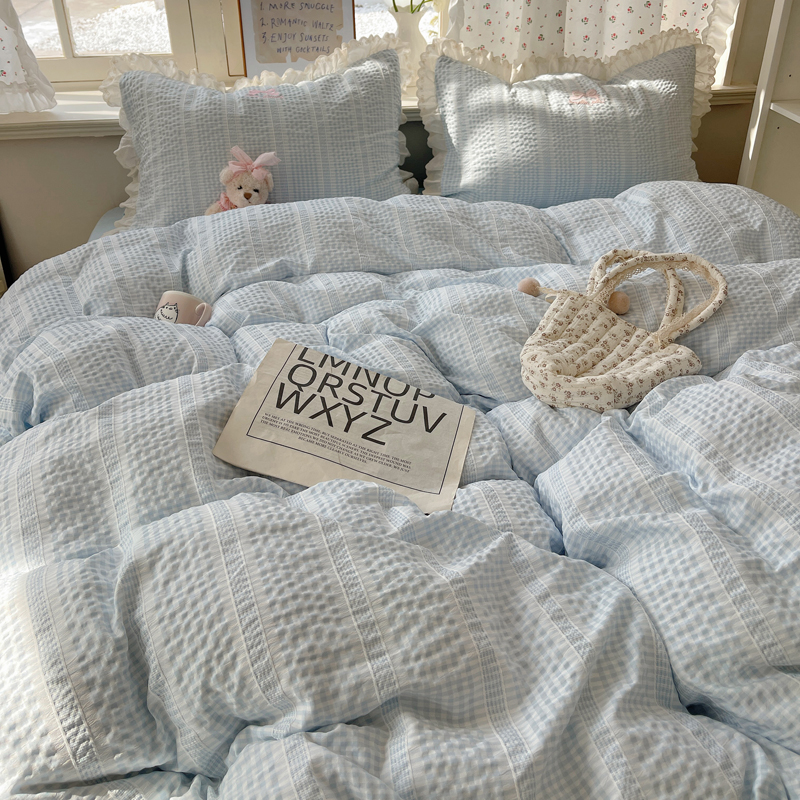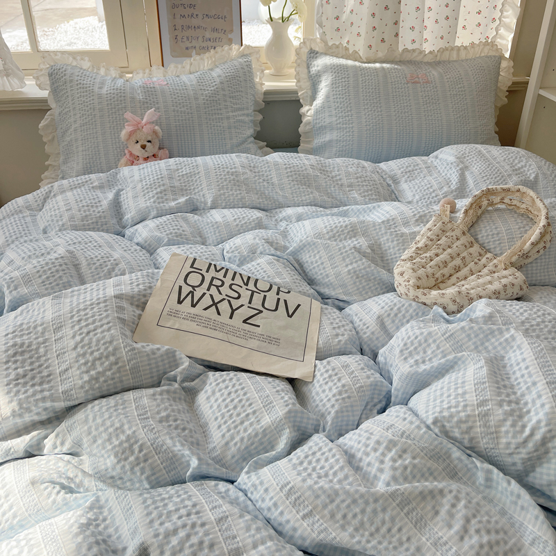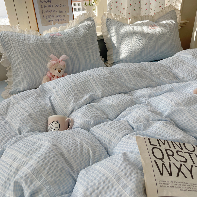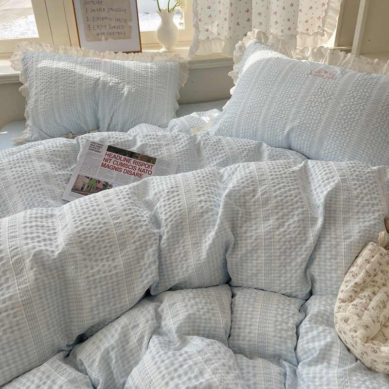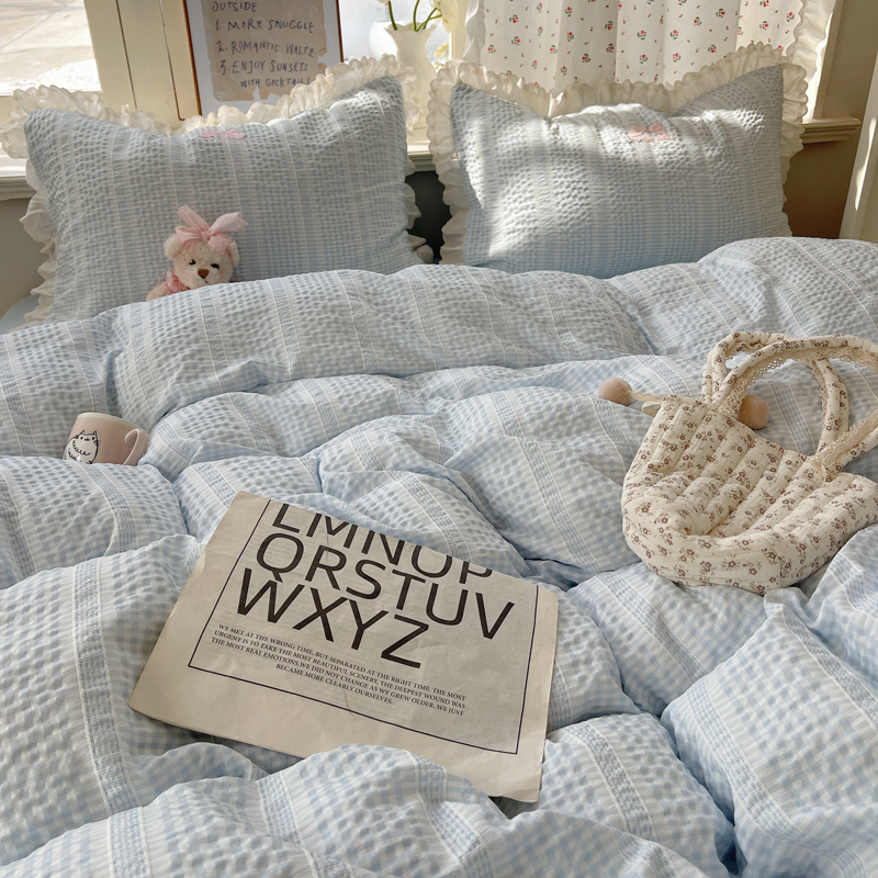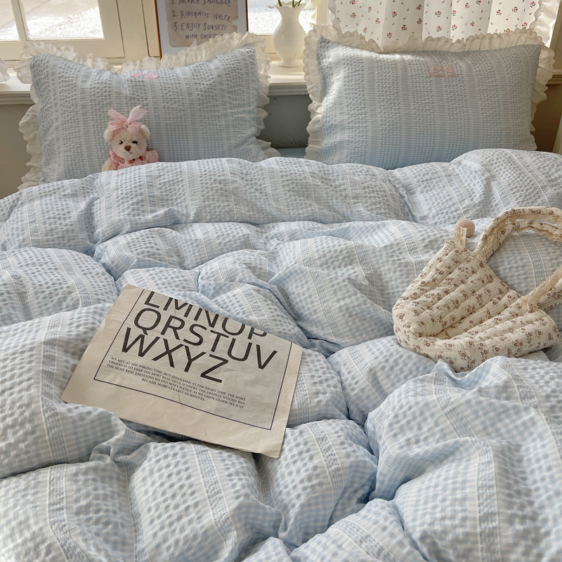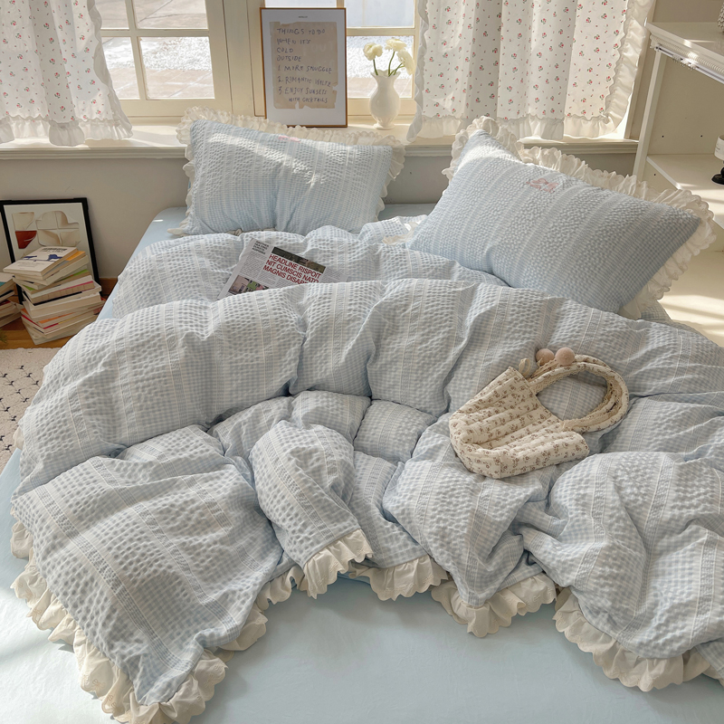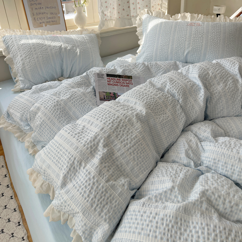 商品名称:轻奢坊 2025新款色织提花格子水洗棉仙仙花边安妮四件套 花边安妮-蓝