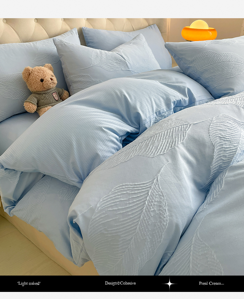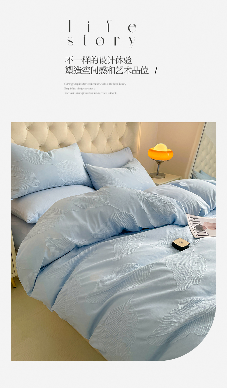 悦织湾家纺 2025新款色织提花立体四件套 提花叶舞天空兰