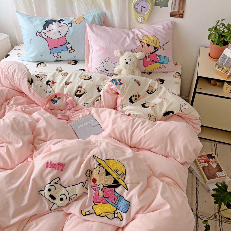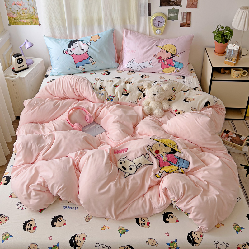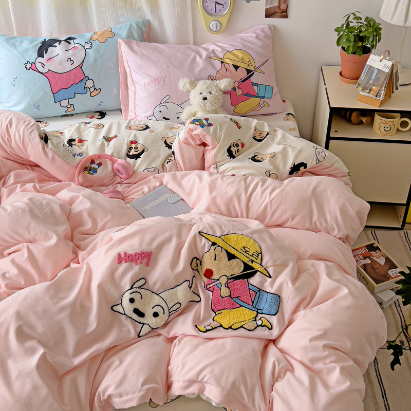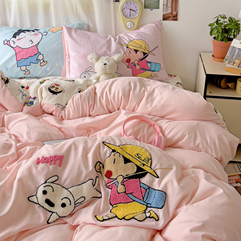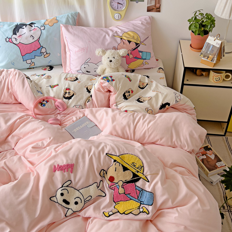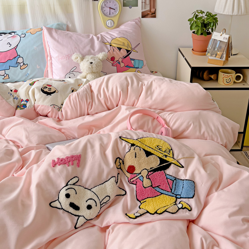 (总)一霖家纺 2025新款大版卡通牛奶绒四件套,搞怪新新紫,俏皮小新-黄,俏皮小新-蓝,甜心猫咪,星空小新