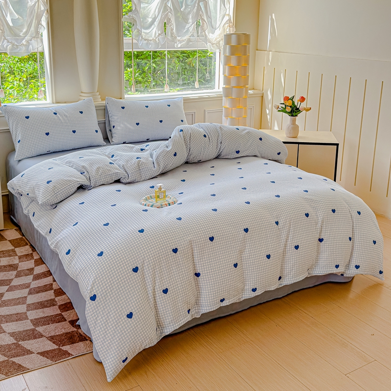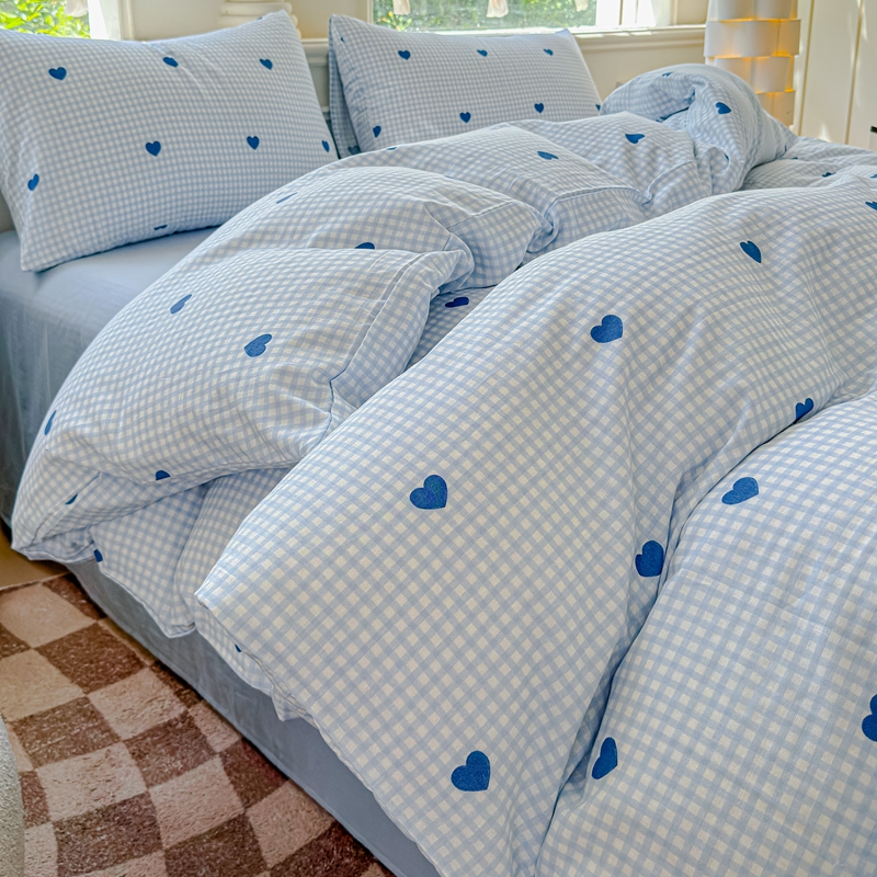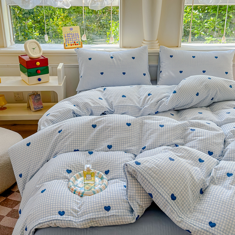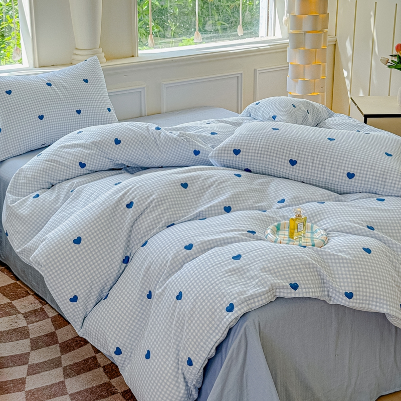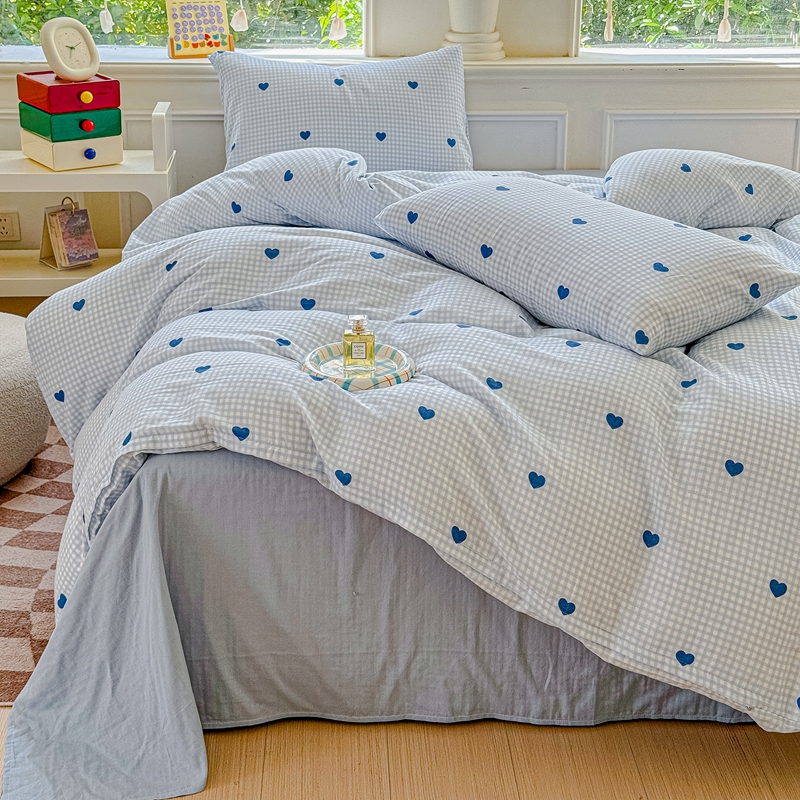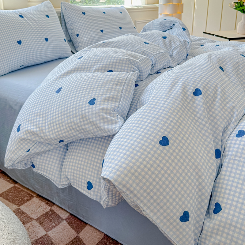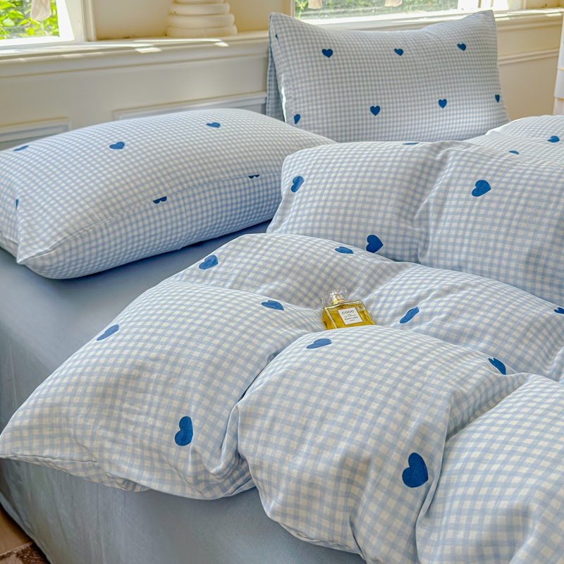 当前位置: 91家纺网 > 商品网购 > 床品套件 > 四件套 > 双层纱四件套 > 感遇家纺2025新款全棉双层纱纤柔四件套 格子爱心蓝