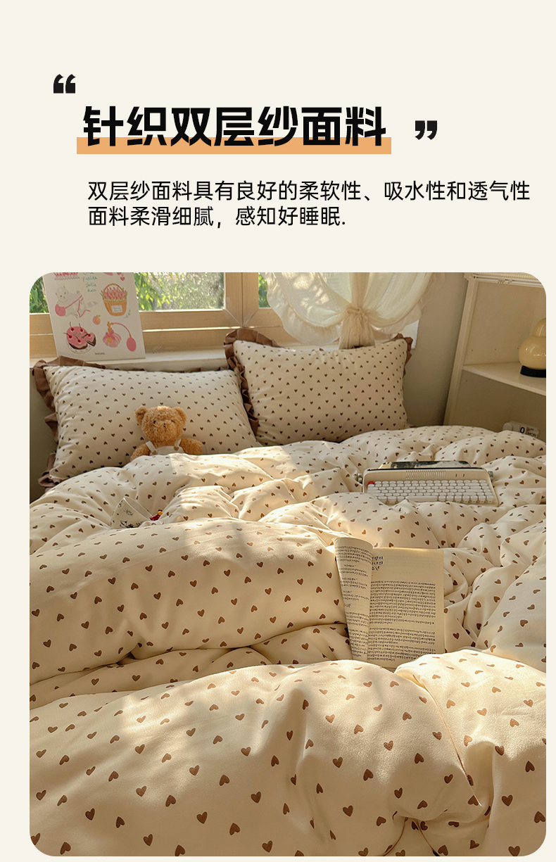 (总)韩巢家纺 2026新款花边款针织双层纱四件套,爱心,彩色蝴蝶结,春和豆沙,春和米,春意花开,叮当熊,花田薇,可爱多兰,可爱熊,敏敏灰,魔法森林,木昔,奶油波点米,奶油狗,巧克力,塞林娜绿,塞林娜米黄,问秋黄,问秋棕,熊先生,悠然紫,云山沐晚