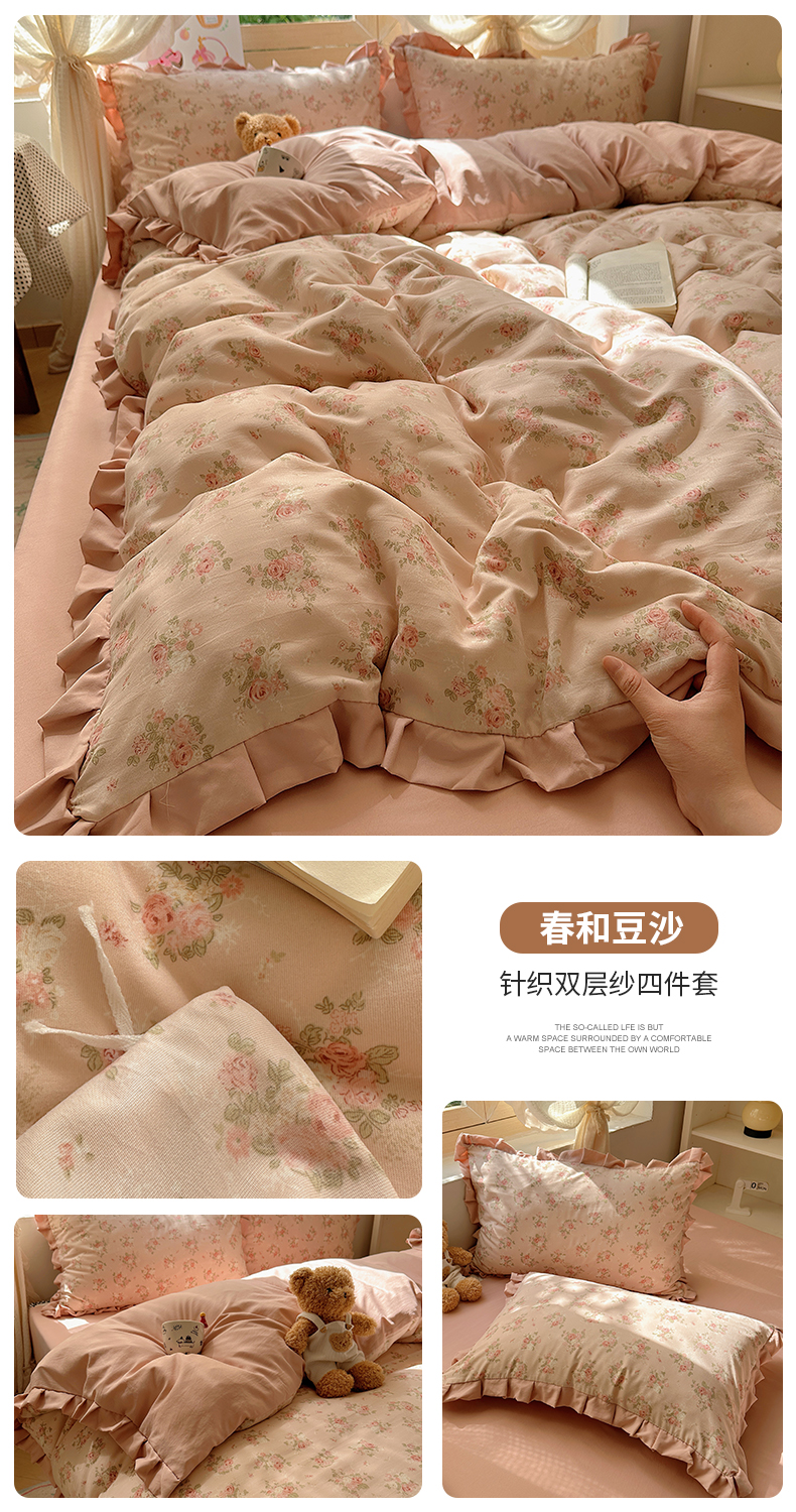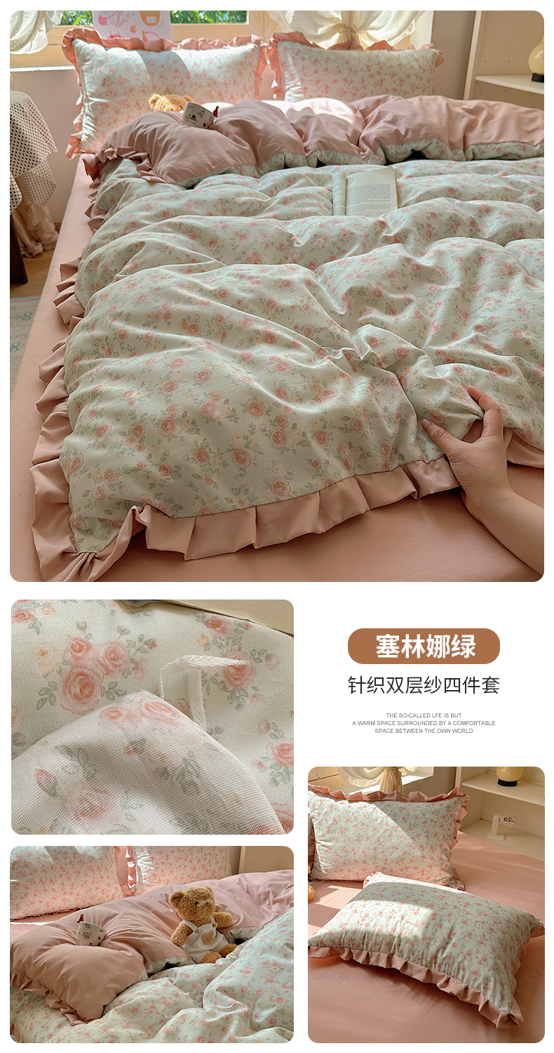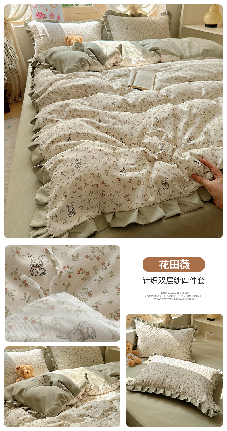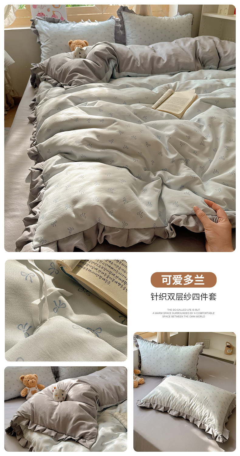 商品名称:(总)韩巢家纺 2025新款针织双层纱花边款被套直播热销款四件套学生宿舍床单三件套-(提供卖家秀)