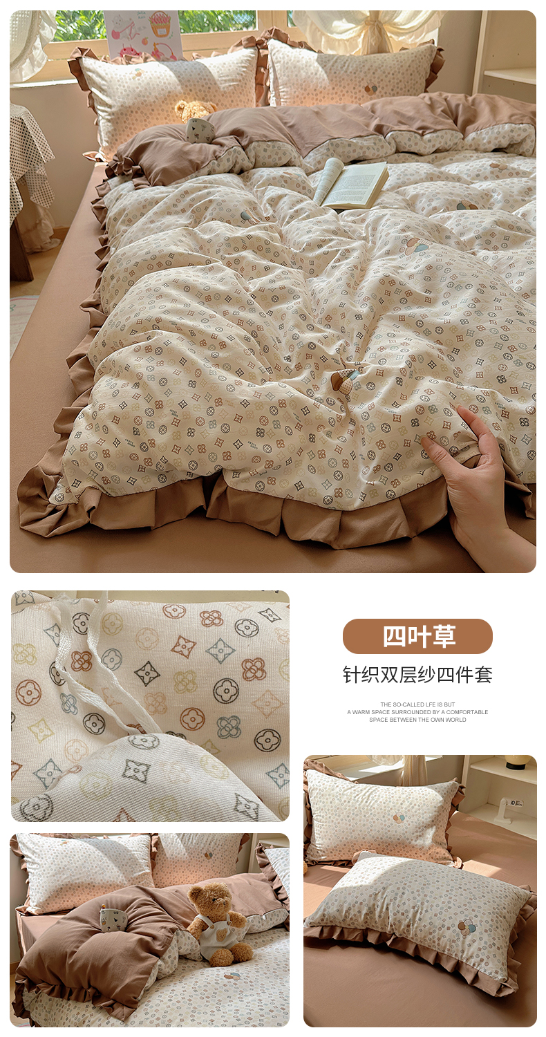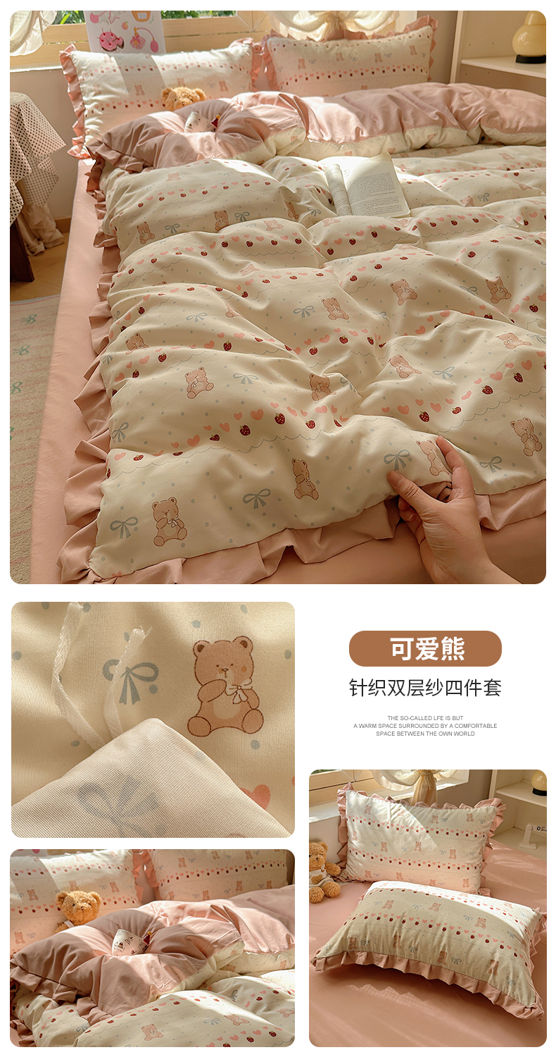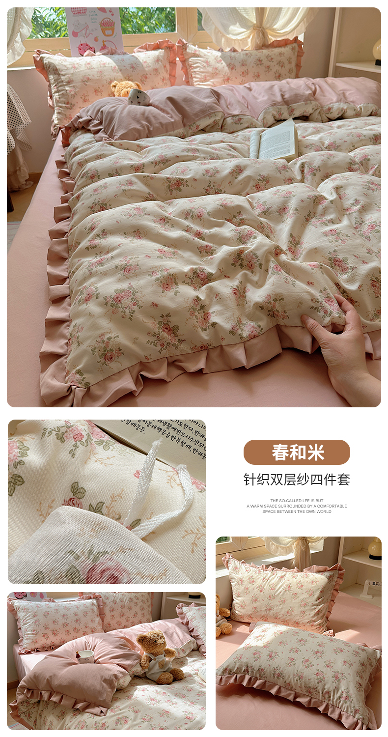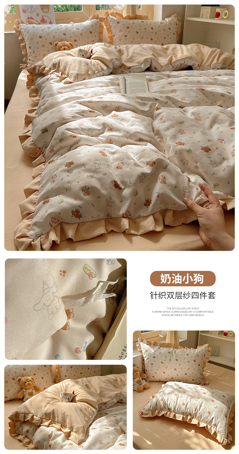 商品名称:(总)韩巢家纺 2025新款针织双层纱花边款被套直播热销款四件套学生宿舍床单三件套-(提供卖家秀)