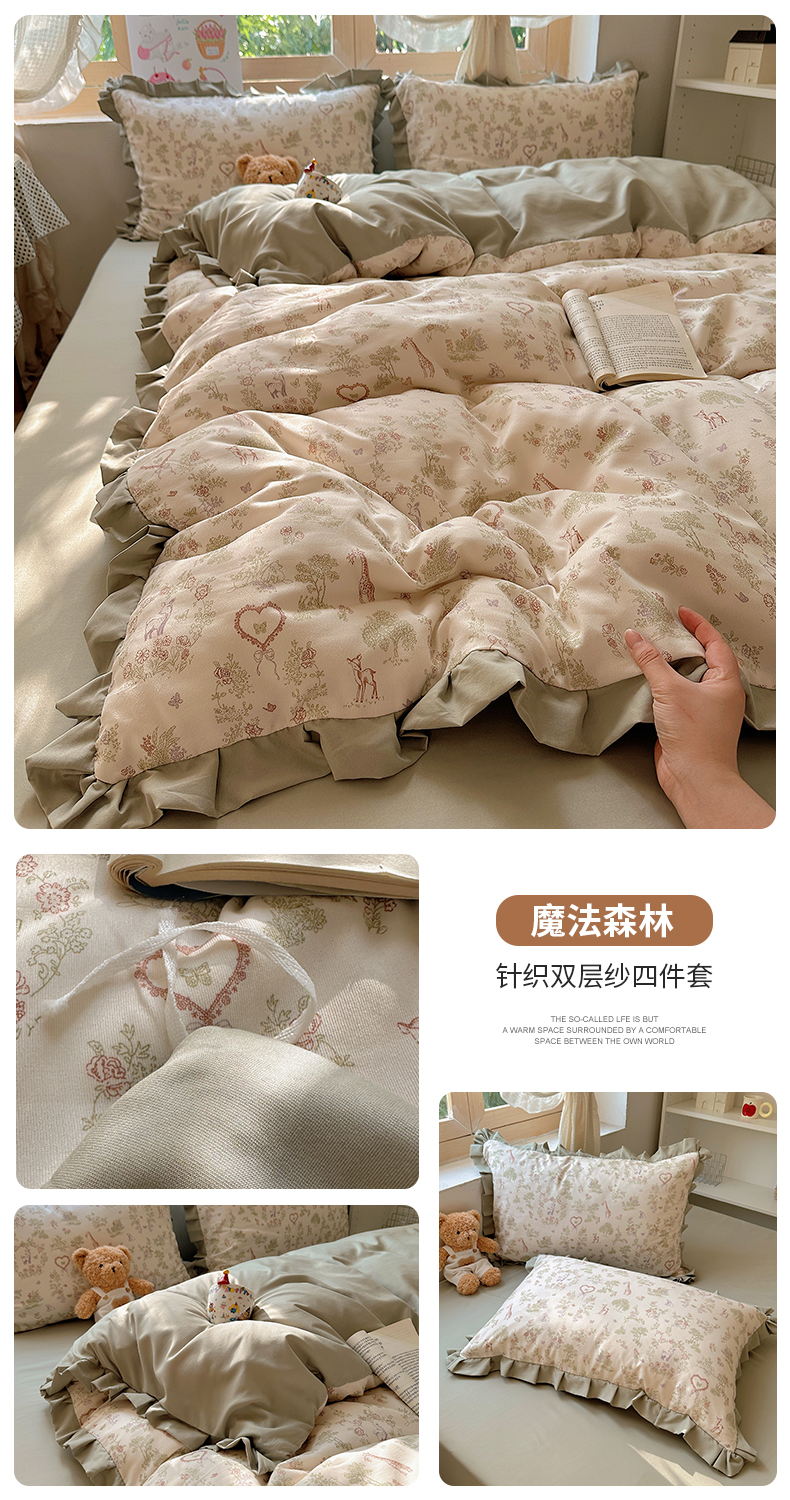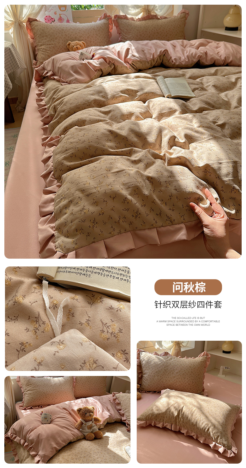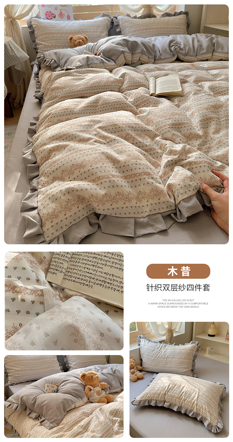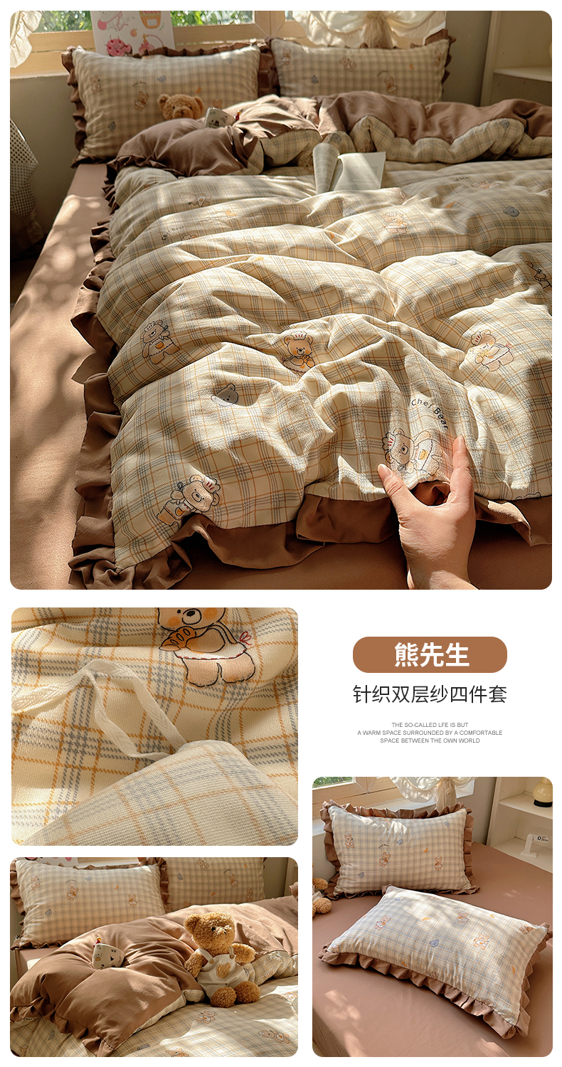 商品名称:(总)韩巢家纺 2025新款针织双层纱花边款被套直播热销款四件套学生宿舍床单三件套-(提供卖家秀)