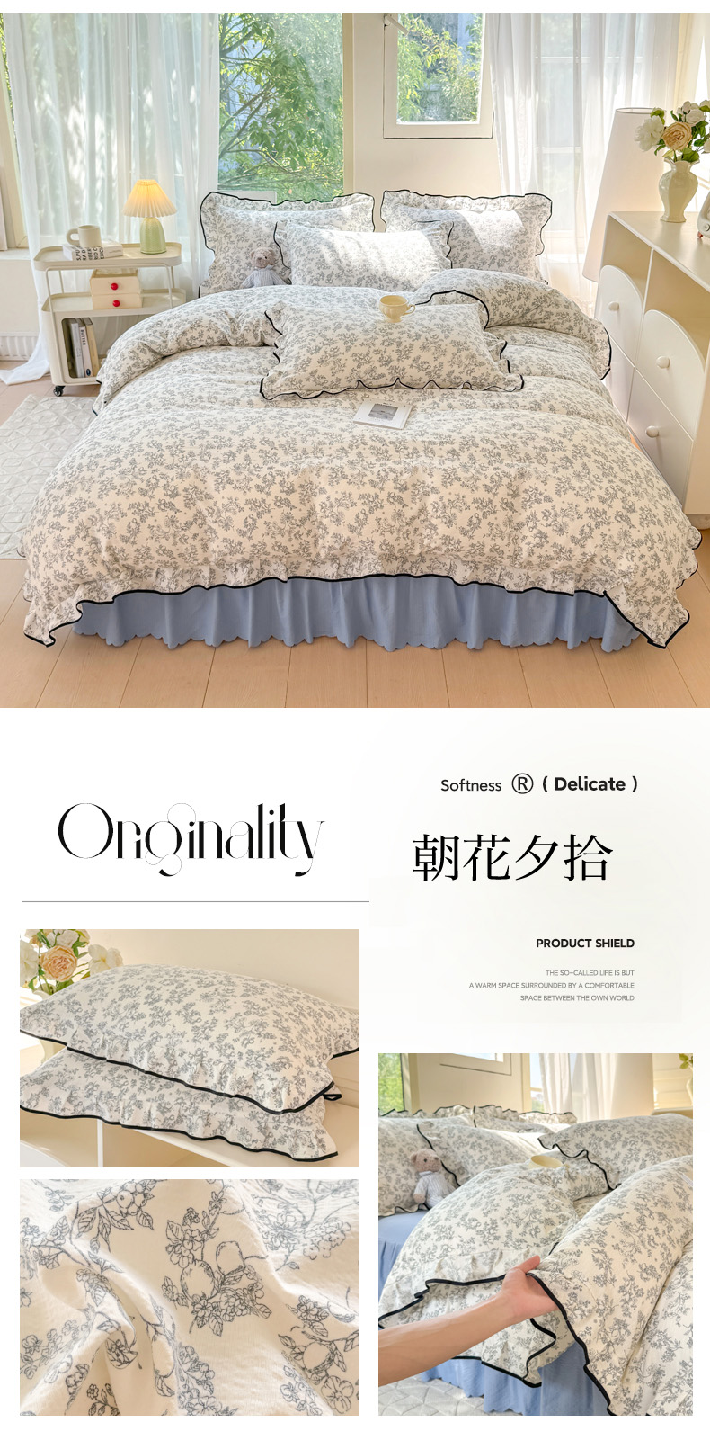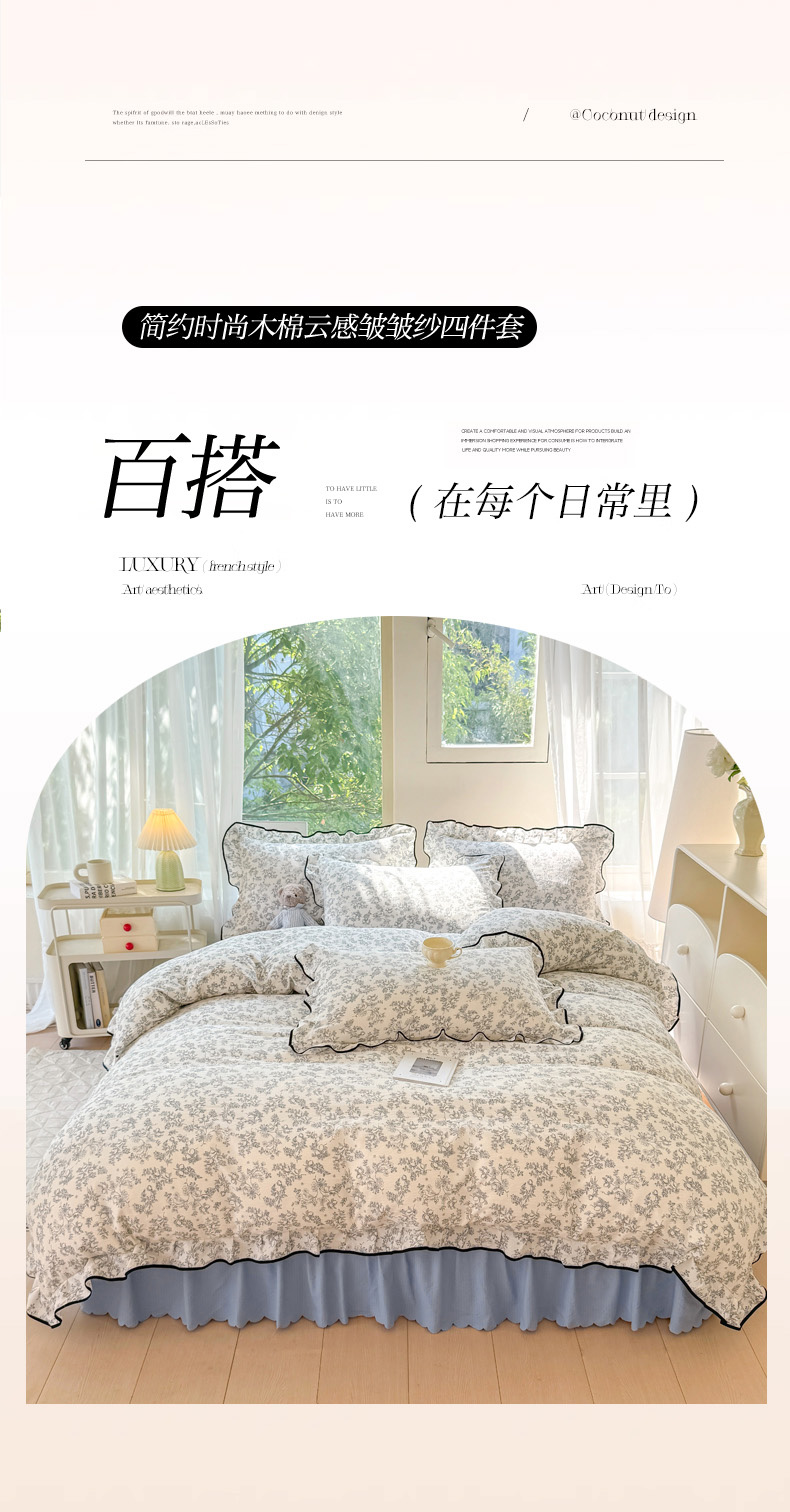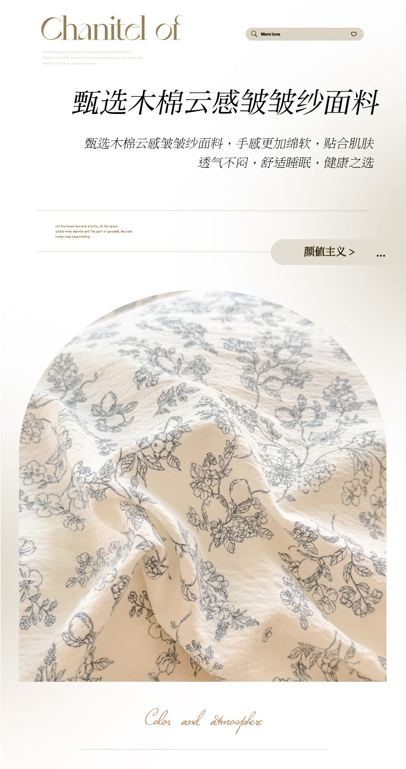 当前位置: 91家纺网 > 商品网购 > 床品套件 > 四件套 > 双层纱四件套 > 上尚居 2025新款简约时尚木棉云感皱皱纱四件套 朝花夕拾