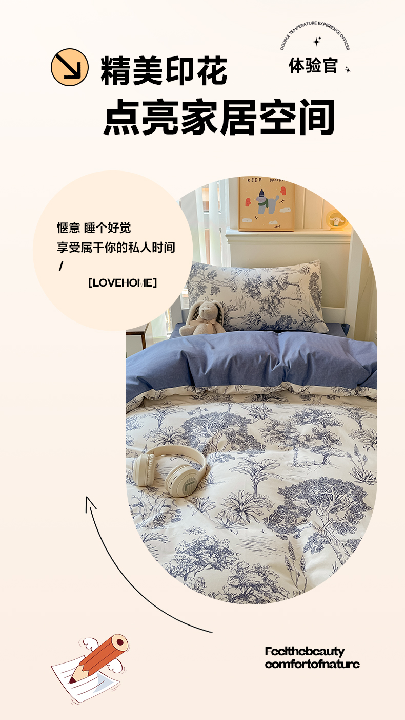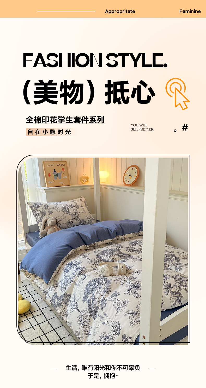 当前位置: 91家纺网 > 商品网购 > 床品套件 > 三件套 > 雅居纺家纺 2025新款全棉纯棉印花系列学生宿舍三四件套上下铺三件套 妙语花香
