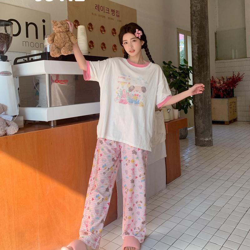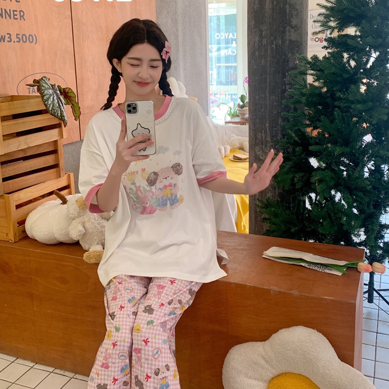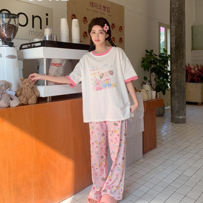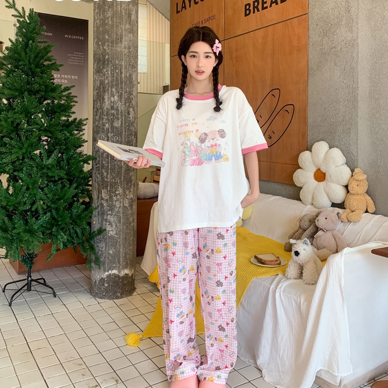 当前位置: 91家纺网 > 商品网购 > 居家日用 > 睡衣/家居服套装 > (总)妍景家居生活馆 2025新款纯棉短袖长裤春野森会粉家居套装