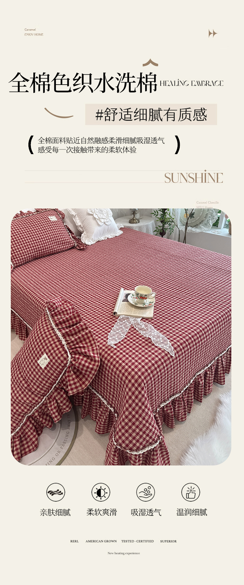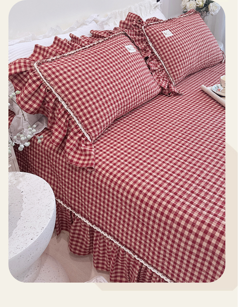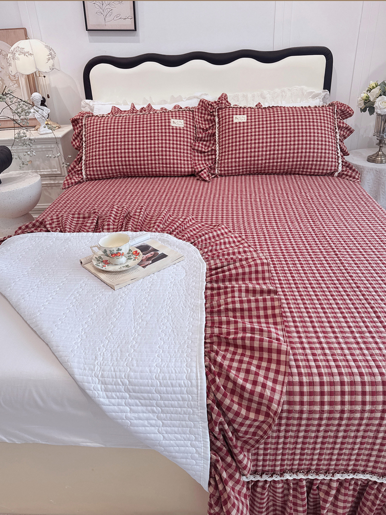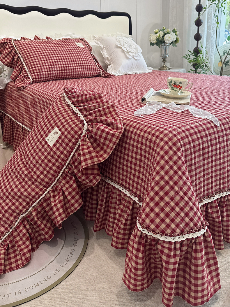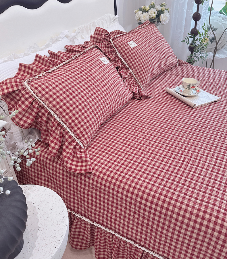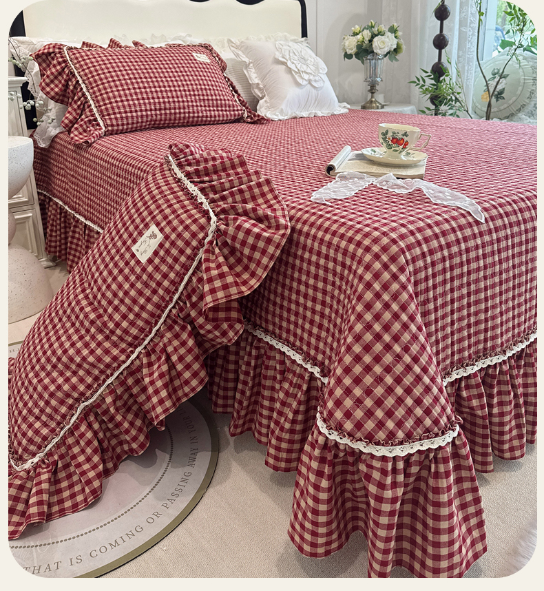 菊上家纺 2025新款全棉纯棉色织水洗单品床盖床盖单件单床盖 卡秋莎-复古红格