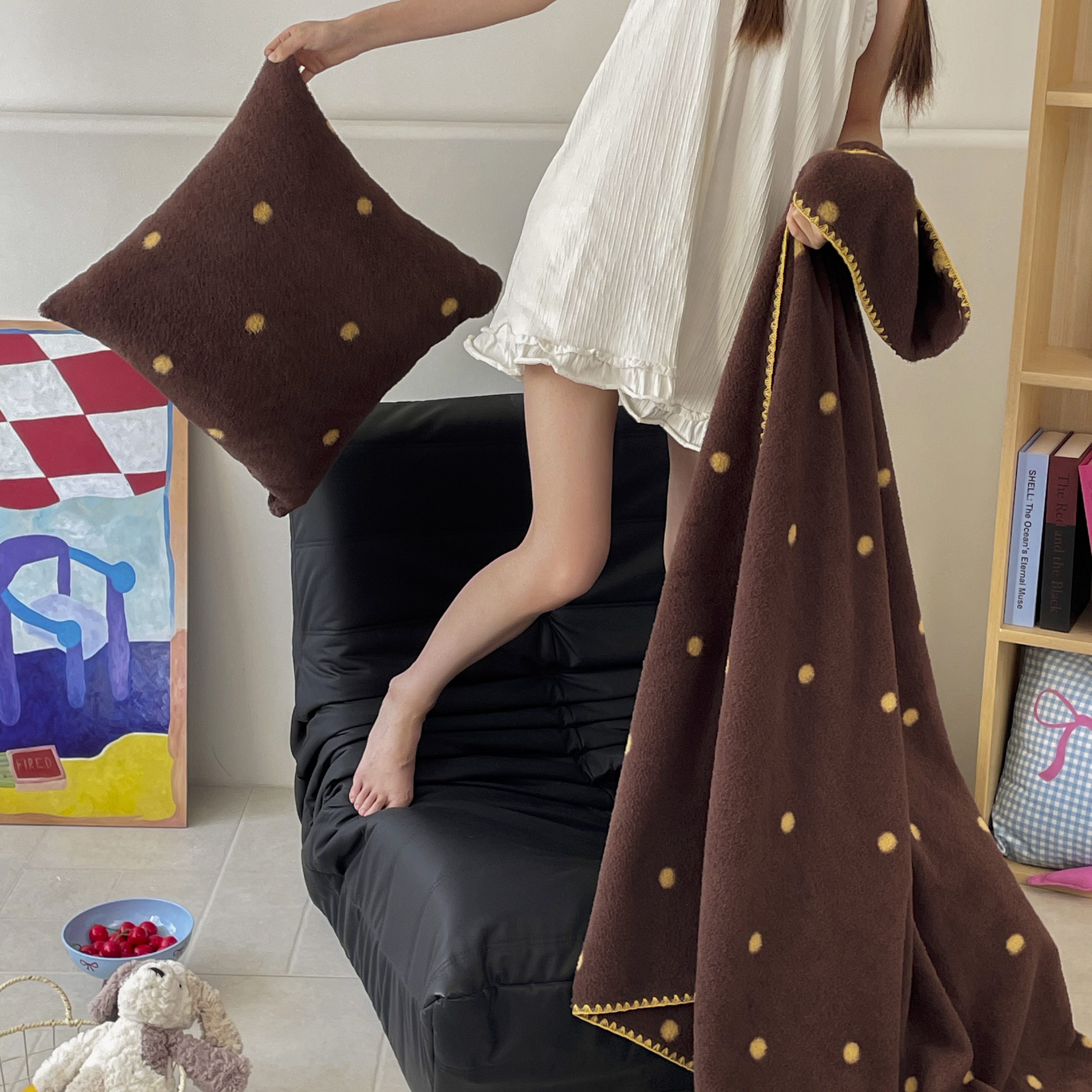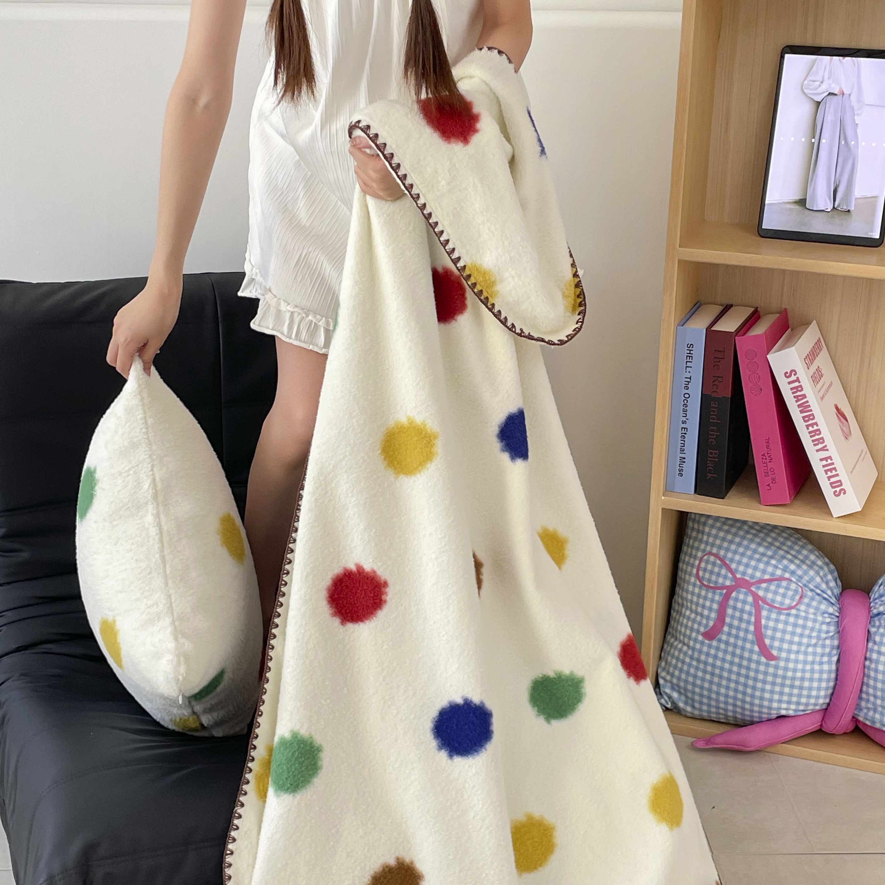 (总)十里居 2026新款韩系牛奶绒兔毛贴布绣床笠三件套四件套,波点小狗蓝,波点小狗白,波点小狗粉,波点小狗咖