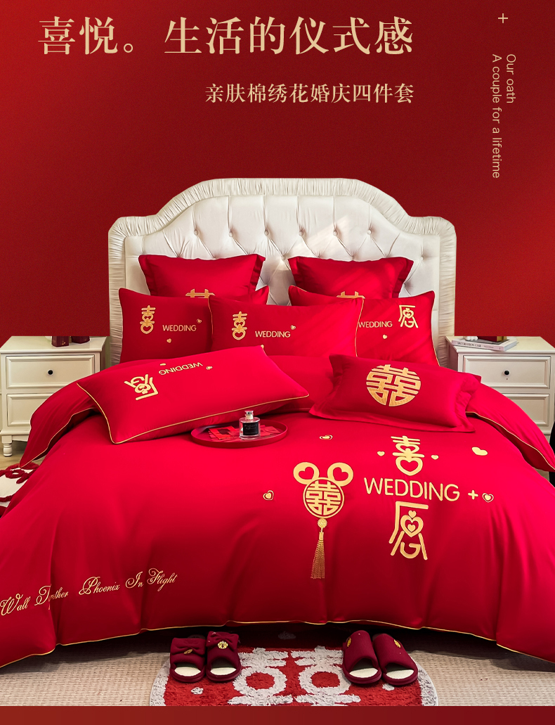欧乐蒂 2025新款亲肤棉婚庆刺绣四件套 喜愿