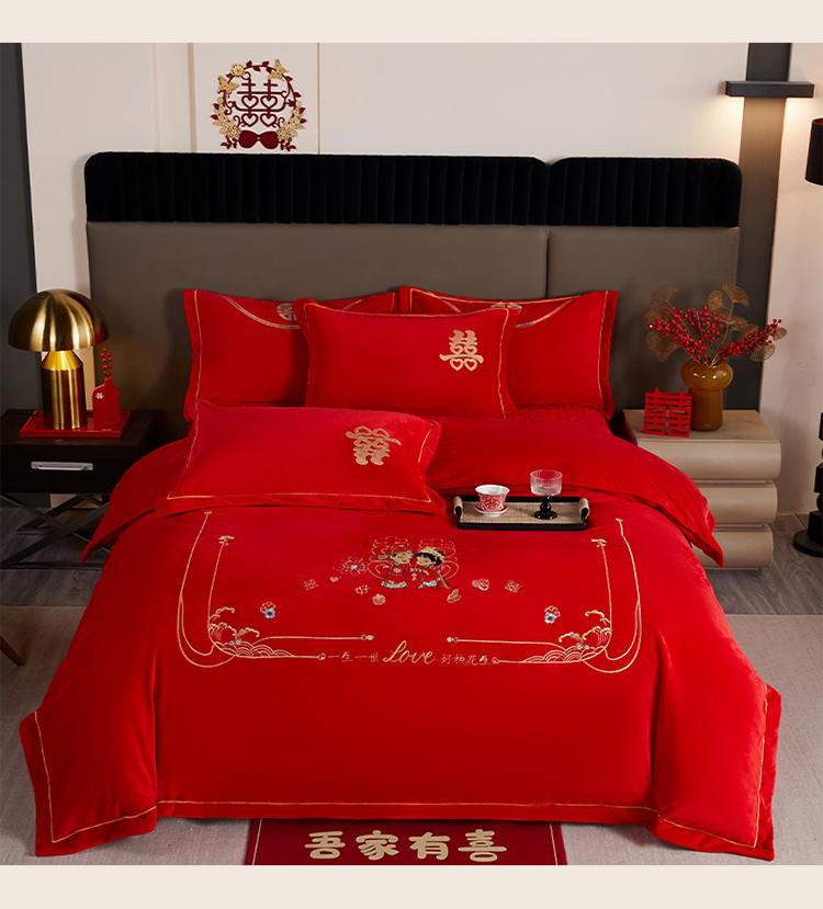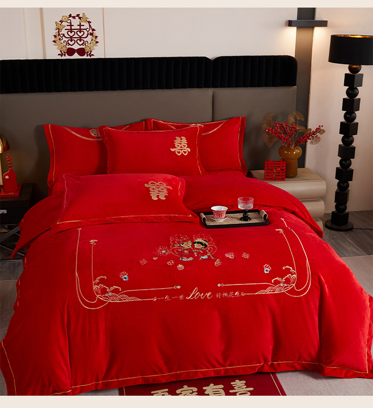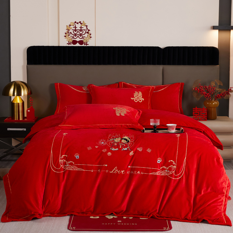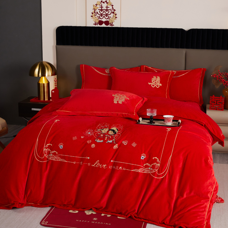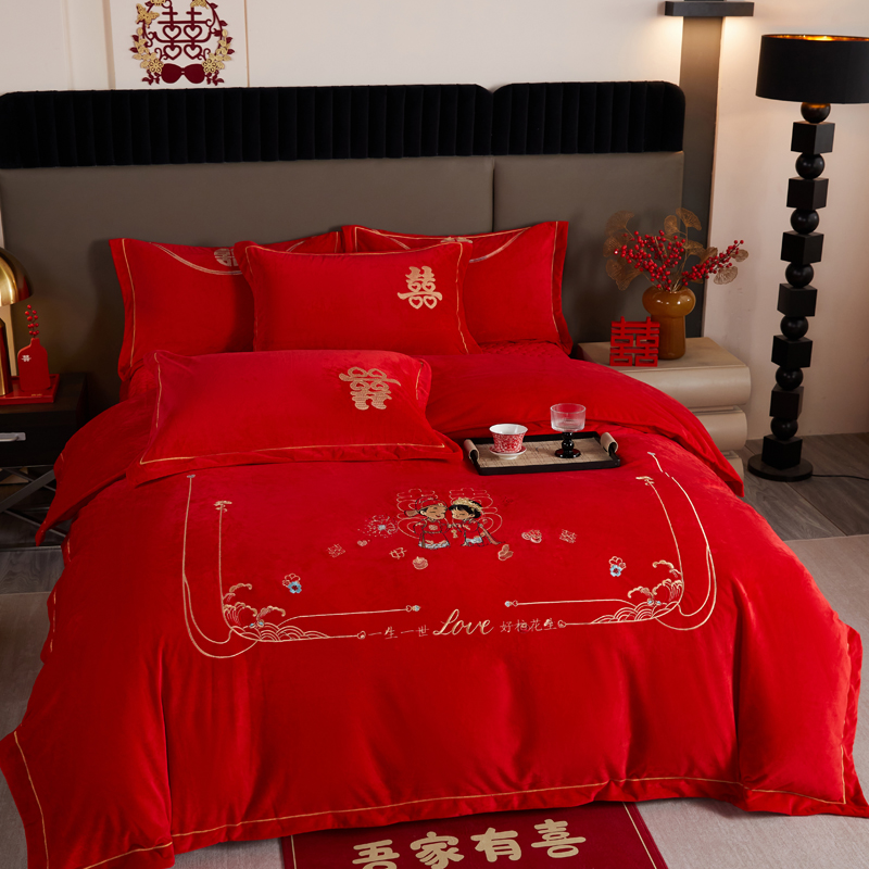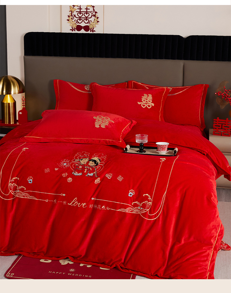 青竹苑 2025新款婴儿绒刺绣婚庆四件套 好事发生