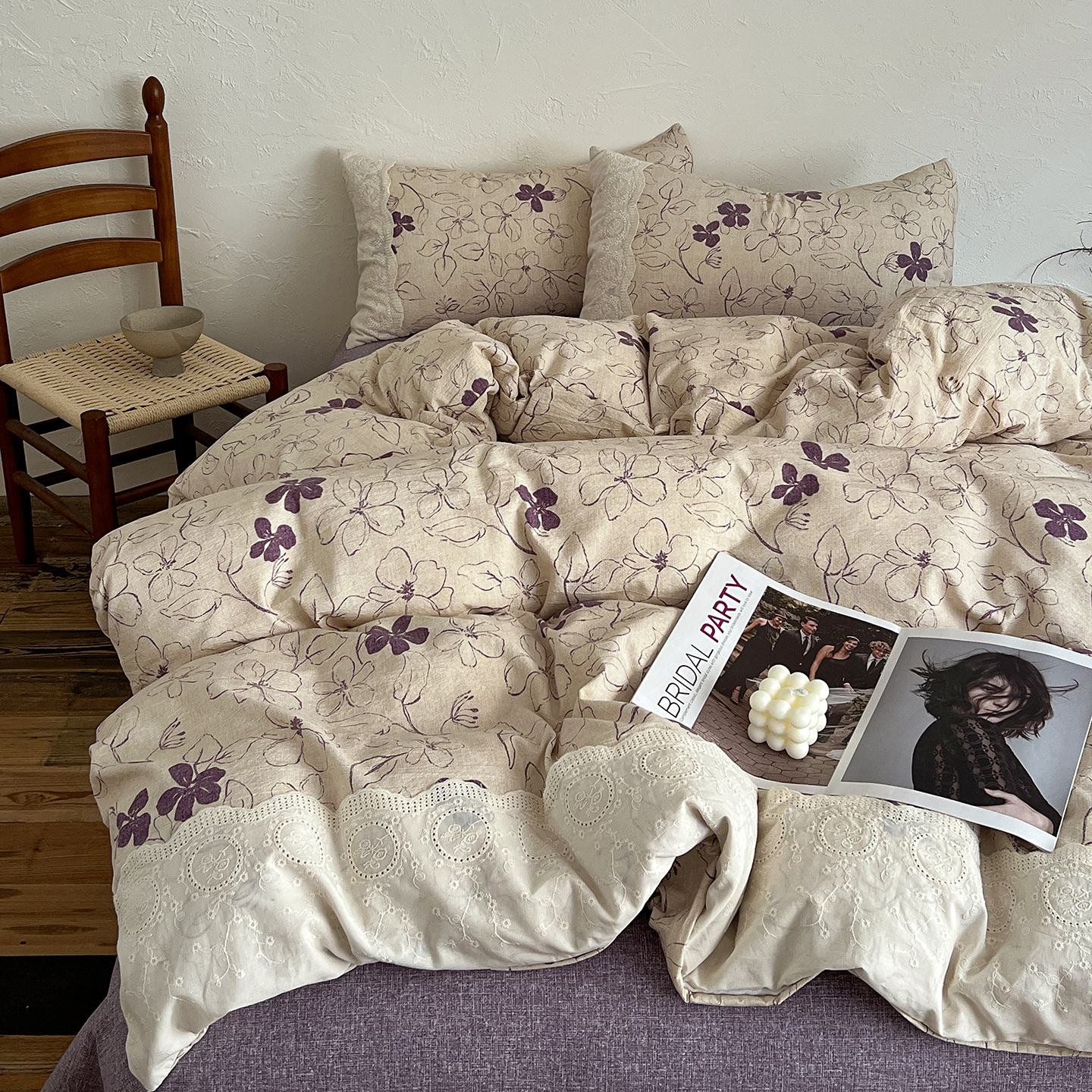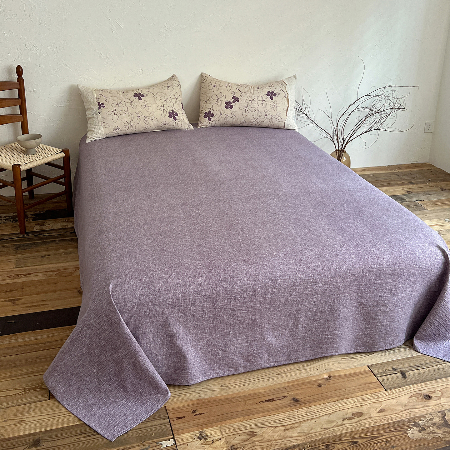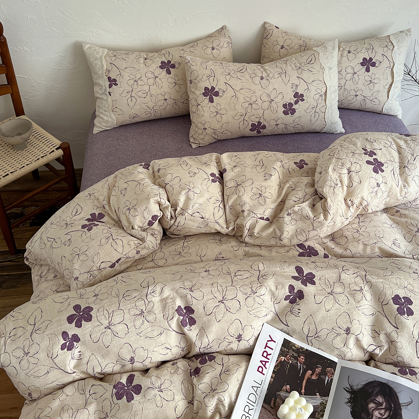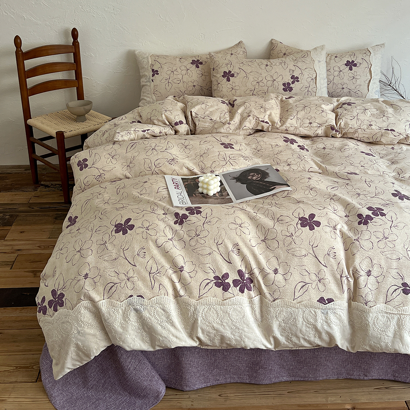 一比一家纺 2026秋冬新品高克重原麻复古全棉花边棉麻侘寂风原麻四件套 (控价99元)约定紫
