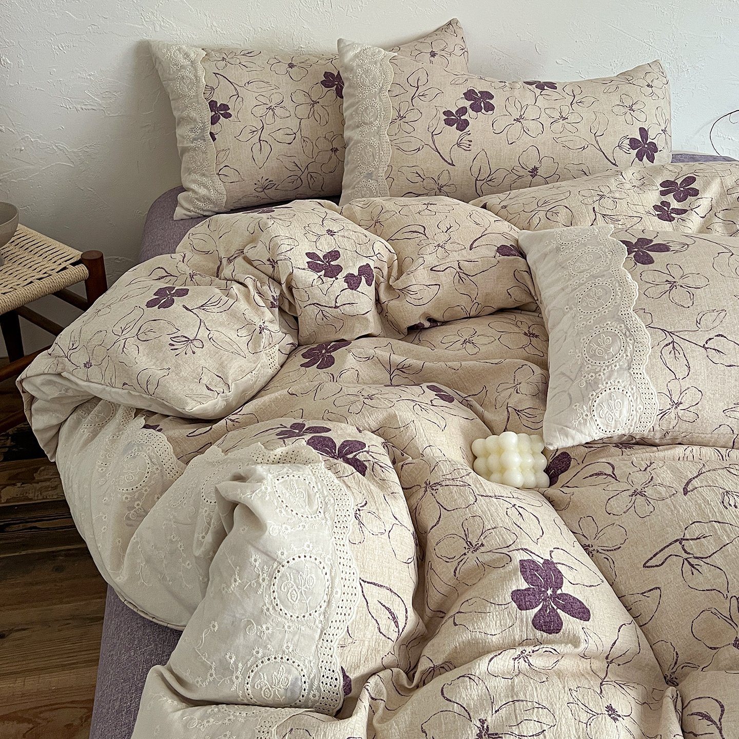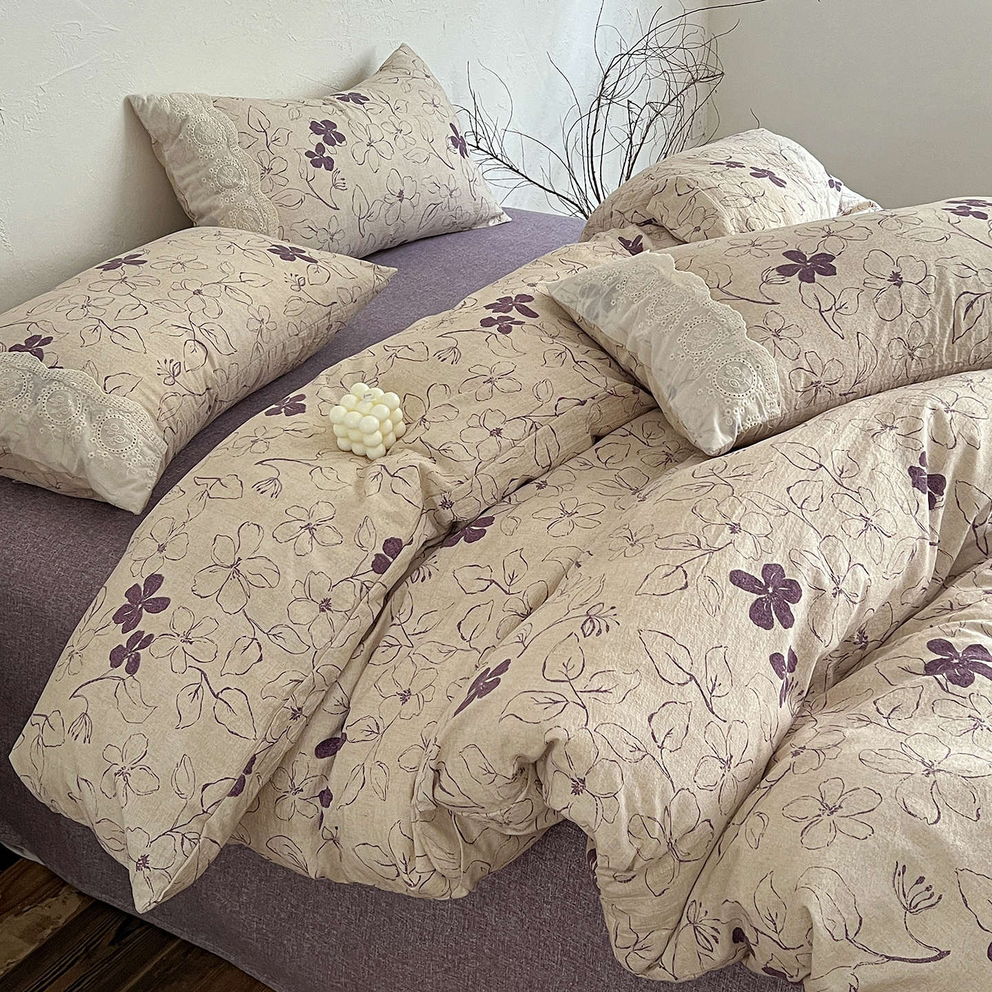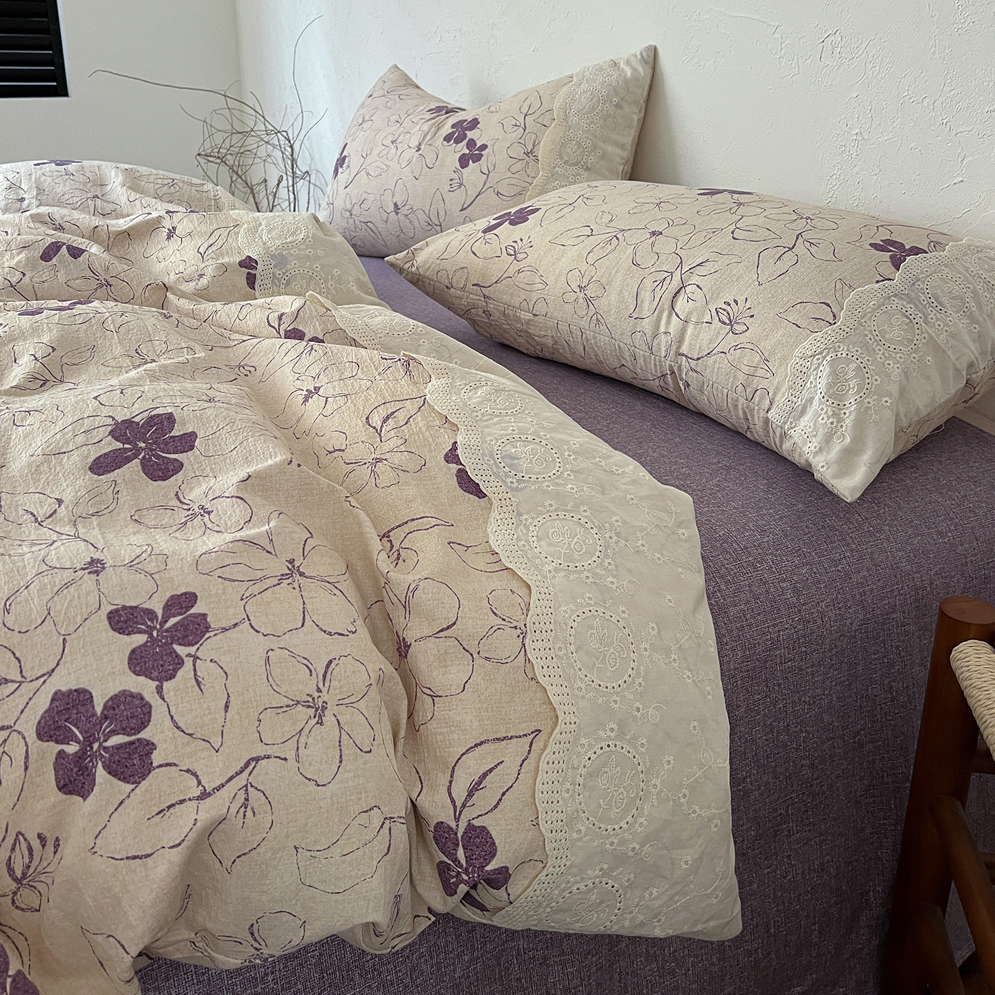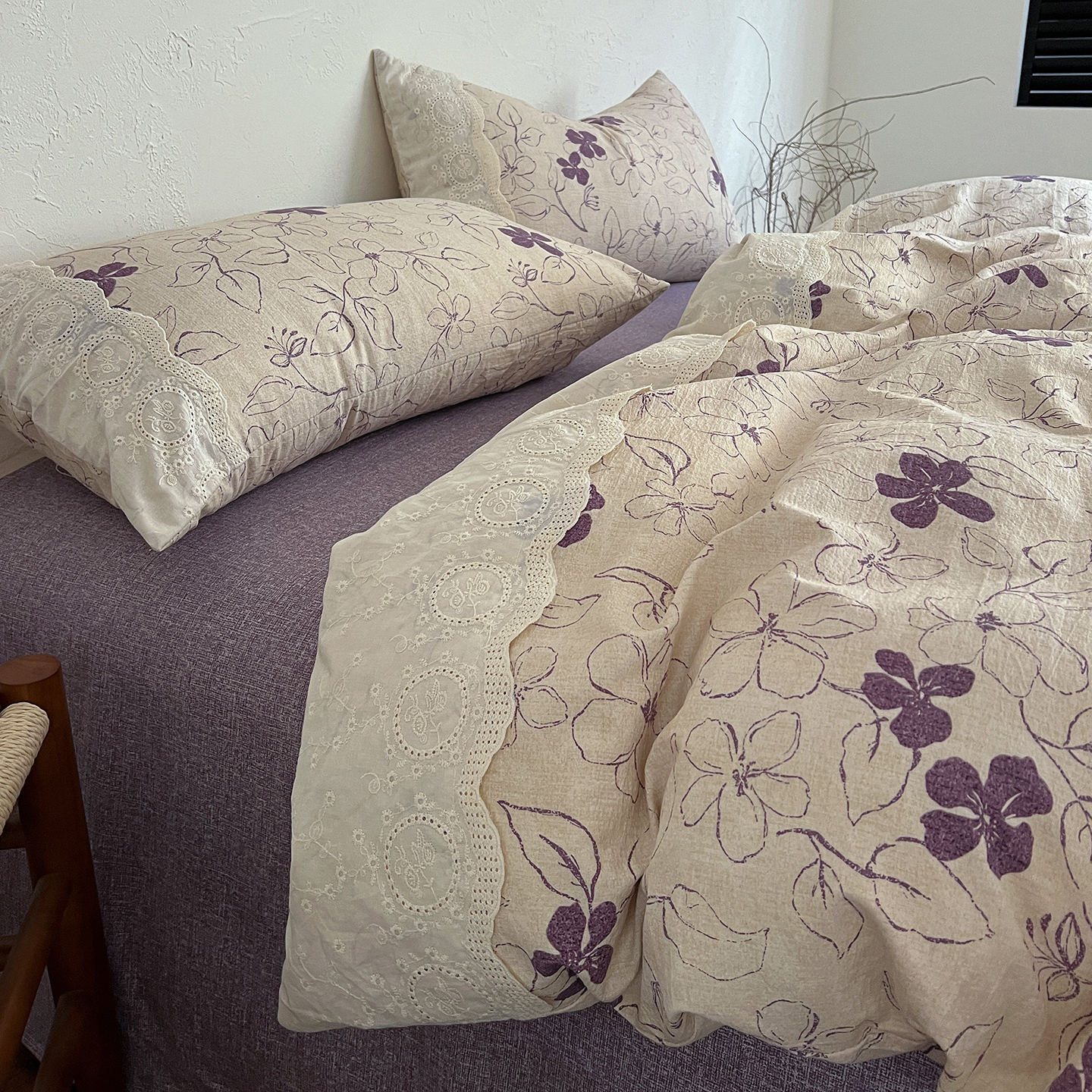 商品名称:一比一家纺 2026秋冬新品高克重原麻复古全棉花边棉麻侘寂风原麻四件套 (控价99元)约定紫