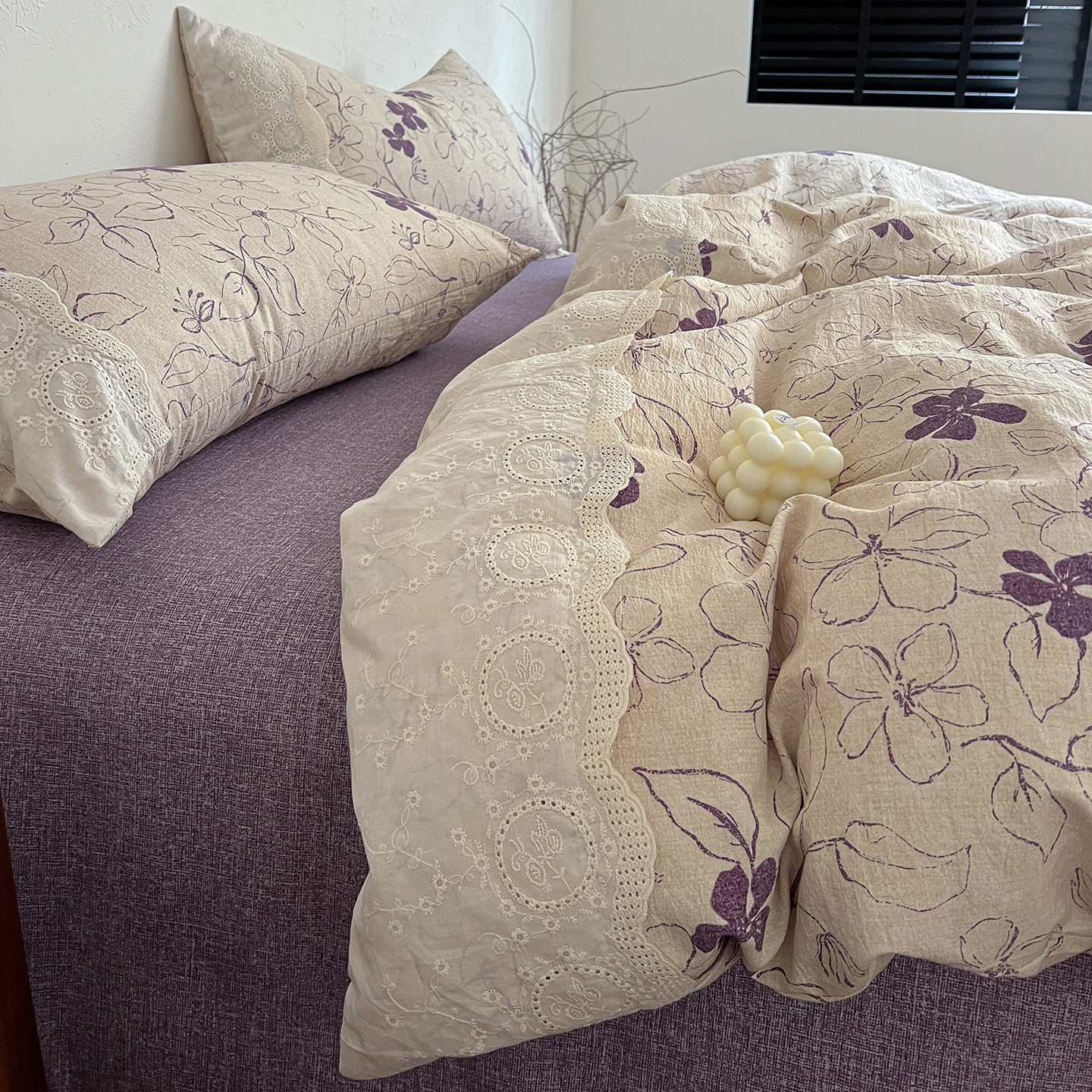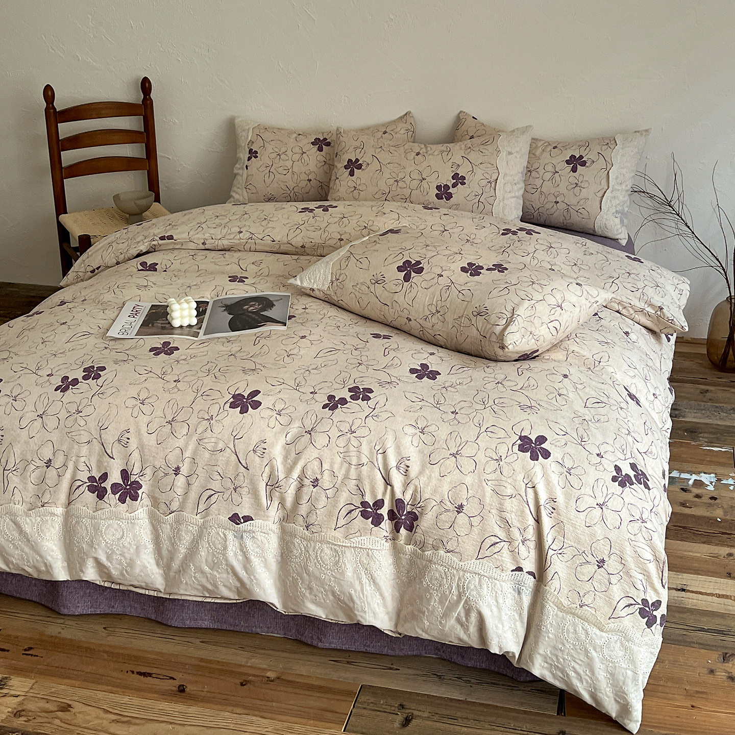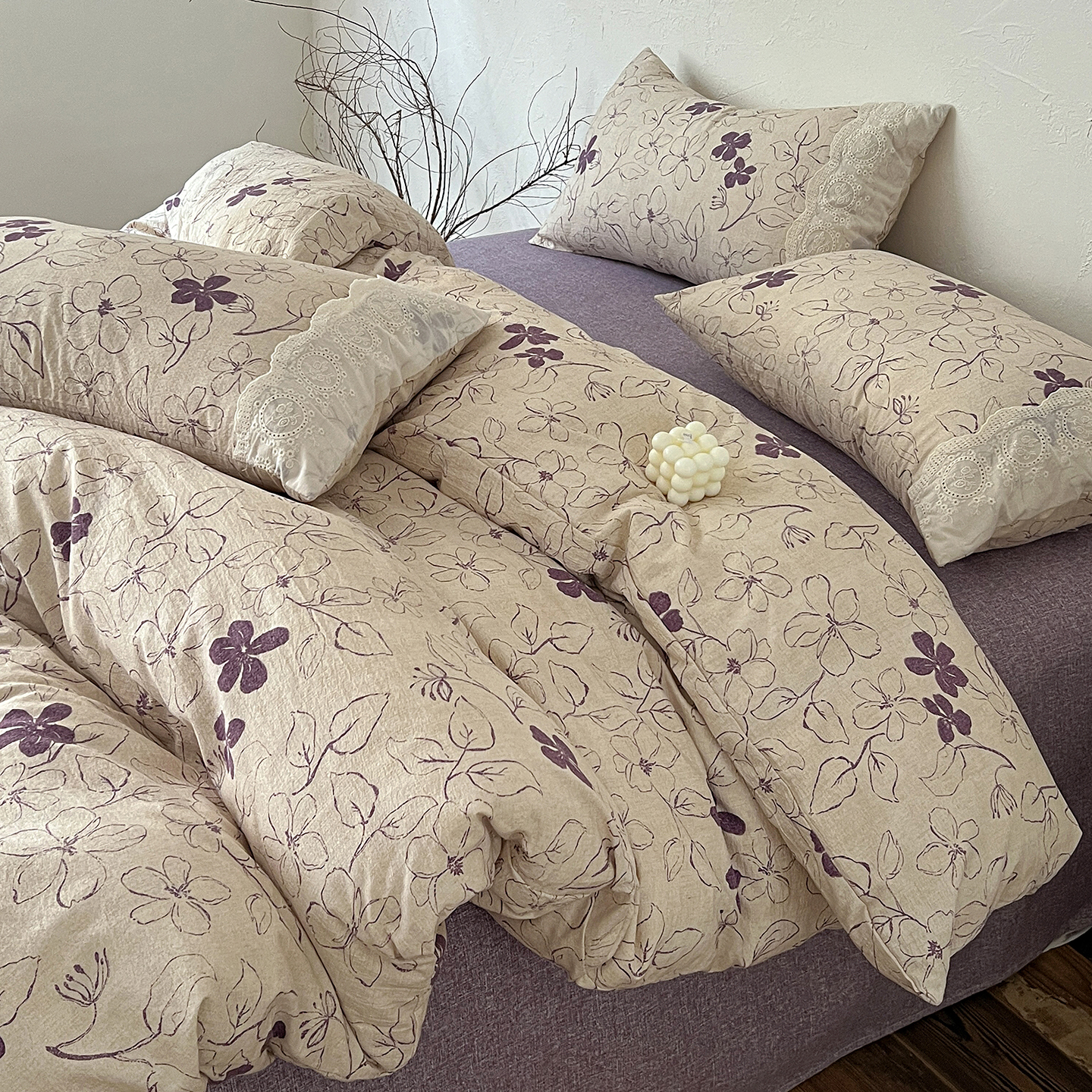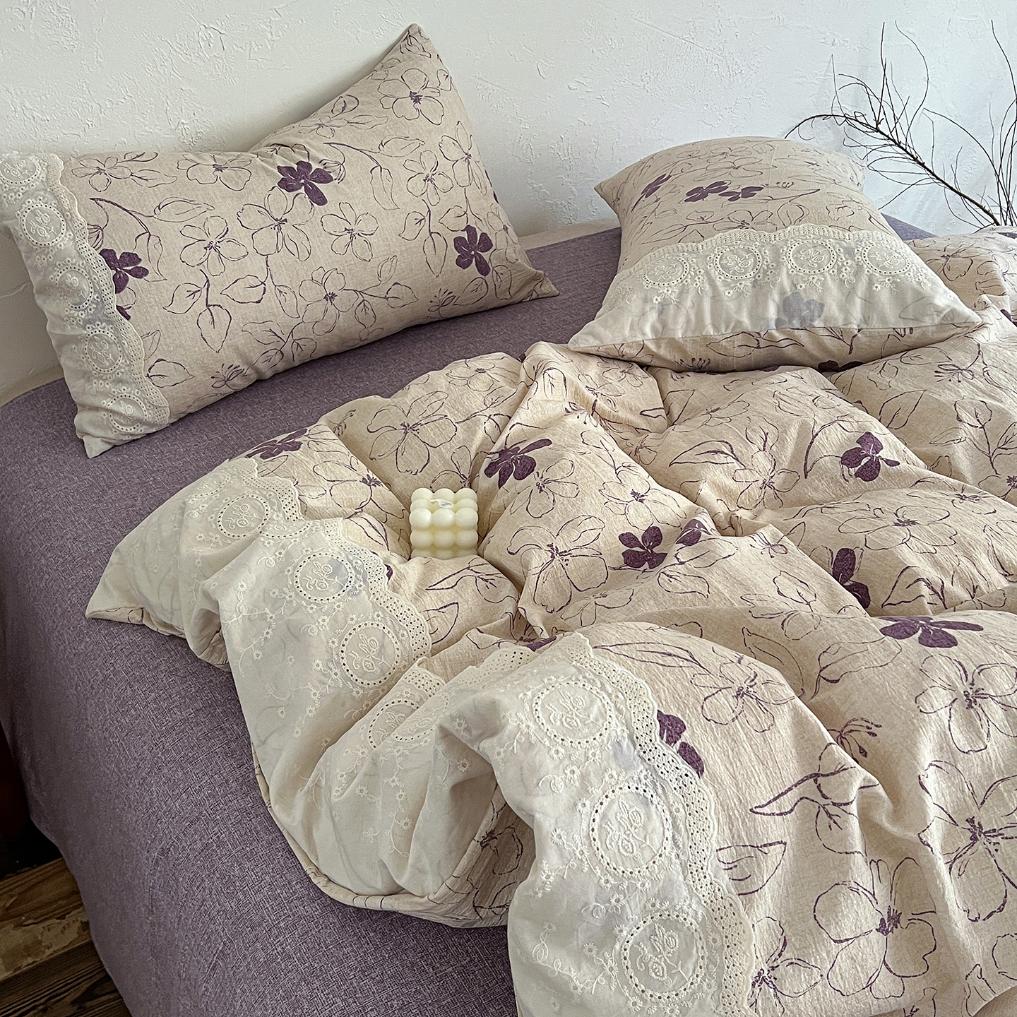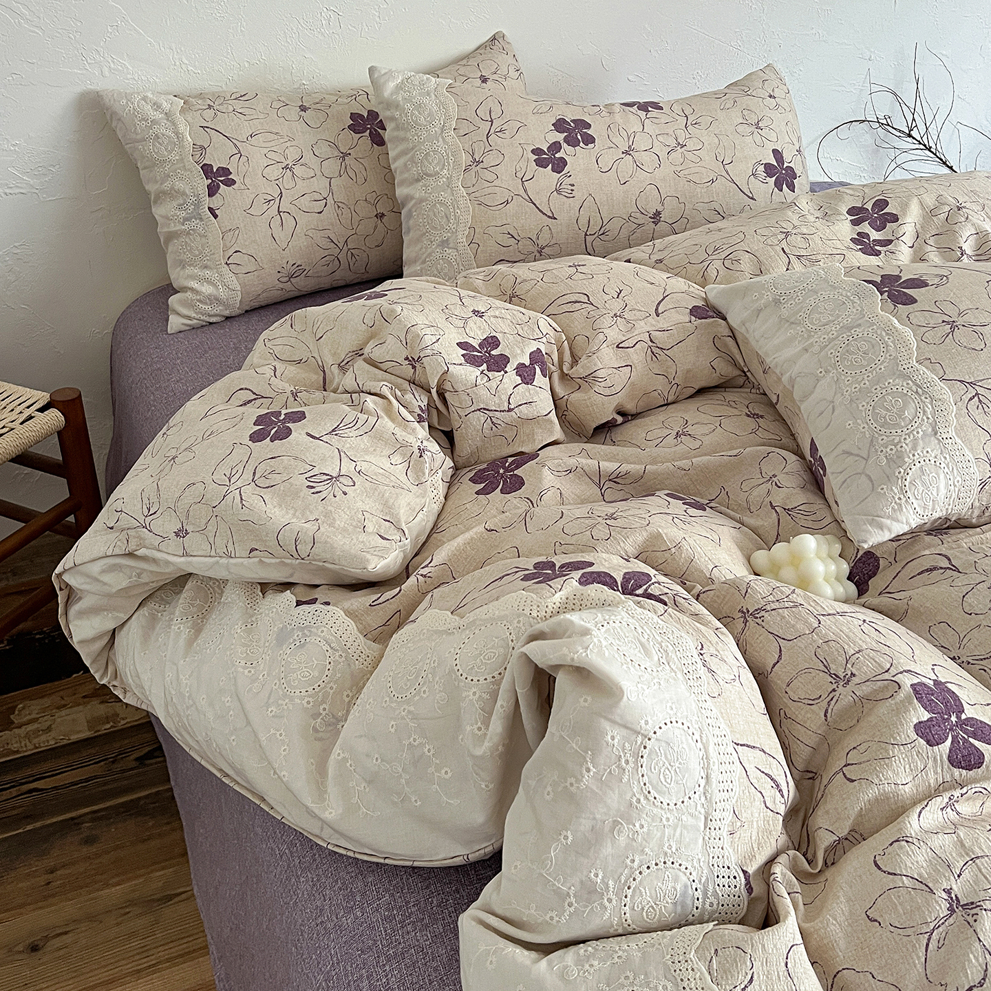 商品名称:一比一家纺 2026秋冬新品高克重原麻复古全棉花边棉麻侘寂风原麻四件套 (控价99元)约定紫