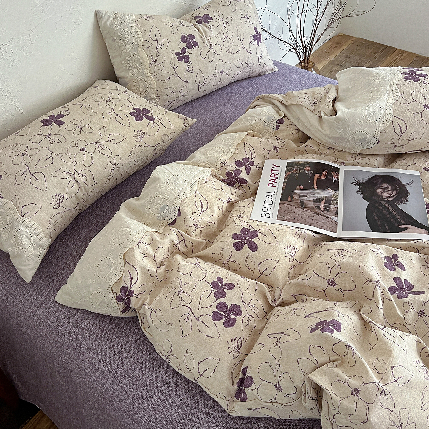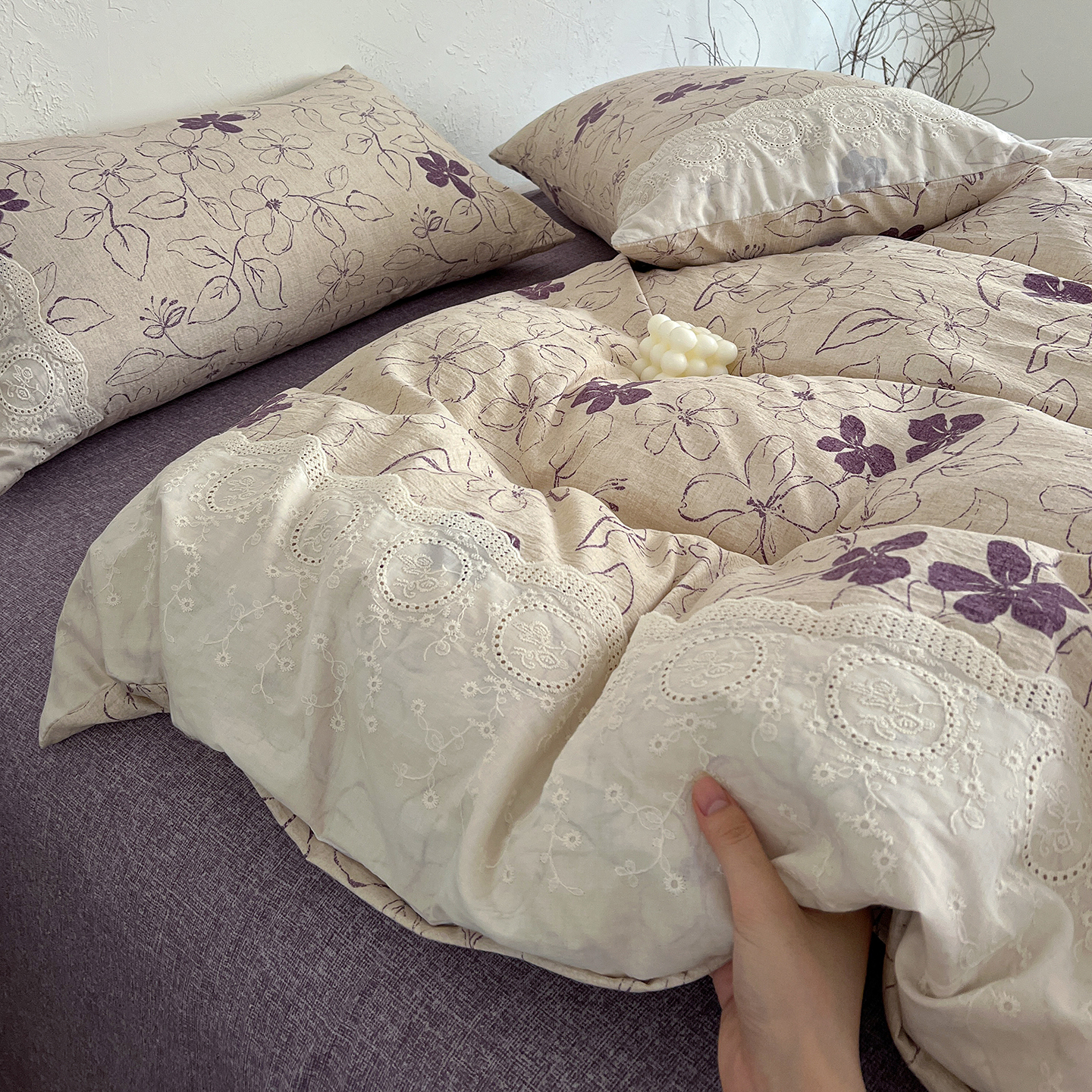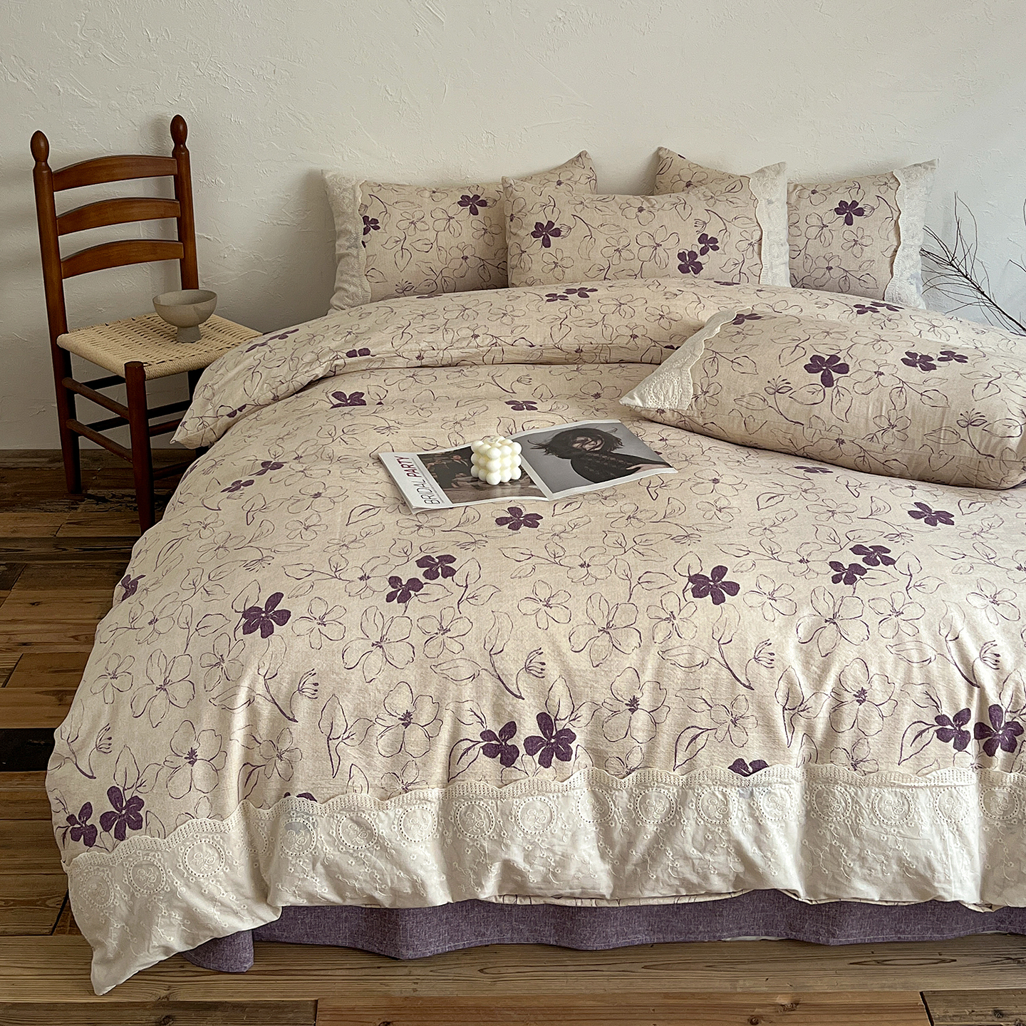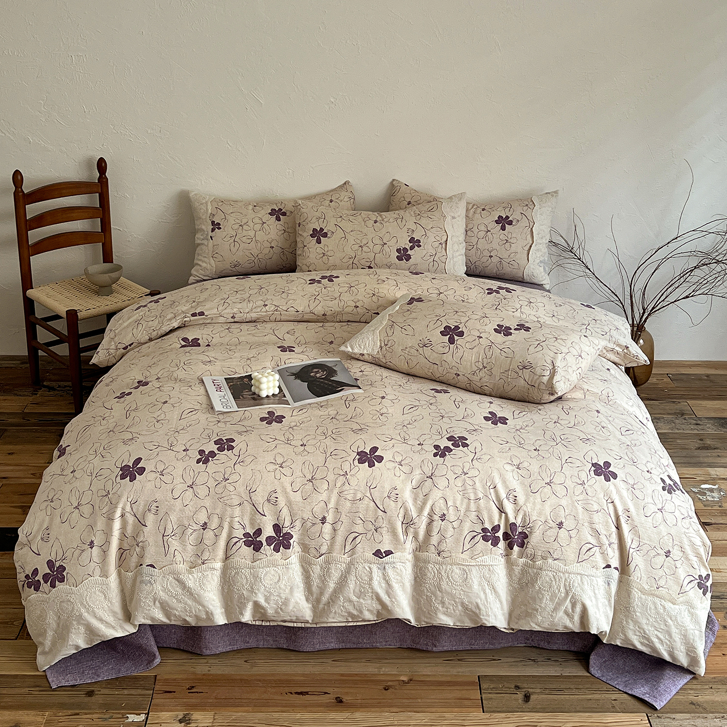商品名称:一比一家纺 2026秋冬新品高克重原麻复古全棉花边棉麻侘寂风原麻四件套 (控价99元)约定紫