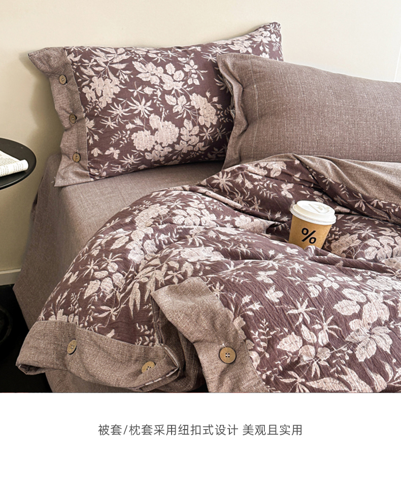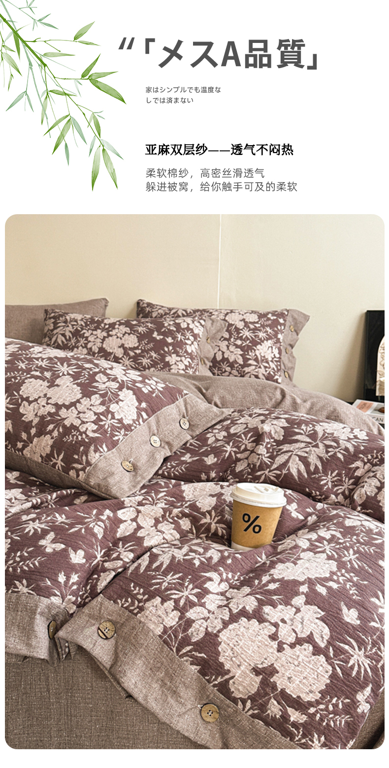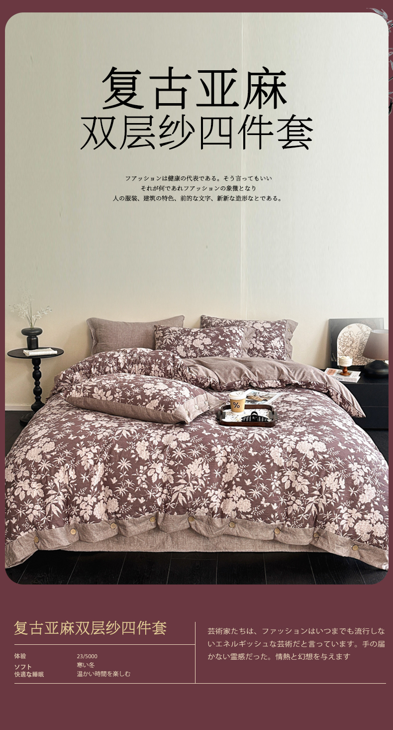 商品名称:七里香 2025秋冬新款A类加厚高克重亚麻复古风双层纱印花四件套 夕颜