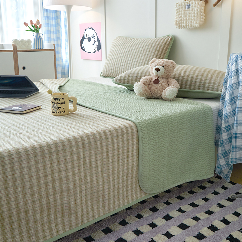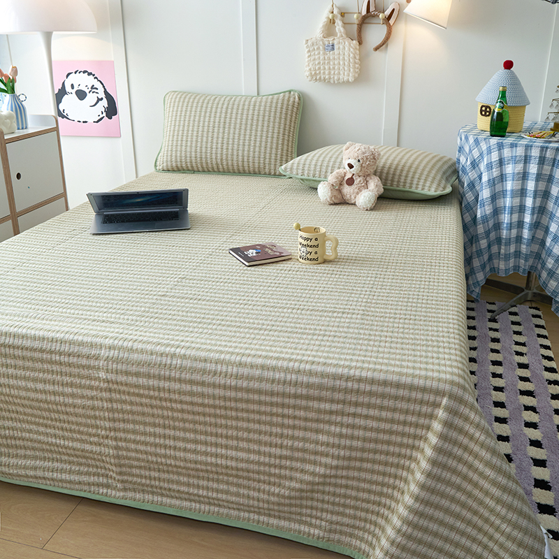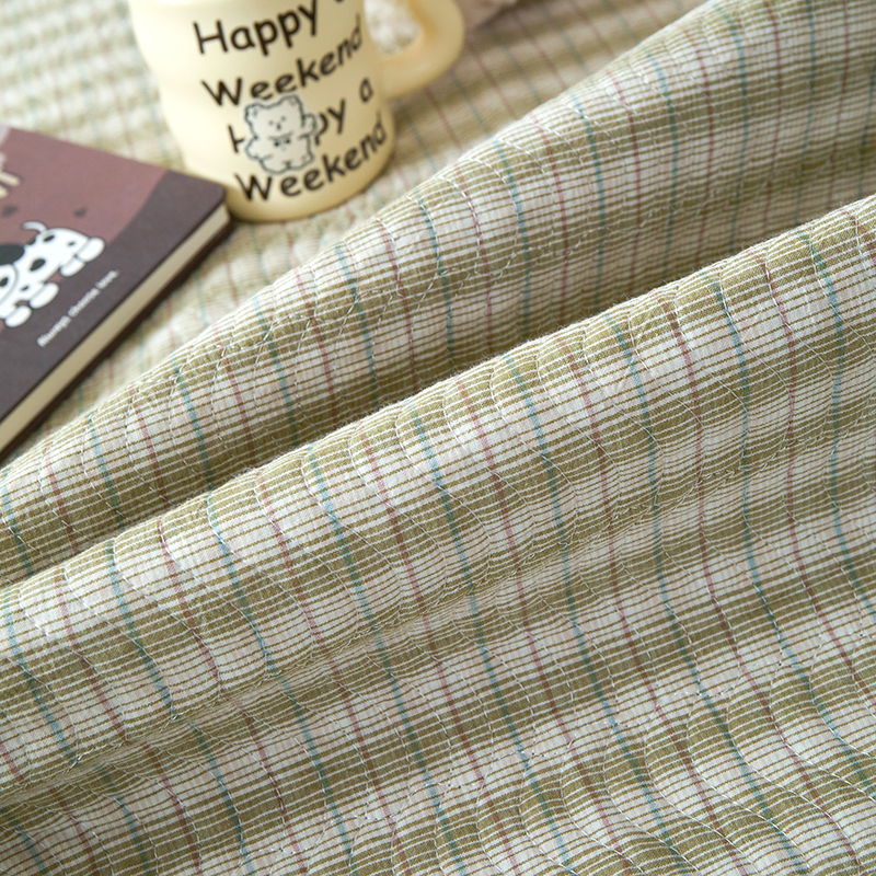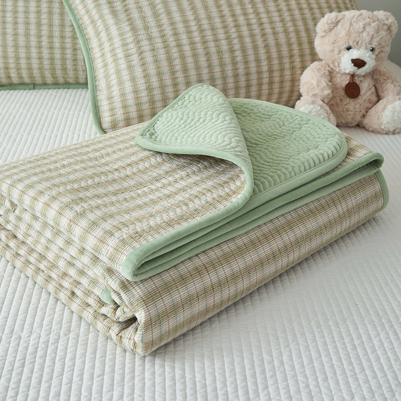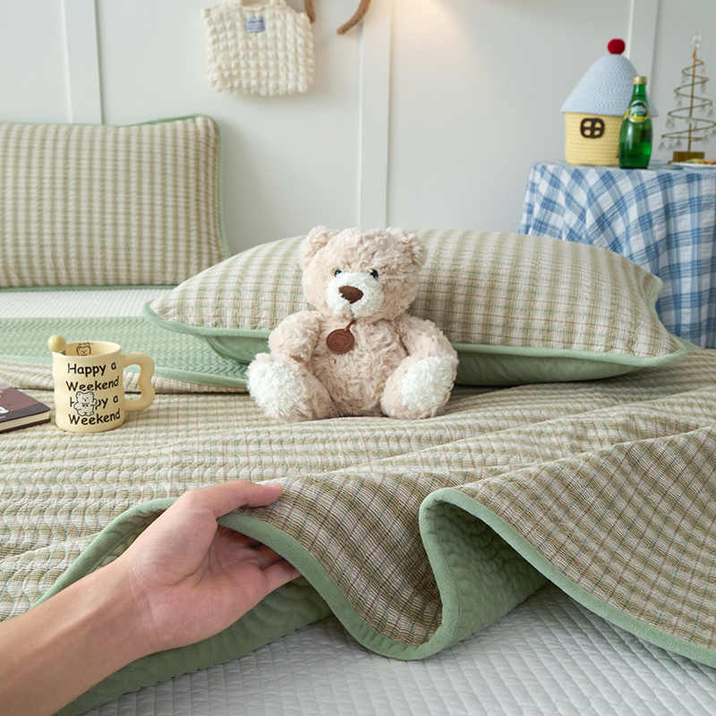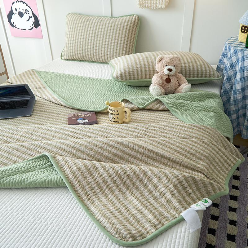 • 91家纺网 家纺一手货源 找家纺 沐纯家居 2025新款色织水洗棉棉绒(大豆纤维填充)床盖三件套 柠檬-绿