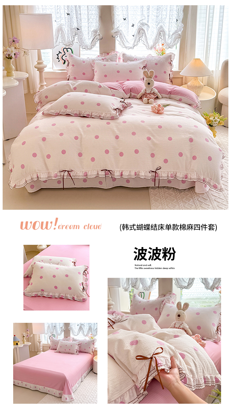 商品名称:韩约家纺 2025新款1韩式蝴蝶结加厚床单款棉麻四件套 诗雨
