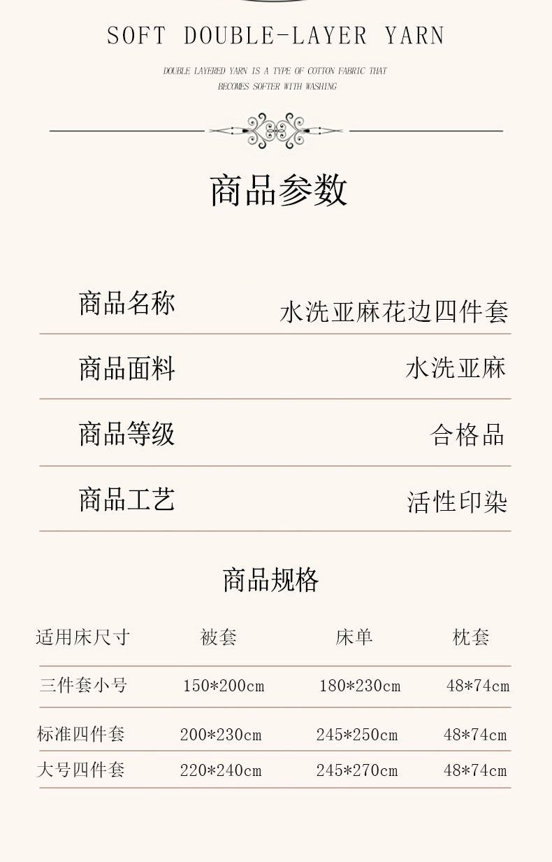 商品名称:大麦家纺 2025新款水洗亚麻花边四件套 香榭花园
