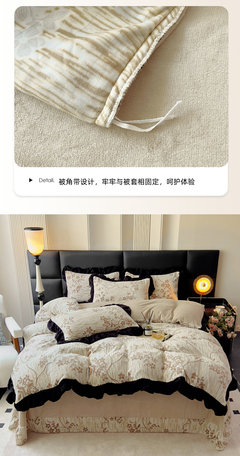 (总)找底底家纺 2025新款花边9-10斤牛奶绒床盖款四件套,花妖,梨花落,小樱桃,紫蔻