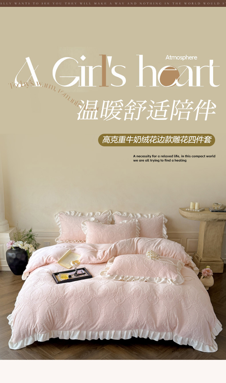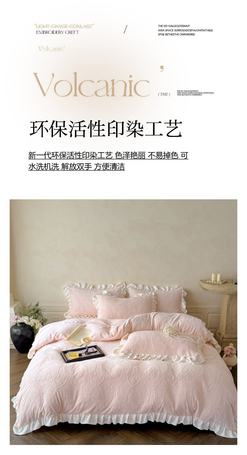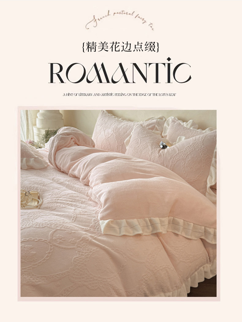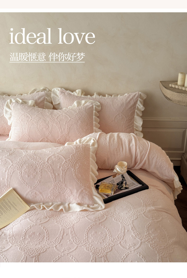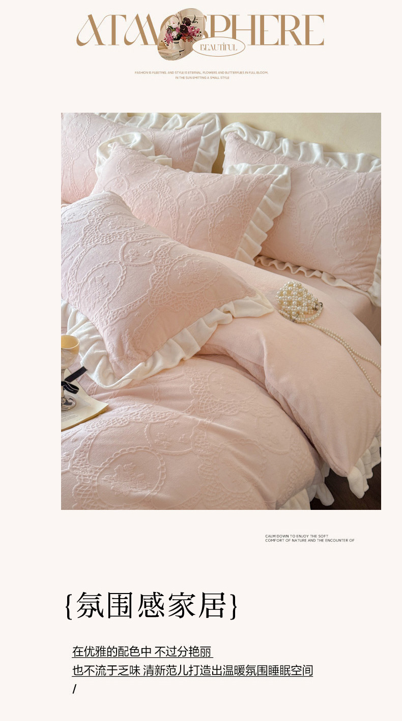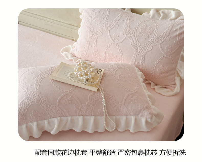商品名称:慕澄家纺 2025新款高克重牛奶绒花边款雕花四件套 安娜-甜粉