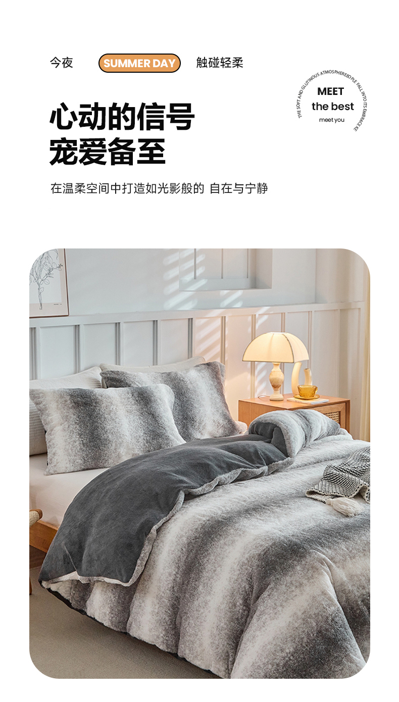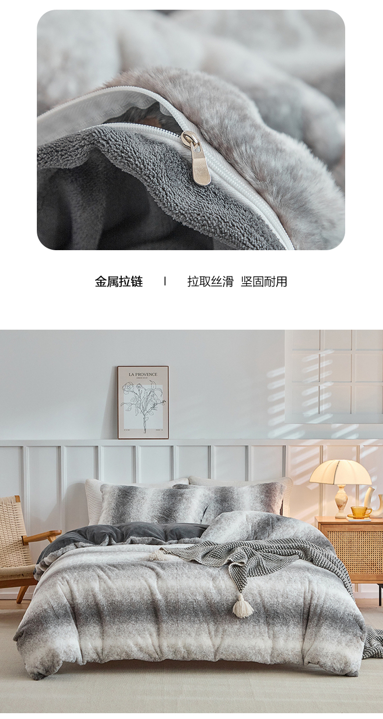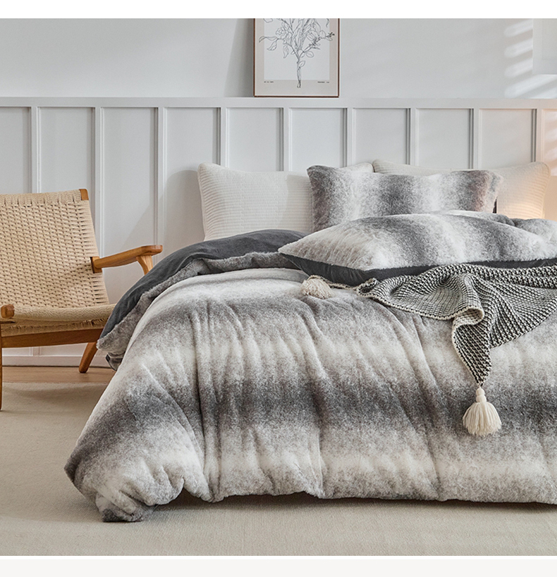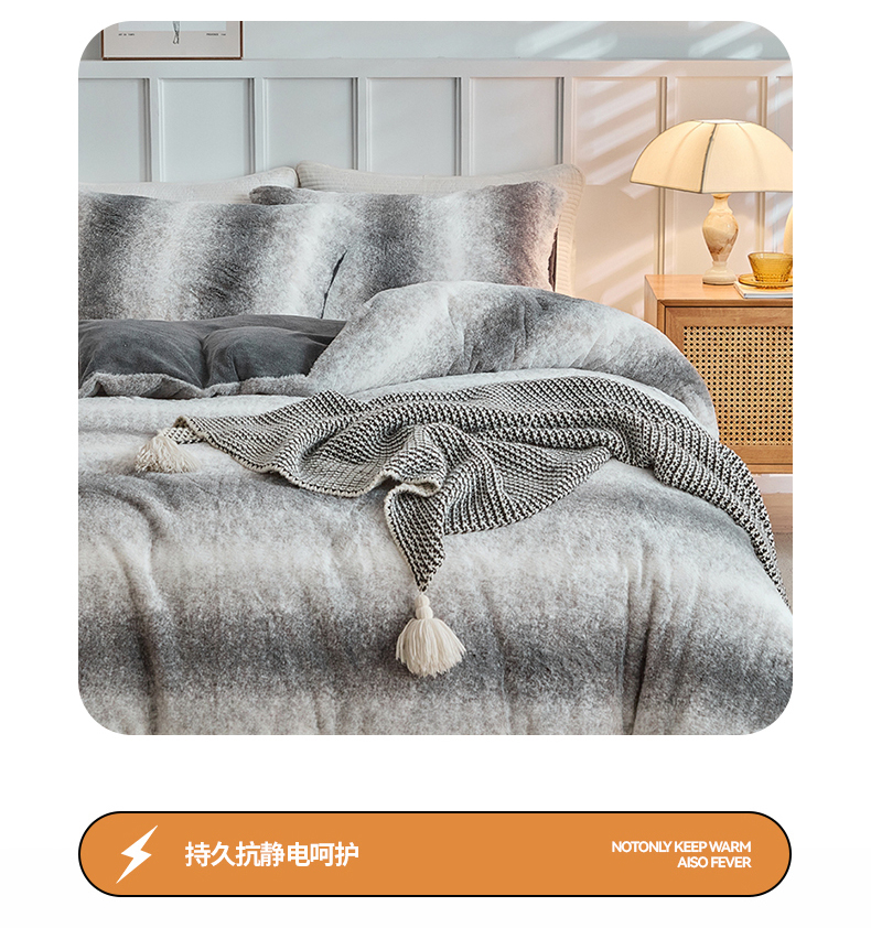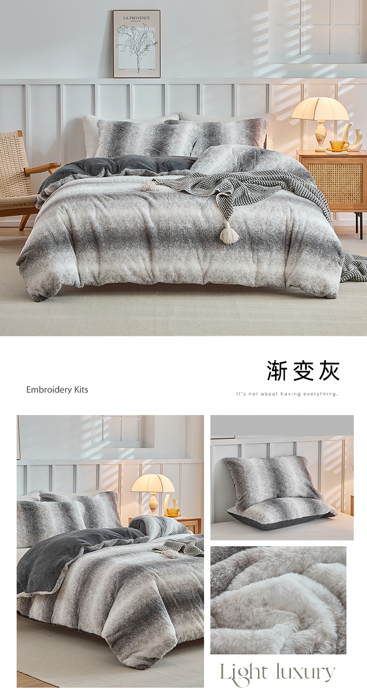 当前位置: 91家纺网 > 商品网购 > 毛毯休闲毯绒毯 > 毛毯 > 缘生活 2025新款仿兔毛绒渐变四件套 冬季专业产品 颜色简单大气 绒渐变四件套-灰色