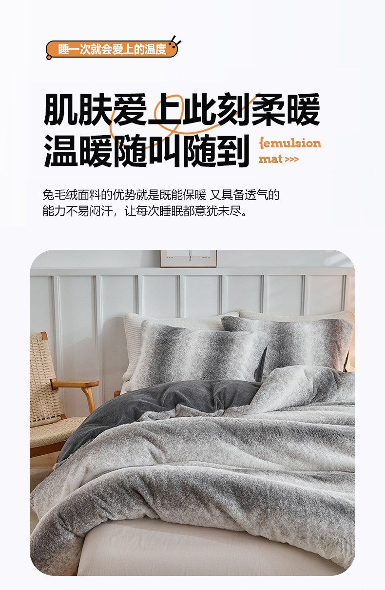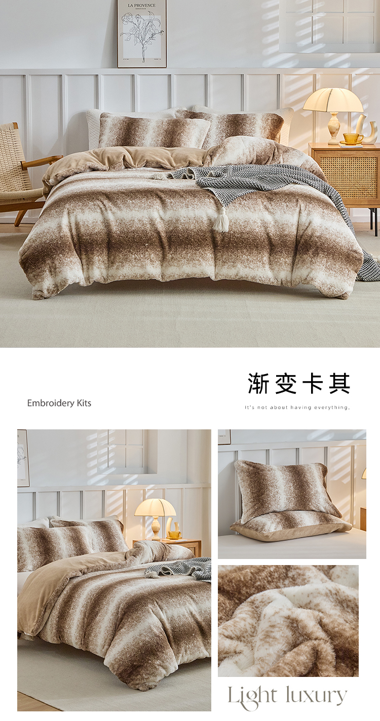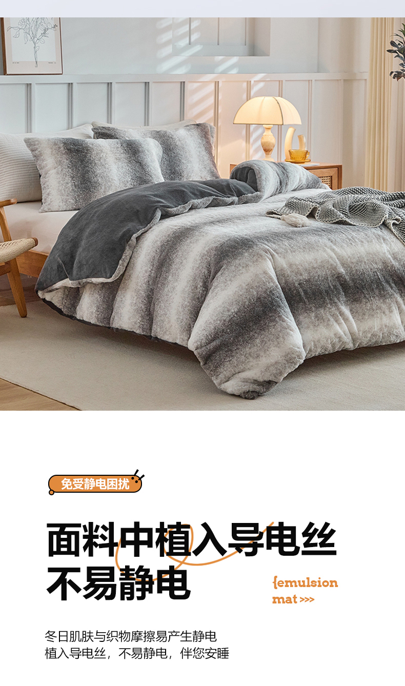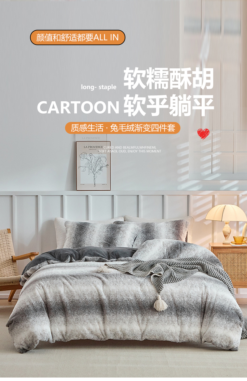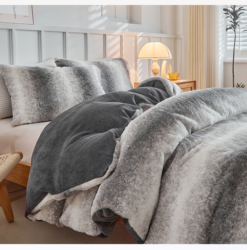 当前位置: 91家纺网 > 商品网购 > 毛毯休闲毯绒毯 > 毛毯 > 缘生活 2025新款仿兔毛绒渐变四件套 冬季专业产品 颜色简单大气 绒渐变四件套-灰色