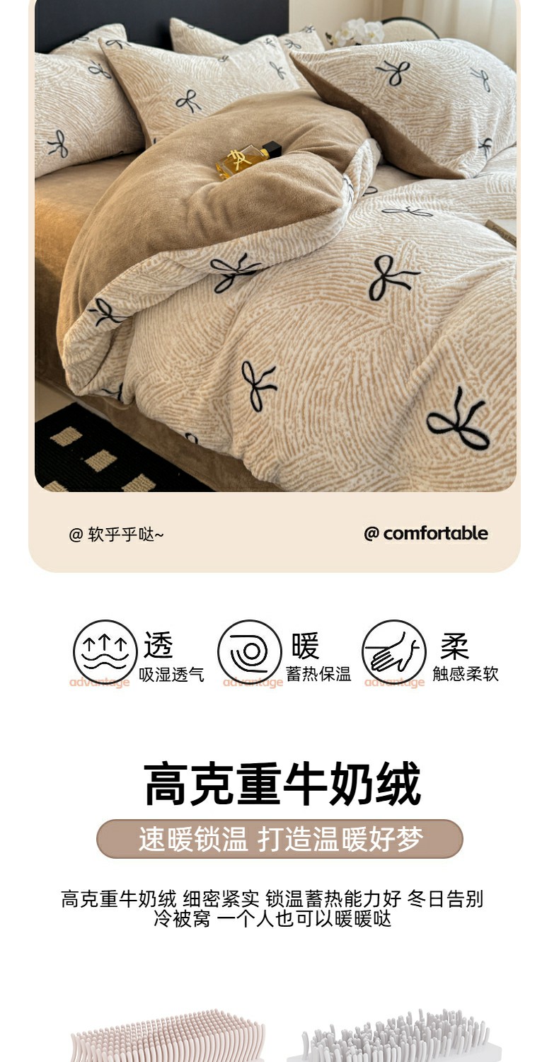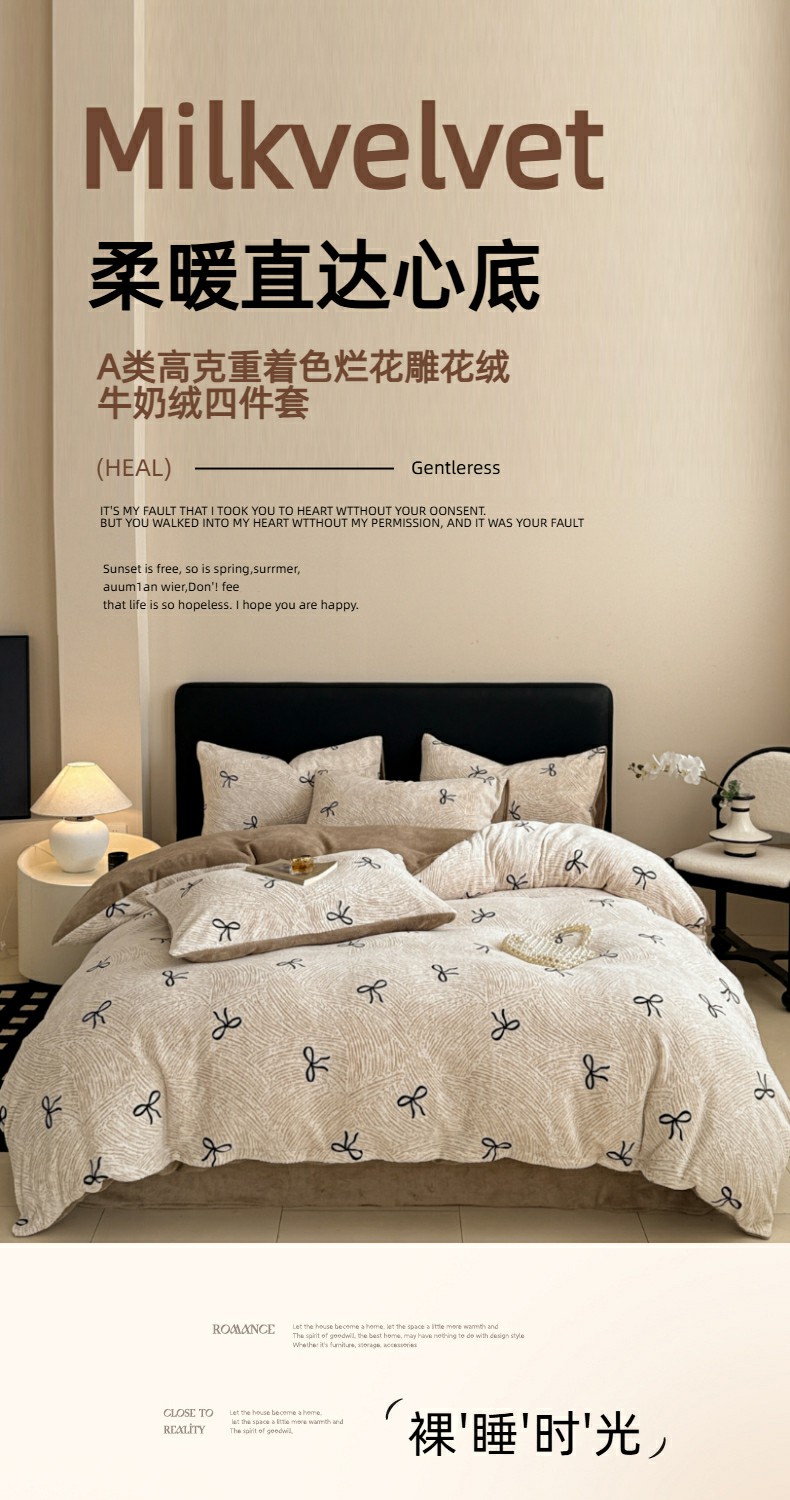 商品名称:呗旺鹿 2025新款A类高克重着色烂花雕花牛奶绒四件套 梦幻芭蕾卡其