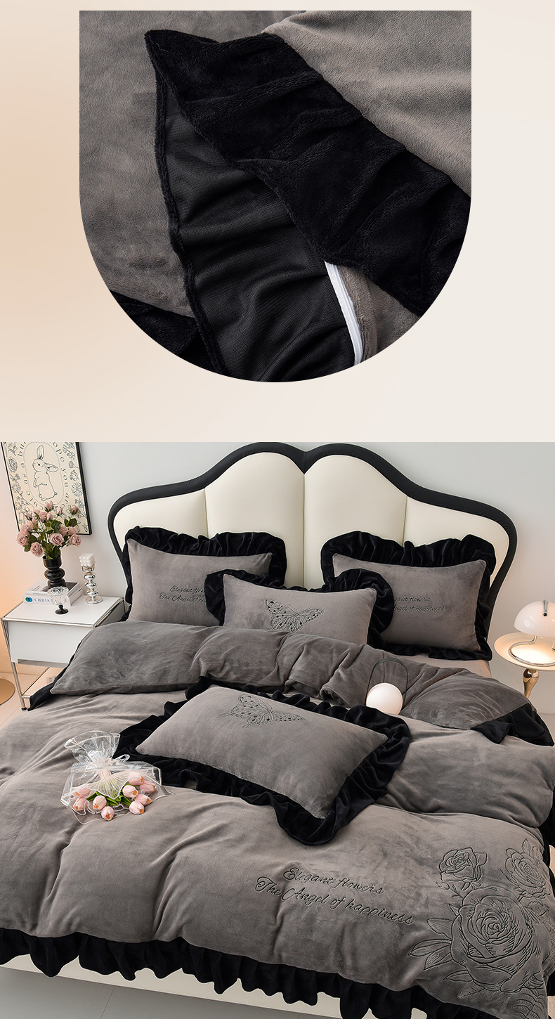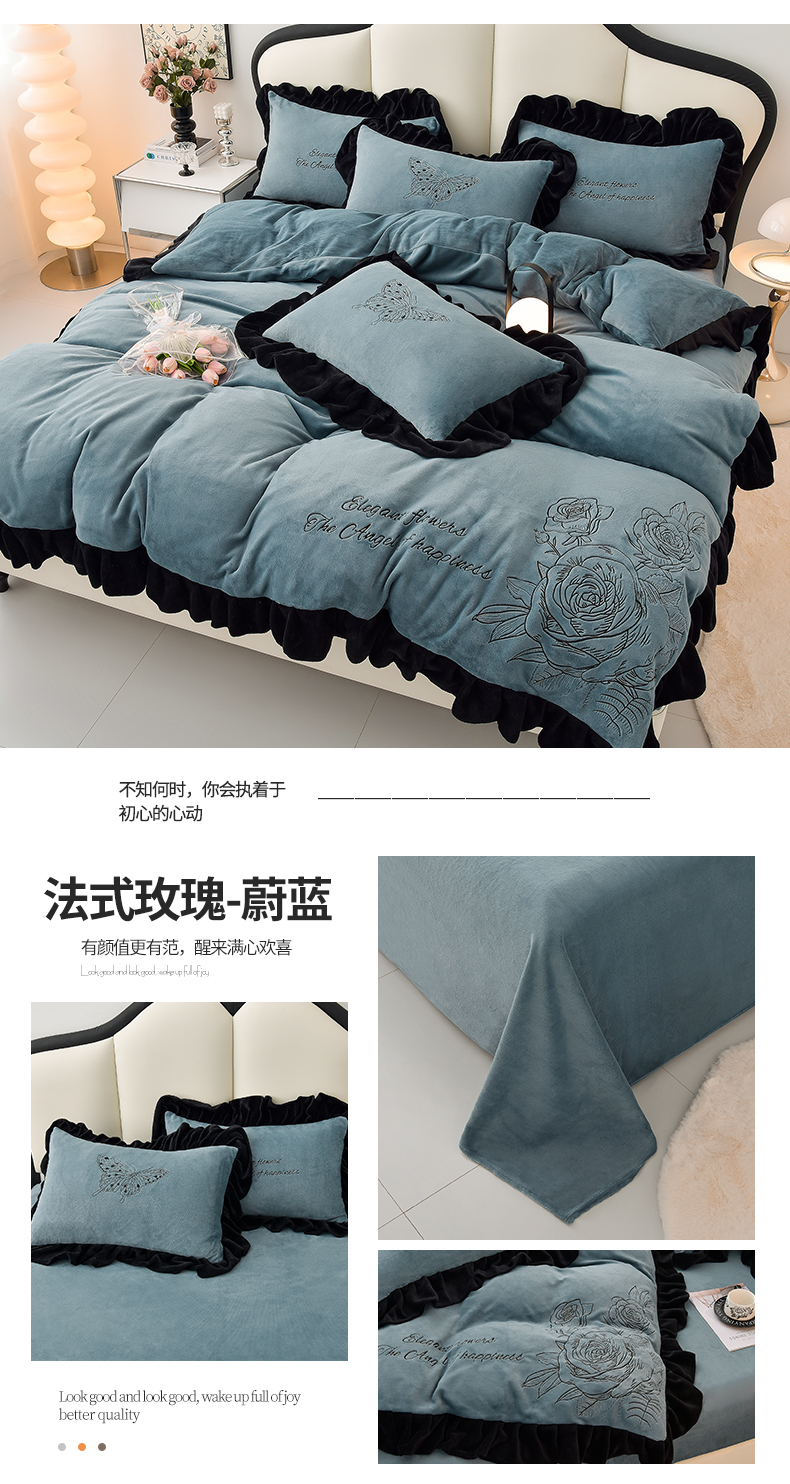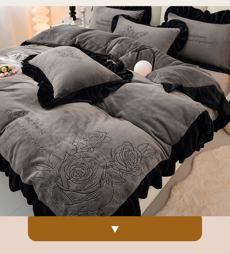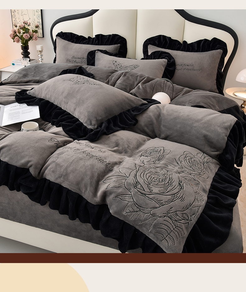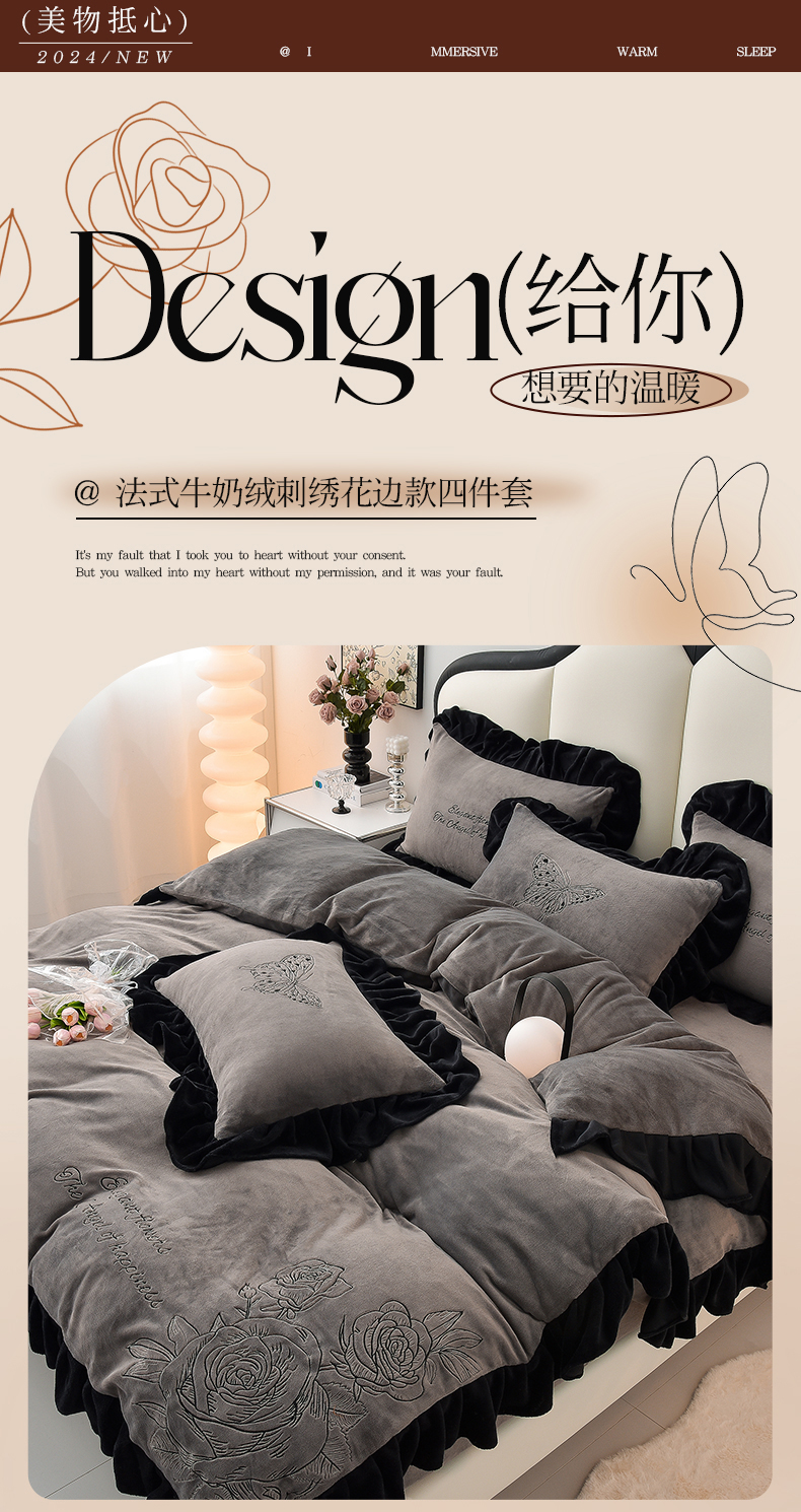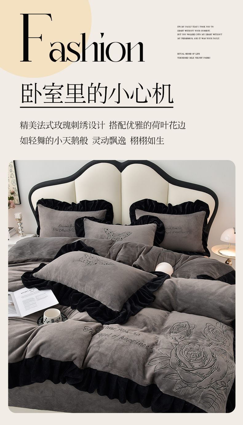 (总)炫拼家纺 2025新款刺绣黑花边高克重牛奶绒四件套-法式玫瑰