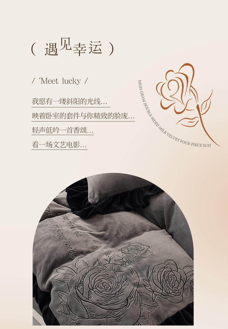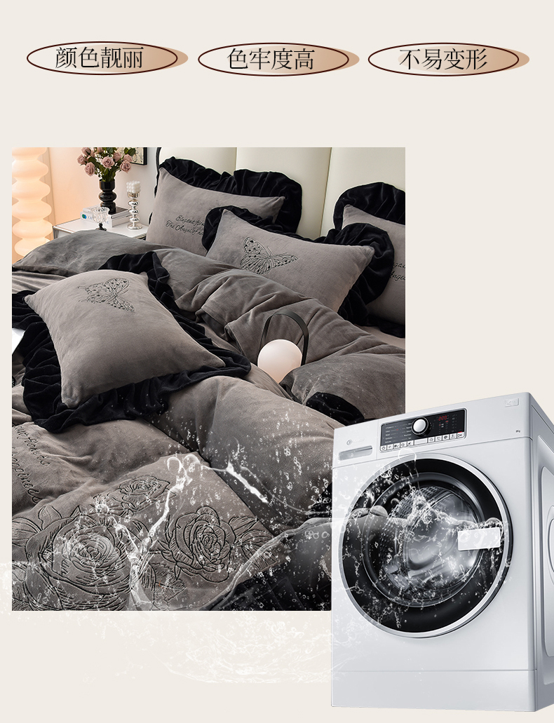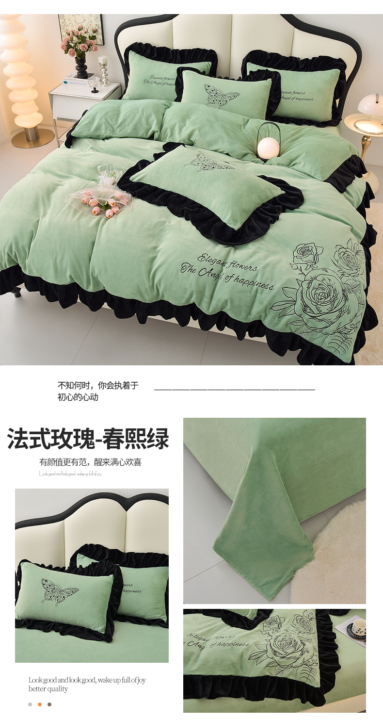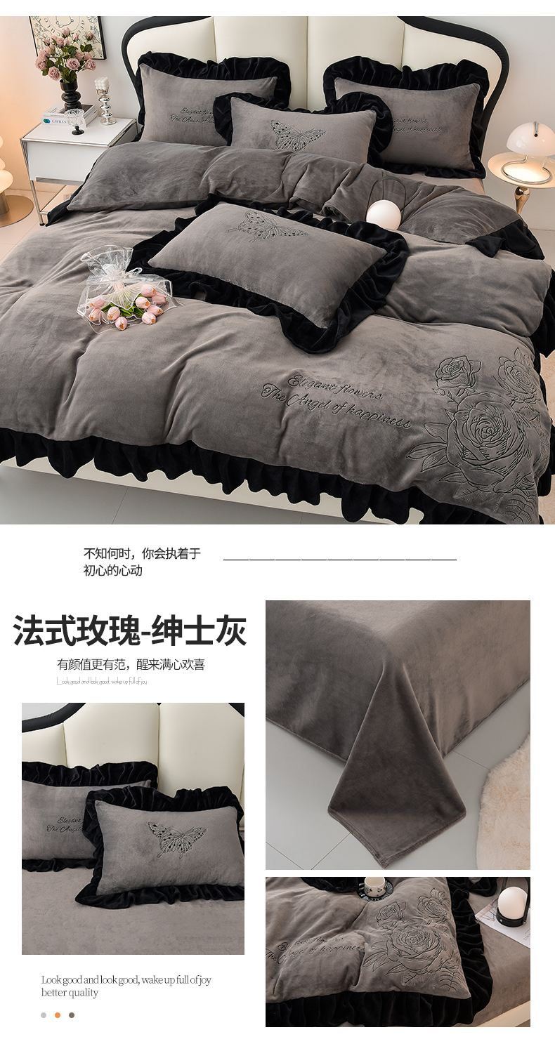 商品名称:(总)炫拼家纺 2025新款刺绣黑花边高克重牛奶绒四件套-法式玫瑰