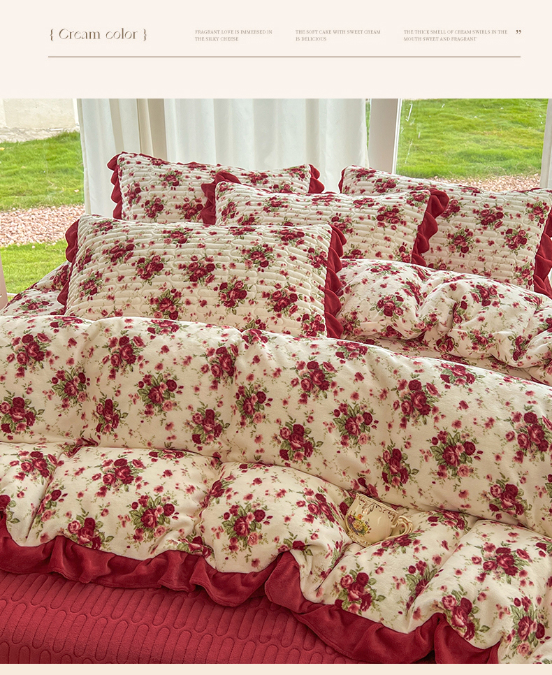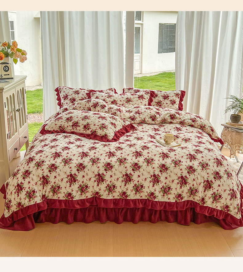美梦家纺 2025新款花边牛奶绒床盖四件套 向阳玫瑰-红