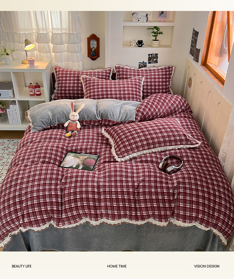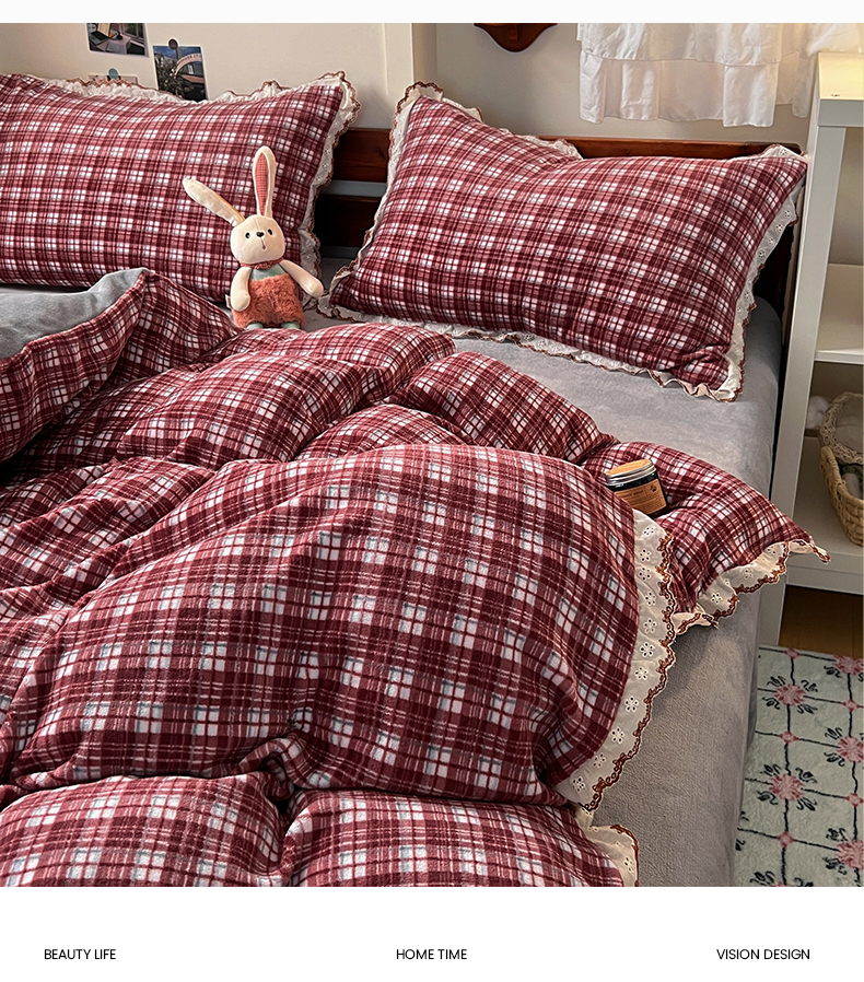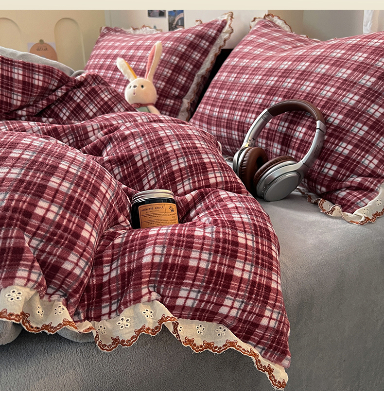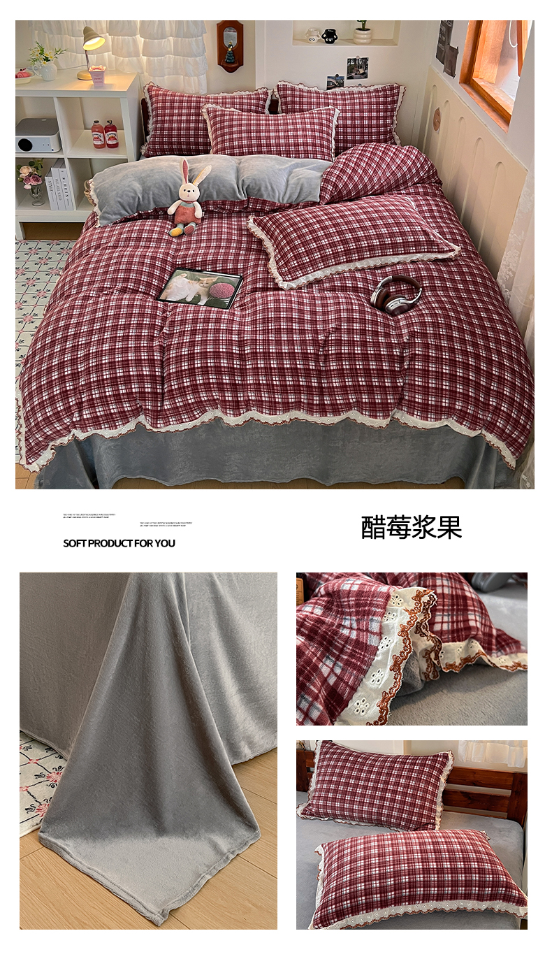 当前位置: 91家纺网 > 商品网购 > 床品套件 > 四件套 > 牛奶绒四件套 > 妖妖家纺 2025新款加厚全棉花边牛奶绒格子四件套 醋莓浆果