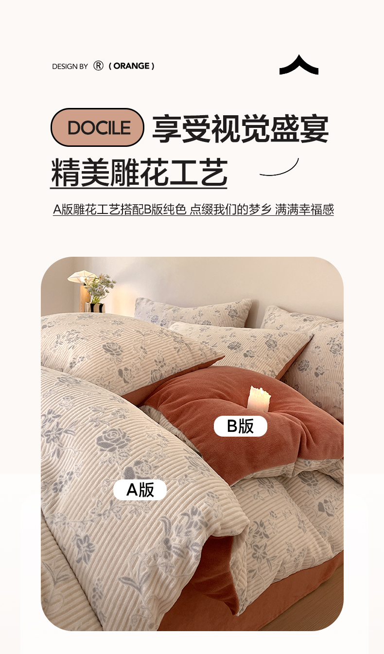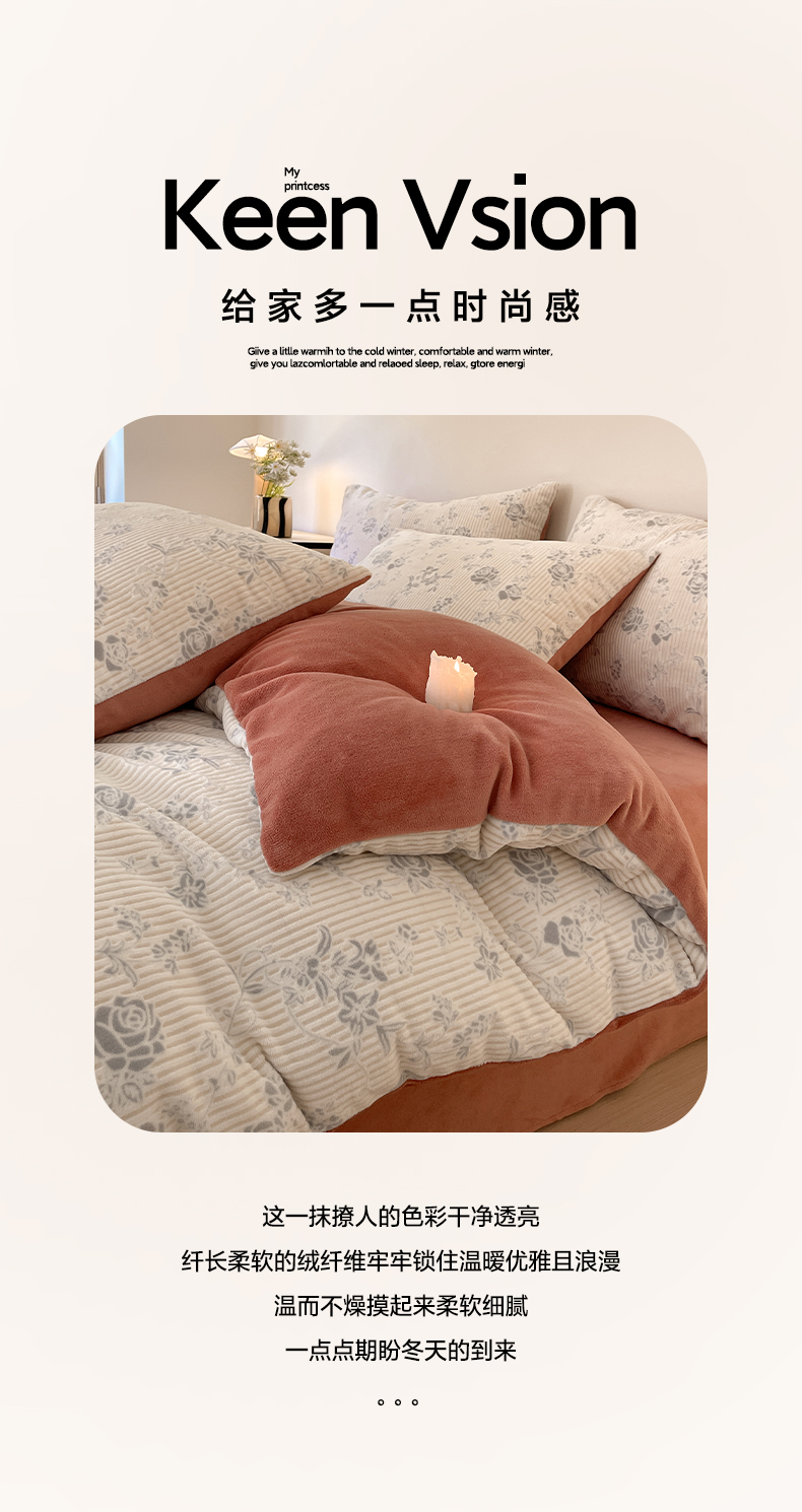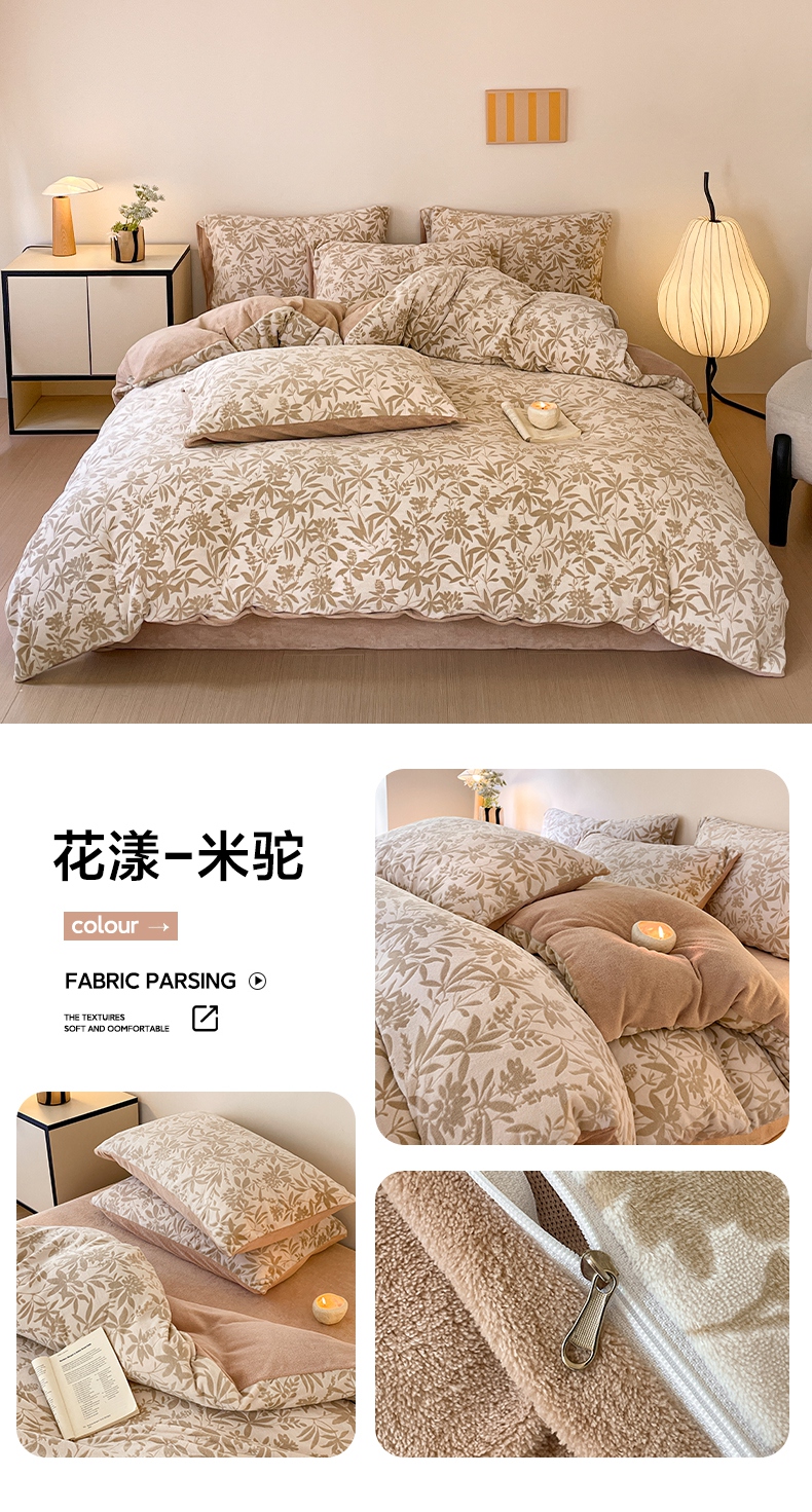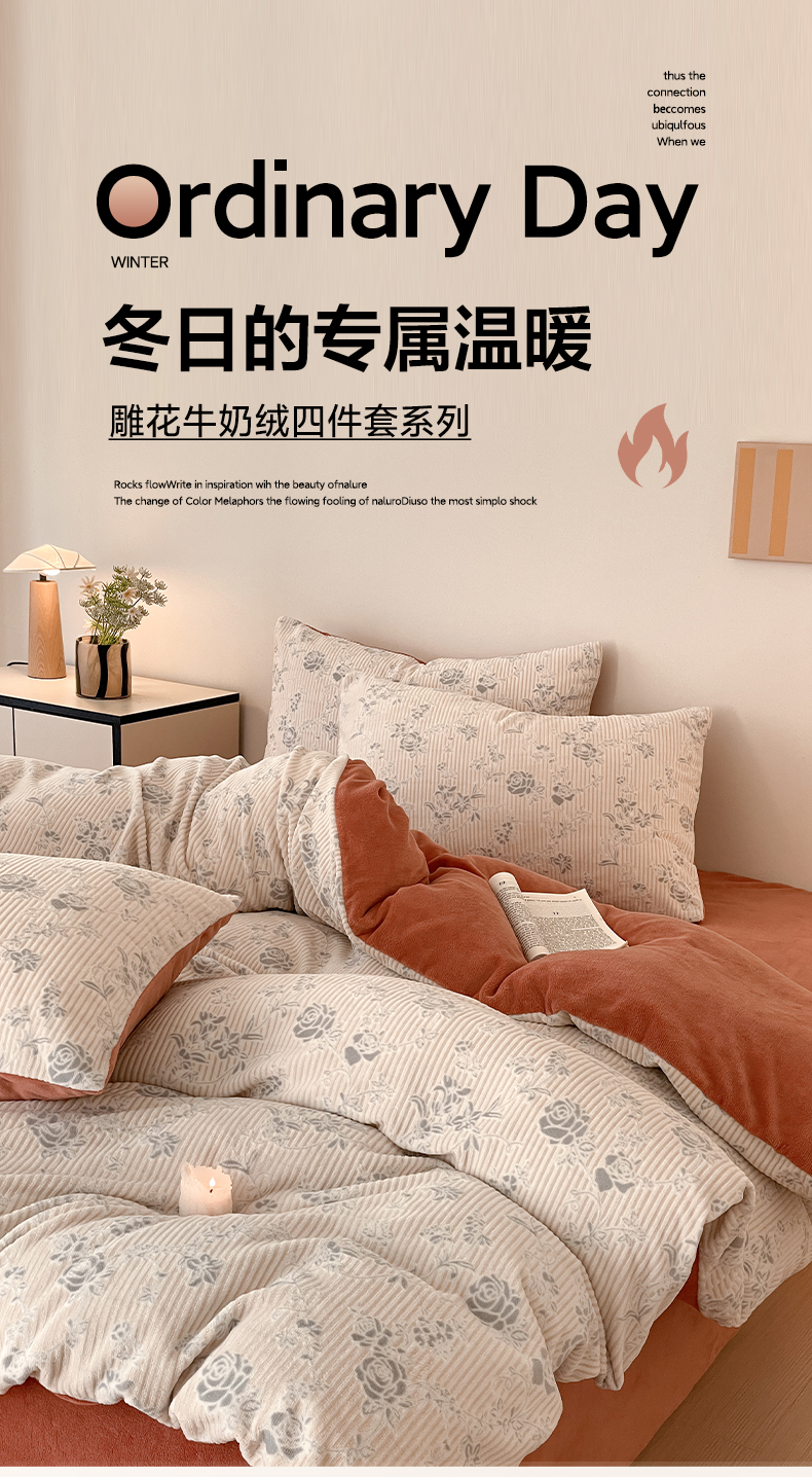 商品名称:雅居纺家纺 2025新款花卉雕花绒加厚保暖四件套 焦糖花朵