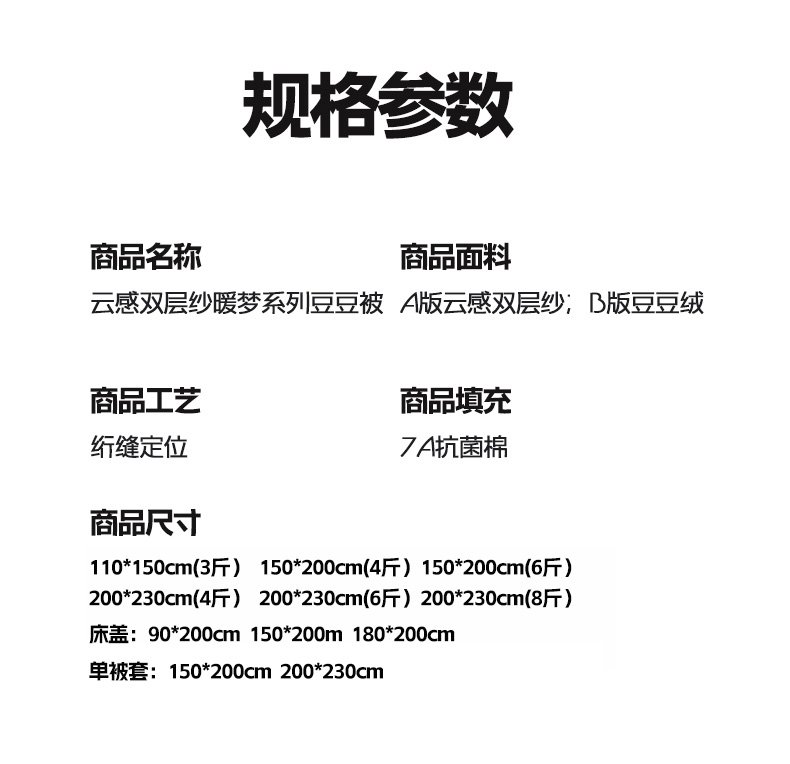 [{"sp_id":11,"sp_name":"\u989c\u8272\u5206\u7c7b","sp_format":2,"sp_list":[{"sp_value_id":1660,"sp_value_name":"\u6761\u6761\u5fc3","sp_value_image":{"id":999,"path":"https:\/\/img3.91jf.com\/ghelp\/2025\/20250911\/20250911104144_321487.jpeg"},"sp_value_video":{"id":0,"img":"","path":"","time":0,"download_num":0,"play_num":0},"price":"38.00","storage":6000,"weight":"1.500","is_check_weight":0,"plus_price":"","sp_sort":0}]},{"sp_id":24,"sp_name":"\u5e8a\u5355\/\u5e8a\u7b20\u5c3a\u5bf8","sp_format":1,"sp_list":[{"sp_value_id":1674,"sp_value_name":"110x150cm3\u65a4","sp_value_image":{"id":0,"path":""},"sp_value_video":{"id":0,"img":"","path":"","time":0,"download_num":0,"play_num":0},"price":"38.00","storage":0,"weight":"1.500","is_check_weight":0,"plus_price":"","sp_sort":0},{"sp_value_id":1675,"sp_value_name":"150x200cm4\u65a4","sp_value_image":{"id":0,"path":""},"sp_value_video":{"id":0,"img":"","path":"","time":0,"download_num":0,"play_num":0},"price":"45.00","storage":500,"weight":"2.000","is_check_weight":0,"plus_price":"","sp_sort":0},{"sp_value_id":1676,"sp_value_name":"150x200cm6\u65a4","sp_value_image":{"id":0,"path":""},"sp_value_video":{"id":0,"img":"","path":"","time":0,"download_num":0,"play_num":0},"price":"53.00","storage":500,"weight":"3.000","is_check_weight":0,"plus_price":"","sp_sort":0},{"sp_value_id":1677,"sp_value_name":"200x230cm4\u65a4","sp_value_image":{"id":0,"path":""},"sp_value_video":{"id":0,"img":"","path":"","time":0,"download_num":0,"play_num":0},"price":"50.00","storage":500,"weight":"2.000","is_check_weight":0,"plus_price":"","sp_sort":0},{"sp_value_id":1678,"sp_value_name":"200x230cm6\u65a4","sp_value_image":{"id":0,"path":""},"sp_value_video":{"id":0,"img":"","path":"","time":0,"download_num":0,"play_num":0},"price":"57.00","storage":500,"weight":"3.000","is_check_weight":0,"plus_price":"","sp_sort":0},{"sp_value_id":1679,"sp_value_name":"200x230cm8\u65a4","sp_value_image":{"id":0,"path":""},"sp_value_video":{"id":0,"img":"","path":"","time":0,"download_num":0,"play_num":0},"price":"65.00","storage":500,"weight":"4.000","is_check_weight":0,"plus_price":"","sp_sort":0},{"sp_value_id":1680,"sp_value_name":"90x200cm\u5355\u5e8a\u76d6","sp_value_image":{"id":0,"path":""},"sp_value_video":{"id":0,"img":"","path":"","time":0,"download_num":0,"play_num":0},"price":"36.00","storage":0,"weight":"1.000","is_check_weight":0,"plus_price":"","sp_sort":0},{"sp_value_id":1681,"sp_value_name":"150x200cm\u5355\u5e8a\u76d6","sp_value_image":{"id":0,"path":""},"sp_value_video":{"id":0,"img":"","path":"","time":0,"download_num":0,"play_num":0},"price":"43.00","storage":500,"weight":"1.000","is_check_weight":0,"plus_price":"","sp_sort":0},{"sp_value_id":1682,"sp_value_name":"180x200cm\u5355\u5e8a\u76d6","sp_value_image":{"id":0,"path":""},"sp_value_video":{"id":0,"img":"","path":"","time":0,"download_num":0,"play_num":0},"price":"48.00","storage":500,"weight":"1.000","is_check_weight":0,"plus_price":"","sp_sort":0},{"sp_value_id":1683,"sp_value_name":"150x200cm\u8c46\u8c46\u5355\u88ab\u5957","sp_value_image":{"id":0,"path":""},"sp_value_video":{"id":0,"img":"","path":"","time":0,"download_num":0,"play_num":0},"price":"33.00","storage":500,"weight":"2.000","is_check_weight":0,"plus_price":"","sp_sort":0},{"sp_value_id":1684,"sp_value_name":"200x230cm\u8c46\u8c46\u5355\u88ab\u5957","sp_value_image":{"id":0,"path":""},"sp_value_video":{"id":0,"img":"","path":"","time":0,"download_num":0,"play_num":0},"price":"36.00","storage":500,"weight":"2.000","is_check_weight":0,"plus_price":"","sp_sort":0},{"sp_value_id":1685,"sp_value_name":"90x200cm\u5355\u5e8a\u76d6+\u6795\u5957\u4e00\u53ea","sp_value_image":{"id":0,"path":""},"sp_value_video":{"id":0,"img":"","path":"","time":0,"download_num":0,"play_num":0},"price":"45.00","storage":0,"weight":"2.000","is_check_weight":0,"plus_price":"","sp_sort":0},{"sp_value_id":1686,"sp_value_name":"150x200cm\u5355\u5e8a\u76d6+\u6795\u5957\u4e24\u53ea","sp_value_image":{"id":0,"path":""},"sp_value_video":{"id":0,"img":"","path":"","time":0,"download_num":0,"play_num":0},"price":"61.00","storage":500,"weight":"3.000","is_check_weight":0,"plus_price":"","sp_sort":0},{"sp_value_id":1687,"sp_value_name":"180x200cm\u5355\u5e8a\u76d6+\u6795\u5957\u4e24\u53ea","sp_value_image":{"id":0,"path":""},"sp_value_video":{"id":0,"img":"","path":"","time":0,"download_num":0,"play_num":0},"price":"66.00","storage":500,"weight":"3.000","is_check_weight":0,"plus_price":"","sp_sort":0},{"sp_value_id":1688,"sp_value_name":"48x74cm\u5355\u6795\u5957\u4e00\u5bf9","sp_value_image":{"id":0,"path":""},"sp_value_video":{"id":0,"img":"","path":"","time":0,"download_num":0,"play_num":0},"price":"18.00","storage":500,"weight":"0.500","is_check_weight":0,"plus_price":"","sp_sort":0}]}]
