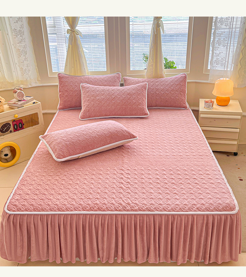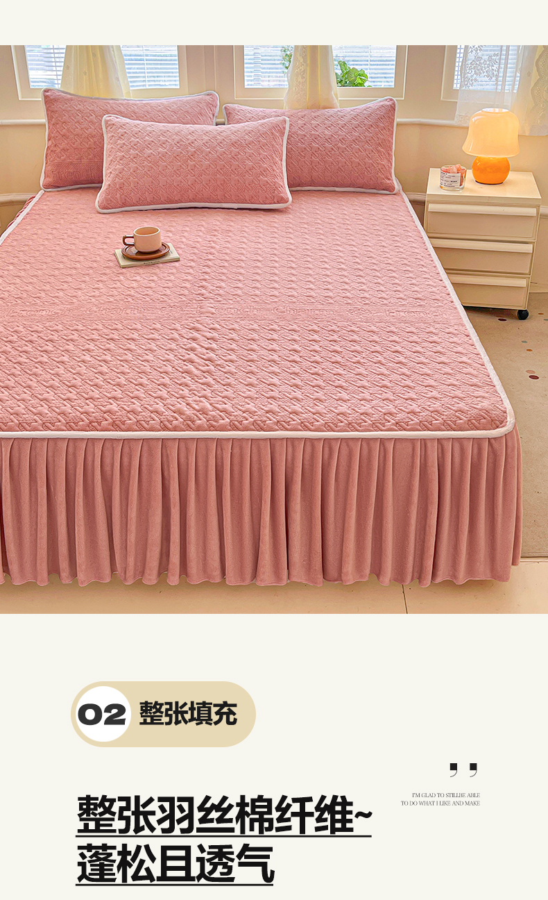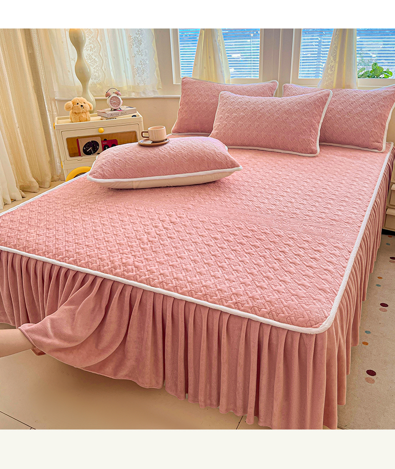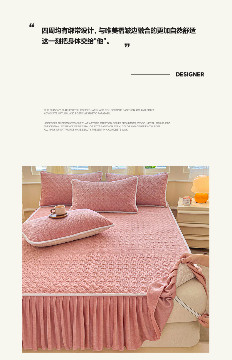 卡伦家纺 2025新款抗菌雕花牛奶绒千鸟格夹棉床裙系列 千鸟格床笠-粉