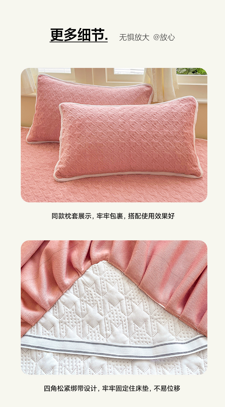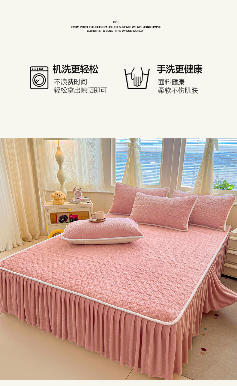 • 91家纺网 家纺一手货源 找家纺 卡伦家纺 2025新款抗菌雕花牛奶绒千鸟格夹棉床裙系列 千鸟格床笠-粉