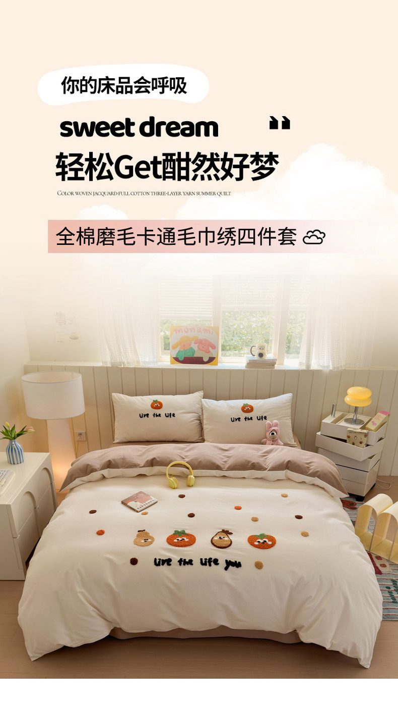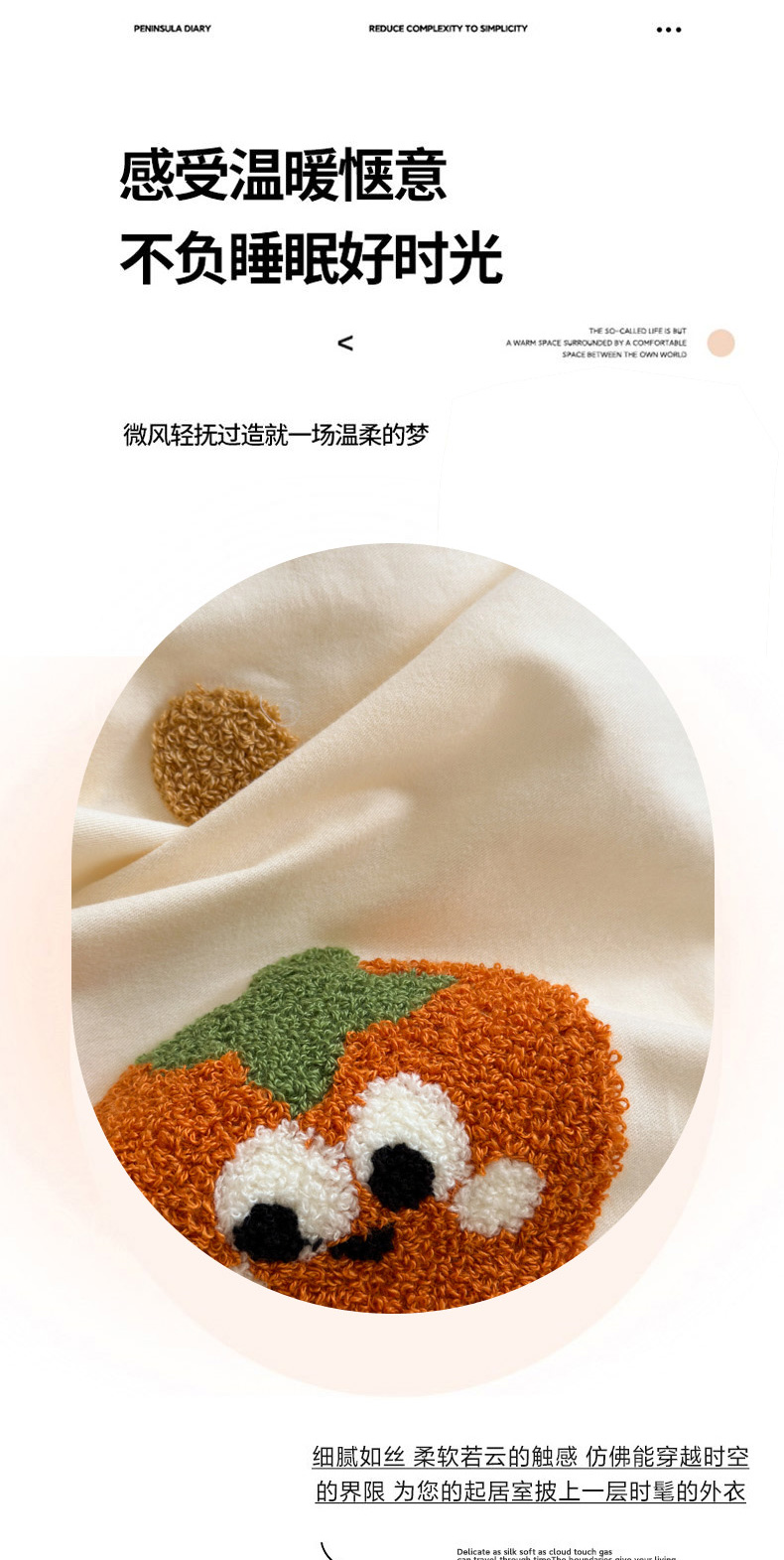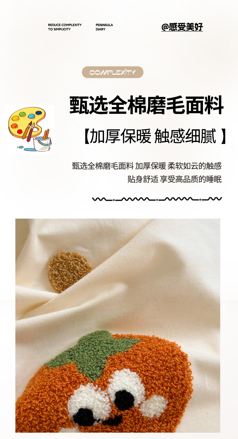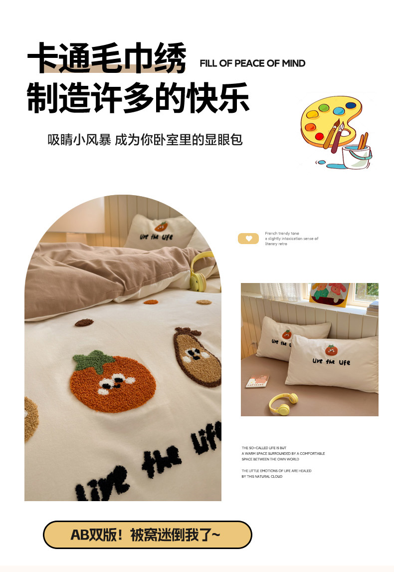 当前位置: 91家纺网 > 商品网购 > 床品套件 > 四件套 > 毛巾绣四件套 > 如意朵 2025新款全棉磨毛卡通毛巾绣四件套(专版花型)-场景二 好柿发生