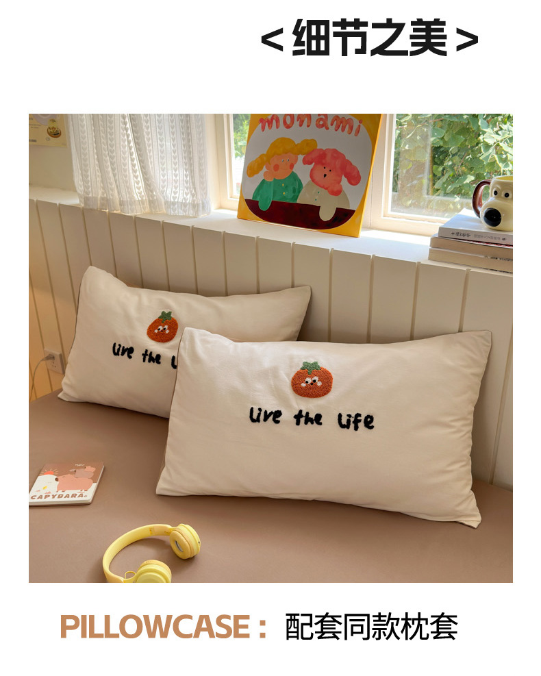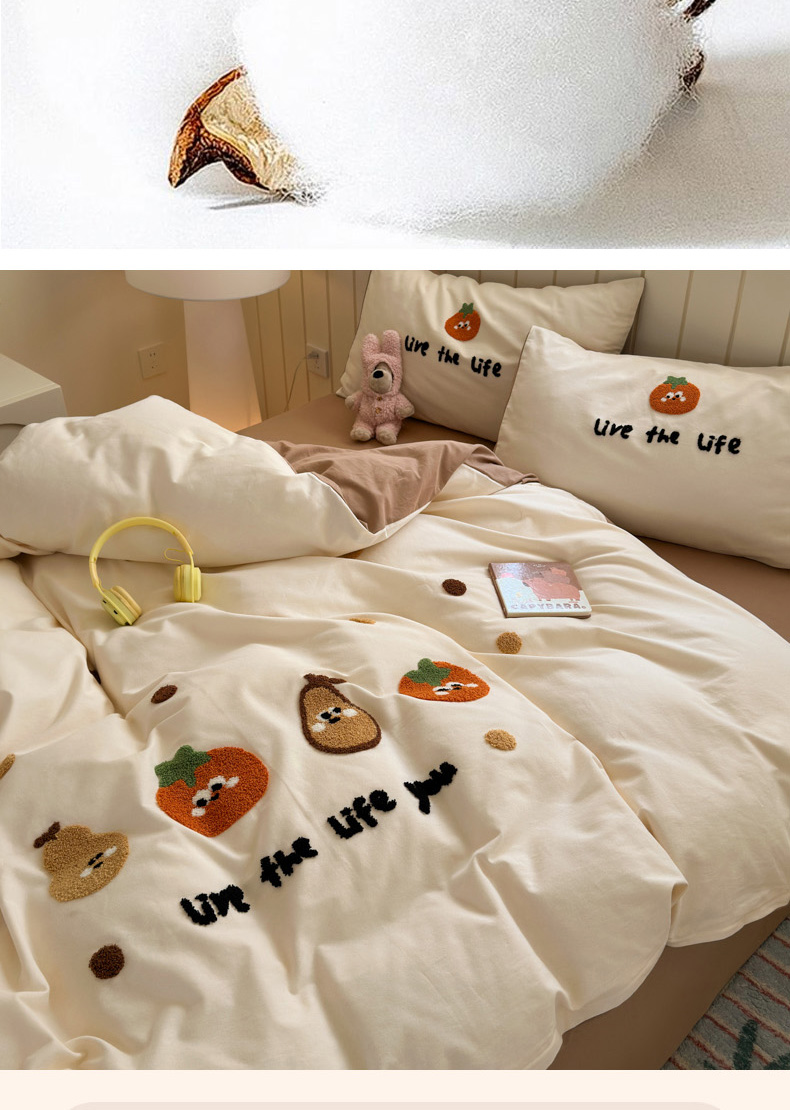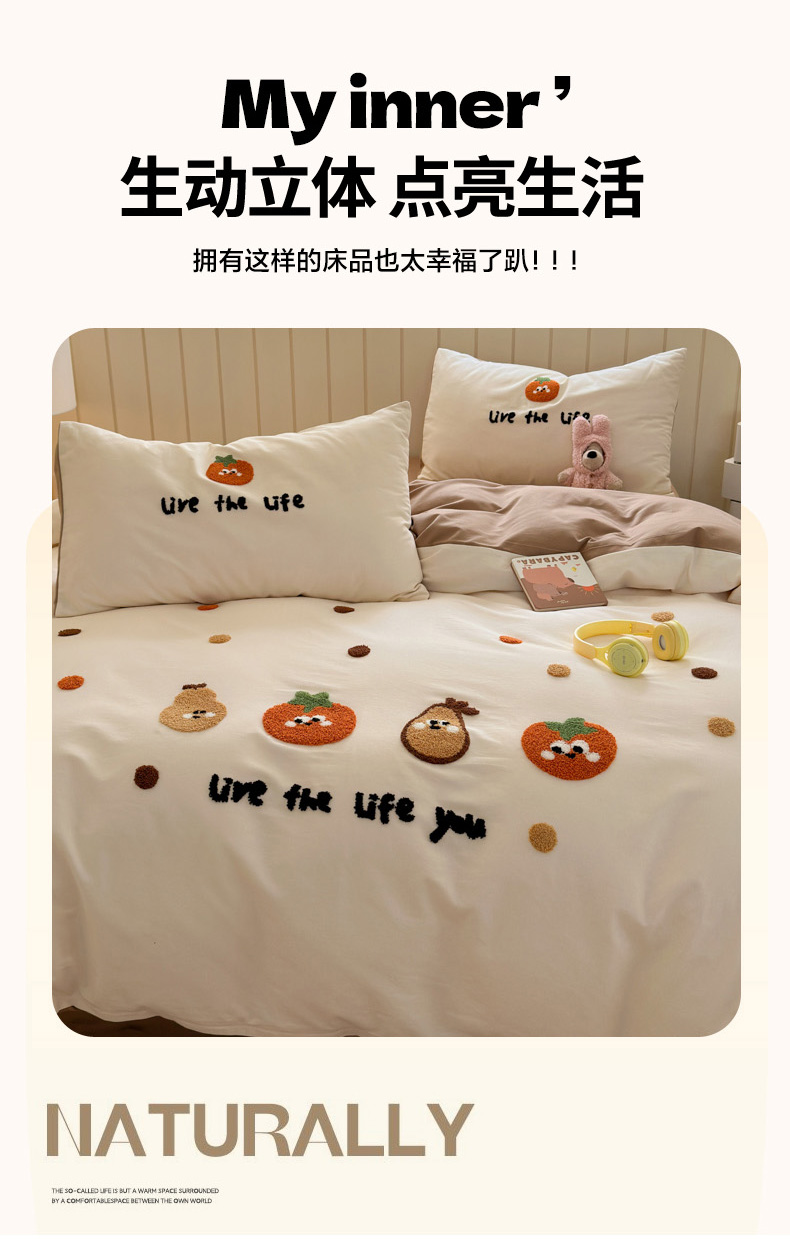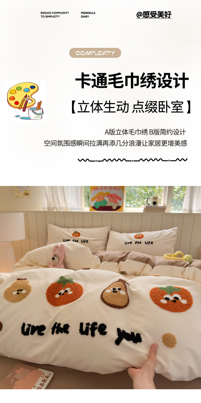 当前位置: 91家纺网 > 商品网购 > 床品套件 > 四件套 > 毛巾绣四件套 > 如意朵 2025新款全棉磨毛卡通毛巾绣四件套(专版花型)-场景二 好柿发生